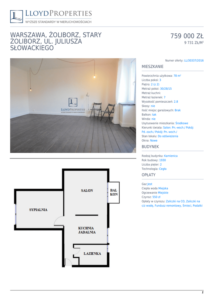 WARSZAWA, ŻOLIBORZ, STARY ŻOLIBORZ, UL. JULIUSZA SŁOWACKIEGO 759 000 ZŁ 9 731 ZŁ/M2 Numer oferty: LL/30337/2016 MIESZKANIE Powierzchnia użytkowa: 78 m2 Liczba pokoi: 3 Piętro: 2 (z 2) Metraż pokoi: 30/28/15 Metraż kuchni: Metraż łazienek: 7 Wysokość pomieszczeń: 2.8 Skosy: nie Ilość miejsc garażowych: Brak Balkon: tak Winda: nie Usytuowanie mieszkania: Środkowe Kierunki świata: Salon: Pn.-wsch./ Pokój: Pd.-zach./ Pokój: Pn.-wsch./ Stan lokalu: Do odświeżenia Okna: Nowe BUDYNEK Rodzaj budynku: Kamienica Rok budowy: 1930 Liczba pięter: 2 Technologia: Cegła OPŁATY Gaz Jest Ciepła woda Miejska Ogrzewanie Miejskie Czynsz: 550 zł Opłaty w czynszu: Zaliczki na CO, Zaliczki na c/z wodę, Fundusz remontowy, Śmieci, Podatki 1 Jakub Bednarek Property Expert +48 533 340 311 [email protected] OPIS Prezentowana nieruchomość to mieszkanie o powierzchni 78 m2 składające się z: - 2 pokoi (30, 28 m2), - pokoju z kuchnią i jadalnią (15 m2), - łazienki z WC (7 m2) oraz - przedpokoju (3 m2). Z salonu, do którego przechodzi się przez część kuchenną można wyjść na balkon (3 m2) od strony ulicy Słowackiego. Zarówno salon, jak i pozostałe pomieszczenia są bardzo ustawne dzięki regularnym kształtom. Aneks kuchenny wyposażony jest w piekarnik, kuchenkę gazową oraz zmywarkę. W łazience znajduje się wanna z deszczownicą, umywalka oraz WC. Na podłodze znajduje się deska drewniana, po części jeszcze oryginalna, po częsci wymieniona, natomiast w łązienke przy wejściu jest terakota. Na ścianach są gładzie gipsowe, a między kuchnią a salonem ściana z oryginalnej cegły w kolorze białym. Ekspozycja okien na południowy-wschód oraz północny-zachód sprawia, że mieszkanie jest jasne i dobrze nasłonecznione. Dzięki jasnym barwom jest ono spójne i przyjemne w odbiorze. W mieszkaniu wymienione zostały wszystkie instalacje: elektryczna, gazowa, wodno-kanalizacyjna oraz grzewcza. Do mieszkania przynależy piwnica (ok. 6 m2), dająca dodatkową przestrzeń na przechowywanie różnych rzeczy. Mieszkanie usytuowane jest na 2 piętrze 5-piętrowej kamienicy z 1930 roku bez windy. Budynek po remoncie - odnowiona elewacja oraz klatki schodowe, wyposażony w domofon, wymienione piony wodno-kanalizacyjne, instalacja elektryczna i gazowa. Otoczenie z licznymi drzewami w pobliżu Parku Imienia Żołnierzy Żywiciela, Skweru Igora Newerlego oraz Sadów Żoliborskich stwarza możliwość do częstych spacerów i wycieczek rowerowych. Dla miłośników dobrej rozrywki w bliskim sąsiedztwie znajduje się Teatr Komedia. Dobrze rozwinięta infrastruktura zaspokoi oczekiwania najbardziej wymagających. W najbliższym sąsiedztwie znajdują się restauracje, winiarnie, kawiarnie, sklepy spożywcze, apteka, poczta i banki. Doskonałe umiejscowienie budynku daje poczucie wielkomiejskości ze względu na bliskość komunikacji miejskiej. Bliskość metra, przystanku tramwajowego oraz autobusowego sprawią, że sprawnie dostaniemy się w każde miejsce Warszawy zarówno za dnia jak i nocą. Dojście do stacji metra Plac Wilsona zajmuje 8 minut, a do metra Marymont 3 minuty. Dojazd do centrum miasta zajmuje 13 minut, do Centrum Handlowego Arkadia 7 minut. Miejsce niezwykłe, z jednej strony bliskość aglomeracji, z drugiej odseparowane od zgiełku i hałasu. Zapraszam na prezentację ! 2