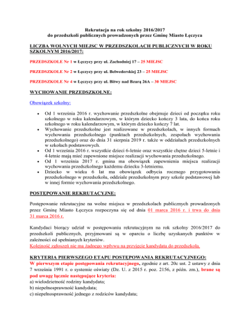 Rekrutacja na rok szkolny 2016/2017 do przedszkoli publicznych prowadzonych przez Gminę Miasto Łęczyca LICZBA WOLNYCH MIEJSC W PRZEDSZKOLACH PUBLICZNYCH W ROKU SZKOLNYM 2016/2017: PRZEDSZKOLE Nr 1 w Łęczycy przy ul. Zachodniej 17 – 25 MIEJSC PRZEDSZKOLE Nr 2 w Łęczycy przy ul. Belwederskiej 23 – 25 MIEJSC PRZEDSZKOLE Nr 4 w Łęczycy przy ul. Bitwy nad Bzurą 26A – 30 MIEJSC WYCHOWANIE PRZEDSZKOLNE: Obowiązek szkolny: Od 1 września 2016 r. wychowanie przedszkolne obejmuje dzieci od początku roku szkolnego w roku kalendarzowym, w którym dziecko kończy 3 lata, do końca roku szkolnego w roku kalendarzowym, w którym dziecko kończy 7 lat. Wychowanie przedszkolne jest realizowane w przedszkolach, w innych formach wychowania przedszkolnego (punktach przedszkolnych, zespołach wychowania przedszkolnego) oraz do dnia 31 sierpnia 2019 r. także w oddziałach przedszkolnych w szkołach podstawowych. Od 1 września 2016 r. wszystkie dzieci 6-letnie oraz wszystkie chętne dzieci 5-letnie i 4-letnie mają mieć zapewnione miejsce realizacji wychowania przedszkolnego. Od 1 września 2017 r. gmina ma obowiązek zapewnienia miejsca realizacji wychowania przedszkolnego każdemu dziecku 3-letniemu. Dziecko w wieku 6 lat ma obowiązek odbycia rocznego przygotowania przedszkolnego w przedszkolu, oddziale przedszkolnym przy szkole podstawowej lub w innej formie wychowania przedszkolnego. POSTĘPOWANIE REKRUTACYJNE: Postępowanie rekrutacyjne na wolne miejsca w przedszkolach publicznych prowadzonych przez Gminę Miasto Łęczyca rozpoczyna się od dnia 01 marca 2016 r. i trwa do dnia 31 marca 2016 r. Kandydaci biorący udział w postępowaniu rekrutacyjnym na rok szkolny 2016/2017 do przedszkoli publicznych, przyjmowani są w oparciu o liczbę uzyskanych punktów w zależności od spełnianych kryteriów. Kolejność zgłoszeń nie ma żadnego wpływu na przyjęcie kandydata do przedszkola. KRYTERIA PIERWSZEGO ETAPU POSTĘPOWANIA REKRUTACYJNEGO: W pierwszym etapie postępowania rekrutacyjnego, zgodnie z art. 20c ust. 2 ustawy z dnia 7 września 1991 r. o systemie oświaty (Dz. U. z 2015 r. poz. 2156, z późn. zm.), brane są pod uwagę łącznie następujące kryteria: a) wielodzietność rodziny kandydata; b) niepełnosprawność kandydata; c) niepełnosprawność jednego z rodziców kandydata; d) niepełnosprawność obojga rodziców kandydata; e) niepełnosprawność rodzeństwa kandydata; f) samotne wychowywanie kandydata w rodzinie; g) objęcie kandydata pieczą zastępczą. Kryteria, o których mowa powyżej, mają jednakową wartość. KRYTERIA DRUGIEGO ETAPU POSTĘPOWANIA REKRUTACYJNEGO: W przypadku równorzędnych wyników uzyskanych w pierwszym etapie postępowania rekrutacyjnego lub jeżeli po zakończeniu tego etapu placówka nadal dysponuje wolnymi miejscami, w drugim etapie postępowania rekrutacyjnego brane są pod uwagę kryteria określone na podstawie Uchwały Nr XXII/118/15 Rady Miejskiej w Łęczycy z dnia 29 grudnia 2015 r. w sprawie ustalenia zasad i kryteriów rekrutacji do publicznych przedszkoli, szkół podstawowych i gimnazjum, dla których organem prowadzącym jest Gmina Miasto Łęczyca: Lp. Kryteria 1. Dziecko obojga rodziców pracujących 2. Dziecko wychowuje się w rodzinie objętej nadzorem kuratorskim lub wsparciem asystenta rodziny 8 3. Dziecko, którego jeden z rodziców pracuje, a drugi rodzic poszukuje pracy Dziecko, którego rodzice są płatnikami podatku od osób fizycznych na rzecz Gminy Miasto Łęczyca Dziecko, którego rodzeństwo uczęszcza do tego przedszkola 6 4. 5. Liczba punktów 10 6 4 3 Dziecko, którego rodzice zamieszkują na terenie miasta Łęczyca Maksymalna liczba punktów możliwa do uzyskania – 37. 6. Dokumenty potwierdzające kryteria Zaświadczenie o zatrudnieniu z zakładu pracy (dla każdego z rodziców), w przypadku samo zatrudnienia - aktualny wpis do ewidencji działalności gospodarczej lub poświadczenie rozliczenia się z ZUS lub Urzędem Skarbowym. Orzeczenie sądu rodzinnego ustanawiającego nadzór kuratora lub zaświadczenie wydane przez MOPS o objęciu rodziny wsparciem asystenta Zaświadczenie z zakładu pracy rodzica pracującego, zaświadczenie z PUP rodzica poszukującego pracy Oświadczenie o odprowadzaniu podatku dochodowego w Gminie Miasto Łęczyca przez rodziców Oświadczenie rodzica Oświadczenie rodzica UWAGA: 1. Dokumenty uprawniające do skorzystania z pierwszeństwa w przyjęciu do danego przedszkola należy dostarczyć do przedszkola razem w wnioskiem. 2. O przyjęciu do przedszkola decyduje liczba punktów, o których mowa powyżej. 3. W przypadku, gdy liczba wniosków, które uzyskały taką sama liczbę punktów przekracza ilość wolnych miejsc w przedszkolach, wnioski podlegają losowaniu, które ustala kolejność przyjęcia do danego przedszkola oraz kolejność na rezerwowej liście dzieci oczekujących na miejsce w przedszkolu. 4. Losowania dokonują rodzice, którzy złożyli wnioski mające taką samą liczbę punktów. HARMONOGRAM CZYNNOŚCI W POSTĘPOWANIU REKRUTACYJNYM I POSTĘPOWANIU UZUPEŁNIAJĄCYM: Harmonogram czynności w postępowaniu rekrutacyjnym i postępowaniu uzupełniającym w roku szkolnym 2016/2017 do przedszkoli publicznych dla których organem prowadzącym jest Gmina Miasto Łęczyca określa Zarządzenie Nr 120.11.2016 Burmistrza Miasta Łęczyca z dnia 25 stycznia 2016 r. w sprawie ustalenia harmonogramu czynności w postępowaniu rekrutacyjnym i postępowaniu uzupełniającym w roku szkolnym 2016/2017 do publicznych przedszkoli oraz publicznych szkół podstawowych dla których organem prowadzącym jest Gmina Miasto Łęczyca. Lp Czynności rekrutacyjne 1. Złożenie wniosku o przyjęcie do przedszkola publicznego wraz z dokumentami potwierdzającymi spełnianie przez kandydata warunków lub kryteriów branych pod uwagę w postępowaniu rekrutacyjnym Weryfikacja przez komisję rekrutacyjną wniosków o przyjęcie do przedszkola publicznego i dokumentów potwierdzaj