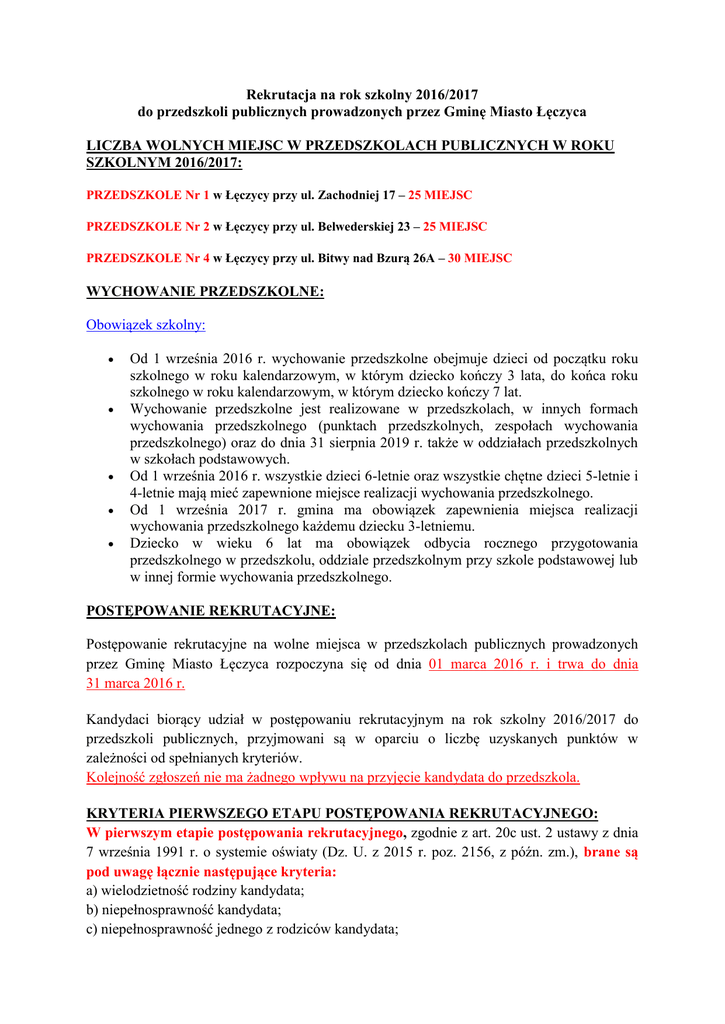 Rekrutacja na rok szkolny 2016/2017 do przedszkoli publicznych