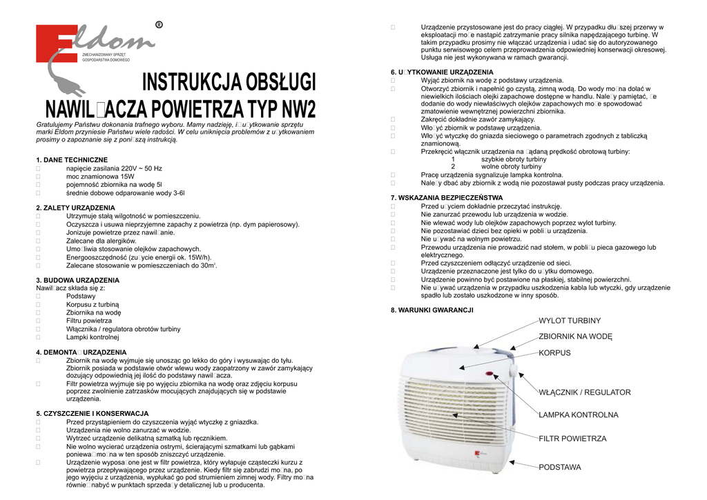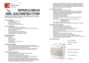 · ZMECHANIZOWANY SPRZĘT GOSPODARSTWA DOMOWEGO INSTRUKCJA OBSŁUGI NAWILŻACZA POWIETRZA TYP NW2 Gratulujemy Państwu dokonania trafnego wyboru. Mamy nadzieję, iż użytkowanie sprzętu marki Eldom przyniesie Państwu wiele radości. W celu uniknięcia problemów z użytkowaniem prosimy o zapoznanie się z poniższą instrukcją. 1. DANE TECHNICZNE · napięcie zasilania 220V ~ 50 Hz · moc znamionowa 15W · pojemność zbiornika na wodę 5l · średnie dobowe odparowanie wody 3-6l 2. ZALETY URZĄDZENIA · Utrzymuje stałą wilgotność w pomieszczeniu. · Oczyszcza i usuwa nieprzyjemne zapachy z powietrza (np. dym papierosowy). · Jonizuje powietrze przez nawilżanie. · Zalecane dla alergików. · Umożliwia stosowanie olejków zapachowych. · Energooszczędność (zużycie energii ok. 15W/h). · Zalecane stosowanie w pomieszczeniach do 30m2. 3. BUDOWA URZĄDZENIA Nawilżacz składa się z: · Podstawy · Korpusu z turbiną · Zbiornika na wodę · Filtru powietrza · Włącznika / regulatora obrotów turbiny · Lampki kontrolnej Urządzenie przystosowane jest do pracy ciągłej. W przypadku dłuższej przerwy w eksploatacji może nastąpić zatrzymanie pracy silnika napędzającego turbinę. W takim przypadku prosimy nie włączać urządzenia i udać się do autoryzowanego punktu serwisowego celem przeprowadzenia odpowiedniej konserwacji okresowej. Usługa nie jest wykonywana w ramach gwarancji. 6. UŻYTKOWANIE URZĄDZENIA · Wyjąć zbiornik na wodę z podstawy urządzenia. · Otworzyć zbiornik i napełnić go czystą, zimną wodą. Do wody można dolać w niewielkich ilościach olejki zapachowe dostępne w handlu. Należy pamiętać, że dodanie do wody niewłaściwych olejków zapachowych może spowodować zmatowienie wewnętrznej powierzchni zbiornika. · Zakręcić dokładnie zawór zamykający. · Włożyć zbiornik w podstawę urządzenia. · Włożyć wtyczkę do gniazda sieciowego o parametrach zgodnych z tabliczką znamionową. · Przekręcić włącznik urządzenia na żądaną prędkość obrotową turbiny: 1 szybkie obroty turbiny 2 wolne obroty turbiny · Pracę urządzenia sygnalizuje lampka kontrolna. · Należy dbać aby zbiornik z wodą nie pozostawał pusty podczas pracy urządzenia. 7. WSKAZANIA BEZPIECZEŃSTWA · Przed użyciem dokładnie przeczytać instrukcję. · Nie zanurzać przewodu lub urządzenia w wodzie. · Nie wlewać wody lub olejków zapachowych poprzez wylot turbiny. · Nie pozostawiać dzieci bez opieki w pobliżu urządzenia. · Nie używać na wolnym powietrzu. · Przewodu urządzenia nie prowadzić nad stołem, w pobliżu pieca gazowego lub elektrycznego. · Przed czyszczeniem odłączyć urządzenie od sieci. · Urządzenie przeznaczone jest tylko do użytku domowego. · Urządzenie powinno być postawione na płaskiej, stabilnej powierzchni. · Nie używać urządzenia w przypadku uszkodzenia kabla lub wtyczki, gdy urządzenie spadło lub zostało uszkodzone w inny sposób. 8. WARUNKI GWARANCJI WYLOT TURBINY ZBIORNIK NA WODĘ 4. DEMONTAŻ URZĄDZENIA · Zbiornik na wodę wyjmuje się unosząc go lekko do góry i wysuwając do tyłu. Zbiornik posiada w podstawie otwór wlewu wody zaopatrzony w zawór zamykający dozujący odpowiednią jej ilość do podstawy nawilżacza. · Filtr powietrza wyjmuje się po wyjęciu zbiornika na wodę oraz zdjęciu korpusu poprzez zwolnienie zatrzasków mocujących znajdujących się w podstawie urządzenia. KORPUS 5. CZYSZCZENIE I KONSERWACJA · Przed przystąpieniem do czyszczenia wyjąć wtyczkę z gniazdka. · Urządzenia nie wolno zanurzać w wodzie. · Wytrzeć urządzenie delikatną szmatką lub ręcznikiem. · Nie wolno wycierać urządzenia ostrymi, ścierającymi szmatkami lub gąbkami ponieważ można w ten sposób zniszczyć urządzenie. · Urządzenie wyposażone jest w filtr powietrza, który wyłapuje cząsteczki kurzu z powietrza przepływającego przez urządzenie. Kiedy filtr się zabrudzi można, po jego wyjęciu z urządzenia, wypłukać go pod strumieniem zimnej wody. Filtry można również nabyć w punktach sprzedaży detalicznej lub u producenta. LAMPKA KONTROLNA WŁĄCZNIK / REGULATOR FILTR POWIETRZA PODSTAWA