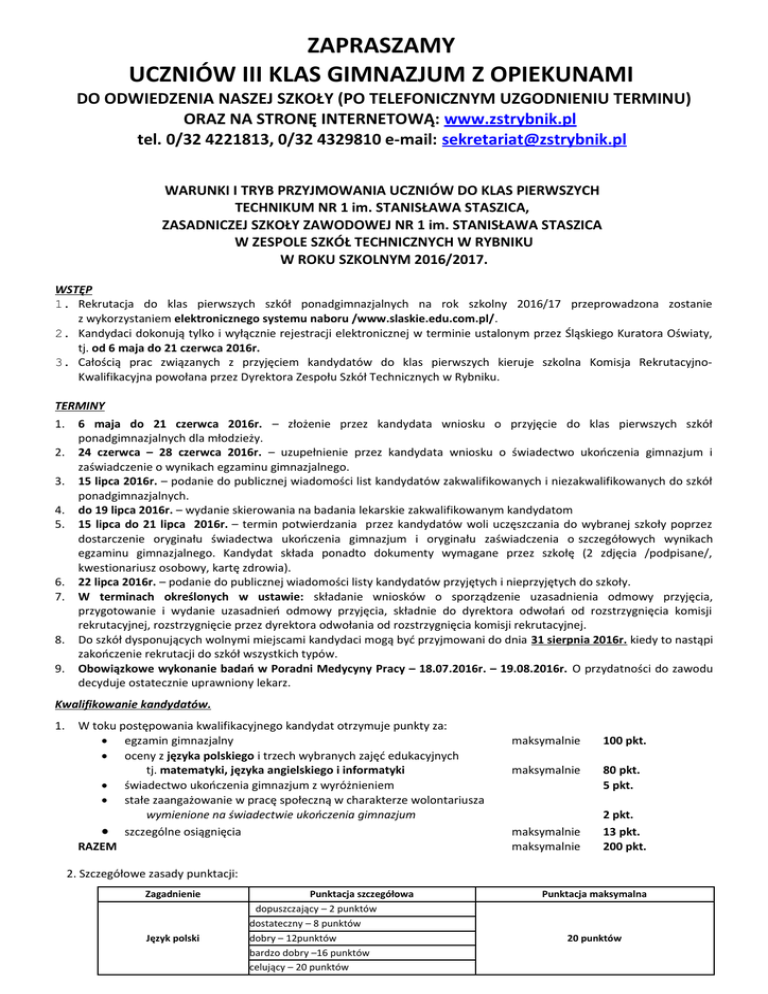 ZAPRASZAMY UCZNIÓW III KLAS GIMNAZJUM Z OPIEKUNAMI DO ODWIEDZENIA NASZEJ SZKOŁY (PO TELEFONICZNYM UZGODNIENIU TERMINU) ORAZ NA STRONĘ INTERNETOWĄ: www.zstrybnik.pl tel. 0/32 4221813, 0/32 4329810 e-mail: [email protected] WARUNKI I TRYB PRZYJMOWANIA UCZNIÓW DO KLAS PIERWSZYCH TECHNIKUM NR 1 im. STANISŁAWA STASZICA, ZASADNICZEJ SZKOŁY ZAWODOWEJ NR 1 im. STANISŁAWA STASZICA W ZESPOLE SZKÓŁ TECHNICZNYCH W RYBNIKU W ROKU SZKOLNYM 2016/2017. WSTĘP 1. Rekrutacja do klas pierwszych szkół ponadgimnazjalnych na rok szkolny 2016/17 przeprowadzona zostanie z wykorzystaniem elektronicznego systemu naboru /www.slaskie.edu.com.pl/. 2. Kandydaci dokonują tylko i wyłącznie rejestracji elektronicznej w terminie ustalonym przez Śląskiego Kuratora Oświaty, tj. od 6 maja do 21 czerwca 2016r. 3. Całością prac związanych z przyjęciem kandydatów do klas pierwszych kieruje szkolna Komisja RekrutacyjnoKwalifikacyjna powołana przez Dyrektora Zespołu Szkół Technicznych w Rybniku. TERMINY 1. 2. 3. 4. 5. 6. 7. 8. 9. 6 maja do 21 czerwca 2016r. – złożenie przez kandydata wniosku o przyjęcie do klas pierwszych szkół ponadgimnazjalnych dla młodzieży. 24 czerwca – 28 czerwca 2016r. – uzupełnienie przez kandydata wniosku o świadectwo ukończenia gimnazjum i zaświadczenie o wynikach egzaminu gimnazjalnego. 15 lipca 2016r. – podanie do publicznej wiadomości list kandydatów zakwalifikowanych i niezakwalifikowanych do szkół ponadgimnazjalnych. do 19 lipca 2016r. – wydanie skierowania na badania lekarskie zakwalifikowanym kandydatom 15 lipca do 21 lipca 2016r. – termin potwierdzania przez kandydatów woli uczęszczania do wybranej szkoły poprzez dostarczenie oryginału świadectwa ukończenia gimnazjum i oryginału zaświadczenia o szczegółowych wynikach egzaminu gimnazjalnego. Kandydat składa ponadto dokumenty wymagane przez szkołę (2 zdjęcia /podpisane/, kwestionariusz osobowy, kartę zdrowia). 22 lipca 2016r. – podanie do publicznej wiadomości listy kandydatów przyjętych i nieprzyjętych do szkoły. W terminach określonych w ustawie: składanie wniosków o sporządzenie uzasadnienia odmowy przyjęcia, przygotowanie i wydanie uzasadnień odmowy przyjęcia, składnie do dyrektora odwołań od rozstrzygnięcia komisji rekrutacyjnej, rozstrzygnięcie przez dyrektora odwołania od rozstrzygnięcia komisji rekrutacyjnej. Do szkół dysponujących wolnymi miejscami kandydaci mogą być przyjmowani do dnia 31 sierpnia 2016r. kiedy to nastąpi zakończenie rekrutacji do szkół wszystkich typów. Obowiązkowe wykonanie badań w Poradni Medycyny Pracy – 18.07.2016r. – 19.08.2016r. O przydatności do zawodu decyduje ostatecznie uprawniony lekarz. Kwalifikowanie kandydatów. 1. W toku postępowania kwalifikacyjnego kandydat otrzymuje punkty za: egzamin gimnazjalny oceny z języka polskiego i trzech wybranych zajęć edukacyjnych tj. matematyki, języka angielskiego i informatyki świadectwo ukończenia gimnazjum z wyróżnieniem stałe zaangażowanie w pracę społeczną w charakterze wolontariusza wymienione na świadectwie ukończenia gimnazjum szczególne osiągnięcia RAZEM maksymalnie 100 pkt. maksymalnie 80 pkt. 5 pkt. maksymalnie maksymalnie 2 pkt. 13 pkt. 200 pkt. 2. Szczegółowe zasady punktacji: Zagadnienie Język polski Punktacja szczegółowa dopuszczający – 2 punktów dostateczny – 8 punktów dobry – 12punktów bardzo dobry –16 punktów celujący – 20 punktów Punktacja maksymalna 20 punktów Matematyka jak w przypadku języka polskiego Język angielski jak w przypadku języka polskiego Informatyka jak w przypadku języka polskiego Świadectwo ukończenia gimnazjum z wyróżnieniem 20 punktów 20 punktów 20 punktów 5 punktów Uzyskanie w zawodach wiedzy będących konkursem o zasięgu ponadwojewódzkim organizowanym przez kuratorów oświaty na podstawie zawartych porozumień: a) tytułu finalisty konkursu przedmiotowego – przyznaje się 10 punktów, b) tytułu laureata konkursu tematycznego lub interdyscyplinarnego – przyznaje się 7p, c) tytułu finalisty konkursu tematycznego lub interdyscyplinarnego – przyznaje się 5p; Uzyskanie w zawodach wiedzy będących konkursem o zasięgu międzynarodowym lub ogólnopolskim albo turniejem o zasięgu ogólnopolskim, przeprowadzanymi zgodnie z przepisami wydanymi na podstawie art. 32a ust. 4 i art. 22ust. 2 pkt 8 ustawy: a) tytułu finalisty konkursu z przedmiotu lub przedmiotów artystycznych objętych ramowym planem nauczania szkoły artystycznej – przyznaje się 10 punktów, b) tytułu laureata turnieju z przedmiotu lub przedmiotów artystycznych nieobjętych ramowym planem nauczania szkoły artystycznej – przyznaje się 4 punkty, c) tytułu finalisty turnieju z przedmiotu lub przedmiotów artystycznych nieobjętych ramowym planem nauczania szkoły artystycznej – przyznaje się 3 punkty; Uzyskanie w zawodach wiedzy będących konkursem o zasięgu wojewódzkim organizowanym przez kuratora oświaty: a) dwóch lub więcej tytułów finalisty konkursu przedmiotowego – przyznaje się 10p, b) dwóch lub więcej tytułów laureata konkursu tematycznego lub interdyscyplinarnego – przyznaje się 7 punktów, c) dwóch lub więcej tytułów finalisty konkursu tematycznego lub interdyscyplinarnego – przyznaje się 5 punktów, d) tytułu finalisty konkursu przedmiotowego – przyznaje się 7 punktów, e) tytułu laureata konkursu tematycznego lub interdyscyplinarnego – przyznaje się 5p, f) tytułu finalisty konkursu tematycznego lub interdyscyplinarnego – przyznaje się 3p; 13 punktów Uzyskanie w zawodach wiedzy będących konkursem albo turniejem, o zasięgu ponadwojewódzkim lub wojewódzkim, przeprowadzanymi zgodnie z przepisami wydanymi na podstawie art. 32a ust. 4 i art. 22 ust. 2 pkt 8 ustawy: a) dwóch lub więcej tytułów finalisty konkursu z przedmiotu lub przedmiotów artystycznych objętych ramowym planem nauczania szkoły artystycznej – przyznaje się 10 punktów, b)