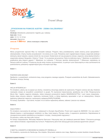 Travel Shop „ZFIKSOWANI NA PUNKCIE AUSTRII - ZIEMIA SALZBURSKA” Austria Atrakcje: Zwiedzanie, plażowanie i kąpiele, gry i zabawy ilość dni: 10 dni wiek: 10-14; 14-18 lat kierunek: Zagranica cena od: 1 990 PLN (Oferta niedostępna w Mybenefit) Program Mamy przyjemność zaprosić Was na niezwykłe wakacje. Program, który przedstawiamy został ułożony przez specjalistów i obieżyświatów. Znamy Austrię od podszewki i nie wiemy co to nuda. Pokażemy wam najpiękniejsze miejsca, wspaniałe atrakcje i dołożymy starań abyście, zawsze chcieli do nas wracać. Dostaniecie od nas pozytywne emocje, wsparcie, dużą dawkę śmiechu i wspaniałej zabawy! Geografia i Historia ? Nudy ? A co powiesz jak powiemy Tobie że dotkniesz tęczy ? Zjedziesz na zjeżdżalni z prędkością jaką biegnie gepard ? Wjedziesz na Lodowiec ? Doznasz sportów ekstremalnych ? Zobaczysz największą na Świecie jaskinie Lodową ? Przekonaj się jak wiele możesz się dowiedzieć, na pełnym luzie! Zaszczepimy w was zamiłowanie do podróżowania, pokażemy najpiękniejsze góry w Europie czyli Alpy. Dzień 1 : PODRÓŻ CZAS ZACZĄĆ! Spotkanie z uczestnikami, omówienie trasy, oraz programu naszego wyjazdu. Przejazd uczestników do Austrii. Zakwaterowanie. Powitanie, kolacja, Nocleg. Dzień 2 AKCJA-INTEGRACJA ! Po śniadaniu udamy się na spacer po okolicy. Uczestnicy otrzymają zadania do wykonania. Program ułożony tak aby młodzież, nawiązała relacje ze wszystkimi uczestnikami w grupie. Po wycieczce krajoznawczej, spotykamy się w Sali. Rozpoczynamy Movie Star ! będzie nagranie teledysku, której motywem przewodnim będzie WAGRAIN/HUTTAU ! czyli nasza miejscówka . Każda ekipa otrzyma zadanie i będziemy montować filmiki, w której będziemy opowiadać o tym co zobaczyliśmy. Kolejno będziemy odtwarzać nagrania i wylosujemy najlepszą EKIPĘ FILMOWĄ. Po kolacji, Dyskoteka – czyli tańce, muzyka i to co lubicie najbardziej zabawa, zabawa i jeszcze raz zabawa. Dzień 3 AQUA PARK I! Po śniadaniu wyruszamy do jednego z najlepszych w Europie AquaParków. Przed nami wypad do AMANDE ! Co nas czeka ? Otwarte baseny z zachwycającym widokiem na Alpy, kryte baseny, Płynąca rzeka, 4 wypasione zjeżdżalnie. Najciekawsza to niezapomniana podróż zjeżdżalnią ze światłami i muzyką . Uważaj jesteś nagrywany ! Po południu, czeka nas mecz piłki nożnej ! Po kolacji niespodzianka. Warsztaty Akademia Geniusza ! Nauczymy was, jak zwiększyć pewność Siebie ! Ćwiczenia pomogą wam nabrać śmiałości, wypowiadać się na forum. Podpowiemy jakie tricki stosują geniusze podczas egzaminów ustnych ! Dzień 4 Z WIZYTĄ U MOZARTA Z WIDOKIEM NA SAMOLOTY REDBULLA Po śniadaniu, wycieczka do Salzburga. Gra miejska. Otrzymacie zadania oraz mapy. Będziemy szukać skarbów miasta Mozarta. Wygenerowane w systemie TravelShop 1/4 04-03-2017 09:10:02 Zobaczycie perły architektury oraz poznacie historię tego bajecznego miasta. Pokażemy wam najpiękniejsze miejsca ( m.in. Twierdza Hohensalzburg, Stare Miasto, Opactwo Św. Piotra, Katedra św. Ruperta, Dom w którym urodził się Wolfgang Amadeusz Mozart - jedno z najczęściej odwiedzanych muzeów na Świecie). Po południu udamy się fantastyczne unikatowe miejsce Hangar 7. Wewnątrz zobaczymy najbardziej odlotowe maszyny ekstremalnych pokazów Redbulla ! Jest to miejsca, które musisz zobaczyć. Samolotowy zawrót głowy ! Co roku zjeżdżają się tutaj mistrzowie akrobacji powietrznych, gwiazdy oraz fani ekstremalnych sportów z całego świata ! Dzień 5 DOTKNIJ TĘCZY W NAJDŁUŻSZYM WĄWOZIE W ALPACH ! Po śniadaniu wyruszymy w podróż do Krainy Liechtensteinklamm wysokich gór, gdzie złowrogo rozbrzmiewa ryk potężnego wodospadu. Pośród mchów zawieszone wysoko kładki, kryją tajemnice i magiczne legendy. Będziemy zwiedzać niezwykły świat zamknięty wewnątrz potężnej góry. Spacerując po wąwozie zobaczymy niezwykłe zjawisko tęcze powstałe w wyniku spadającej wody. Podróż i widoki zachwycą każdego ! Wieczorem grill i Karaoke. Uwaga będziemy śpiewać po Niemiecku ! Dzień 6 SPORTOWA SZTAFETA Po śniadaniu, czeka nas szereg wyzwań! Sztafeta ! Dzisiaj odbędą się całodzienne zawody sportowe : (m.in. mecz siatkówki, gra w zbijanego) Po obiedzie udamy się na podchody. Wieczorem będziemy upodobniać się do najsłynniejszych Austriaków. Będzie teatr, muzyka i wspaniała zabawa. Dzień 7 CELTYCKA PRZYGODA -PODRÓŻ KORYTARZAMI W LODOWYCH JASKINIACH PEŁNYCH SKARBÓWSKOK DO NIEBA ! Pływanie w jaskini w otoczeniu światła i muzyki ? Kim byli Celtowie ? Jakich instrumentów używali ? Jaka temperatura jest w jaskini ? Dzisiaj czeka nas podróż niezwykła, pełna wspaniałej historii i zagadek do Kopalni soli. Kolejno udamy się do Jaskini Lodu. Będziemy niczym Hobbici przemierzać największą na Świcie jaskinie lodową ! Podziemne korytarze, zachwycające miejsca. Widoki was zaskoczą ! Po południu, udamy się na zwiedzanie skoczni narciarskiej. Wiesz ile metrów ma taka skocznia ? Jak się Tobie wydaje o czym myśli skoczek kiedy stoi 500 metrów nad Ziemią ? Jak wygląda trening mistrzów ? tego i innych ciekawostek dowiesz się zwiedzając skocznię w Bischofshofen. Dzień 8 WIELKA APLEJSKA KRAINA LODU ! Dzisiejszego dnia czeka na nas największa atrakcja. Wycieczka drogą wysoko alpejską na Lodowiec Grossglockner ( 3798 m. n.p.m ), który jest najwyższym szczytem w Austrii. Z czego składa się lodowiec, na pewno tylko z lodu ? Dlaczego nie topnieje ? Jakie zwierzęta i rośliny żyją tak wysoko ? Będziesz zaskoczony jak wiele pytań narodzi się w Twojej głowie. Zobaczysz zachwycającą naturę, prawdziwy skarb Alp ! Poznasz fascynujący Świat wiecznego lodu. Na miejscu znajduje się centrum turystyczne (ścieżki edukacyjne, mapki, panoramiczna sala, wystawy multimedialne). Wieczorem po kolacji na boisku bitwa balonowa ! Oj będzie się działo Dzień 9 NAJDŁUŻSZY WODOSPAD! Dzisiaj czeka nas niezwykł