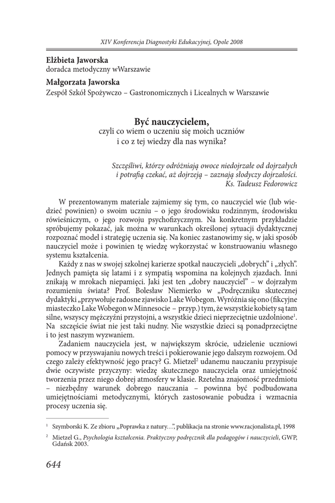 XIV Konferencja Diagnostyki Edukacyjnej, Opole 2008 Elżbieta Jaworska doradca metodyczny wWarszawie Małgorzata Jaworska Zespół Szkół Spożywczo – Gastronomicznych i Licealnych w Warszawie Być nauczycielem, czyli co wiem o uczeniu się moich uczniów i co z tej wiedzy dla nas wynika? Szczęśliwi, którzy odróżniają owoce niedojrzałe od dojrzałych i potrafią czekać, aż dojrzeją – zaznają słodyczy dojrzałości. Ks. Tadeusz Fedorowicz W prezentowanym materiale zajmiemy się tym, co nauczyciel wie (lub wiedzieć powinien) o swoim uczniu – o jego środowisku rodzinnym, środowisku rówieśniczym, o jego rozwoju psychofizycznym. Na konkretnym przykładzie spróbujemy pokazać, jak można w warunkach określonej sytuacji dydaktycznej rozpoznać model i strategię uczenia się. Na koniec zastanowimy się, w jaki sposób nauczyciel może i powinien tę wiedzę wykorzystać w konstruowaniu własnego systemu kształcenia. Każdy z nas w swojej szkolnej karierze spotkał nauczycieli „dobrych” i „złych”. Jednych pamięta się latami i z sympatią wspomina na kolejnych zjazdach. Inni znikają w mrokach niepamięci. Jaki jest ten „dobry nauczyciel” – w dojrzałym rozumieniu świata? Prof. Bolesław Niemierko w „Podręczniku skutecznej dydaktyki „przywołuje radosne zjawisko Lake Wobegon. Wyróżnia się ono (fikcyjne miasteczko Lake Wobegon w Minnesocie – przyp.) tym, że wszystkie kobiety są tam silne, wszyscy mężczyźni przystojni, a wszystkie dzieci nieprzeciętnie uzdolnione1. Na szczęście świat nie jest taki nudny. Nie wszystkie dzieci są ponadprzeciętne i to jest naszym wyzwaniem. Zadaniem nauczyciela jest, w największym skrócie, udzielenie uczniowi pomocy w przyswajaniu nowych treści i pokierowanie jego dalszym rozwojem. Od czego zależy efektywność jego pracy? G. Mietzel2 udanemu nauczaniu przypisuje dwie oczywiste przyczyny: wiedzę skutecznego nauczyciela oraz umiejętność tworzenia przez niego dobrej atmosfery w klasie. Rzetelna znajomość przedmiotu – niezbędny warunek dobrego nauczania – powinna być podbudowana umiejętnościami metodycznymi, których zastosowanie pobudza i wzmacnia procesy uczenia się. 1 Szymborski K. Ze zbioru „Poprawka z natury…”, publikacja na stronie www.racjonalista.pl, 1998 Mietzel G., Psychologia kształcenia. Praktyczny podręcznik dla pedagogów i nauczycieli, GWP, Gdańsk 2003. 2 644 Uczenie się i egzamin w oczach nauczyciela Konstruktywizm, współczesny kierunek edukacji, czerpie ze zdobyczy psychologii poznawczej. Teoria poznawczo-konstruktywistyczna3 za J. Piagetem przyjmuje, że uczniowie w każdym wieku aktywnie uczestniczą w procesie konstruowania swojej wiedzy. Według Piageta, każde dziecko przechodzi przez poszczególne stadia rozwojowe niezależnie od warunków społeczno-kulturowych. Lew Wygodski większą uwagę przywiązuje do społecznego aktu uczenia się i uważa, że „uczenie się zachodzi w trakcie społecznych interakcji z nauczycielem i rówieśnikami.” Natomiast John Dewley uważał, że w procesie uczenia się ważne jest bezpośrednie doświadczenie. Nasze własne, nauczycielskie doświadczenia pozwalają intuicyjnie korzystać ze wszystkich przywołanych tu teorii. Dydaktyka współczesna, zbadana i zwerbalizowana, czerpie z tego bogatego, różnorodnego dorobku. Uczenie się jest nie tylko procesem zdobywania wiedzy, ale także procesem doświadczania i zdobywania nowych umiejętności. Jest procesem, w którym kształtuje się osobowość człowieka. Uczenie się jest wszechstronnym i skomplikowanym rodzajem ludzkiej działalności. „Skomplikowane są także czynniki decydujące o sukcesach lub niepowodzeniach w uczeniu się.”4 Jakiej wiedzy o uczniu oczekujemy? Nauczyciel chce wiedzieć, jaką drogą idzie uczeń w zdobywaniu wiedzy i z jakich technik korzysta. Wiedza i doświadczenie pozwalają na wyodrębnienie różnych dróg uczenia się. Modele uczenia się przedstawia tabela 15. Tabela 1. Cztery modele uczenia się przedmiotów ogólnokształcących Nazwa Konstrukcja Droga uczenia się Główna czynność Alfa od wiadomości teoretycznych do umiejętności praktycznych przez przyswajanie (opisywanie) poznawanie pojęć Beta od wiadomości praktycznych do umiejętności teoretycznych przez działanie (normowanie) próbne działanie Gamma od umiejętności teoretycznych do wiadomości praktycznych przez odkrywanie (wyjaśnianie) rozwiązywanie problemów Delta od umiejętności praktycznych do wiadomości teoretycznych przez przeżywanie (ocenianie) naprawianie świata Arends R.I., Uczymy się nauczać, WSiP, Warszawa 1994, s. 377 – 378. 3 Sękowska Z., Wprowadzenie do pedagogiki specjalnej, Warszawa 1998, s. 305. 4 Niemierko B., Kształcenie szkolne. Podręcznik skutecznej dydaktyki, Wydawnictwa Akademickie i Profesjonalne, WSiP, Warszawa 2007. 5 645 XIV Konferencja Diagnostyki Edukacyjnej, Opole 2008 Z cechami charakterologicznymi ucznia, z jego osobowością związane są techniki i sposoby realizacji drogi uczenia się. Strategie uczenia się zdefiniował R. I. Arends:6 „strategie uczenia się są to czynności i procesy poznawcze ucznia warunkujące, jaki będzie efekt uczenia się (…).” Tabela 2. Cztery rodzaje strategii poznawczych Strategia Definicja Przykład Powtarzania zapamiętywanie materiału przez jego powtarzanie powtarzanie nieznanego wcześniej numeru telefonu Opracowywania dodawanie szczegółów do nowych informacji i tworzenie skojarzeń Organizowania reorganizowanie lub wybieranie głównych myśli z większych porcji informacji techniki mnemoniczne i dodawanie szczegółów wiążących numer telefonu z datą urodzenia „spis treści”, mnemotechniki, mapy poznawcze Metapoznawcza myślenie o myśleniu i monitorowanie postępu procesów poznawczych zdecydowanie, że najlepszą strategią nauczenia się wiedzy zawartej w tekście jest „spis treści” A oto czego się dowiedzieliśmy… Celem przeprowadzonych bada