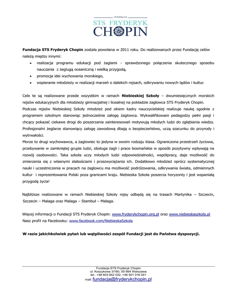 Fundacja STS Fryderyk Chopin została powołana w 2011 roku. Do realizowanych przez Fundację celów należą między innymi: realizacja programu edukacji pod żaglami - sprawdzonego połączenia skutecznego sposobu nauczania z żeglugą oceaniczną i wielką przygodą, promocja idei wychowania morskiego, wspieranie młodzieży w realizacji marzeń o dalekich rejsach, odkrywaniu nowych lądów i kultur. Cele te są realizowane przede wszystkim w ramach Niebieskiej Szkoły – dwumiesięcznych morskich rejsów edukacyjnych dla młodzieży gimnazjalnej i licealnej na pokładzie żaglowca STS Fryderyk Chopin. Podczas rejsów Niebieskiej Szkoły młodzież pod okiem kadry nauczycielskiej realizuje naukę zgodnie z programem szkolnym stanowiąc jednocześnie załogę żaglowca. Wykwalifikowani pedagodzy pełni pasji i chcący pokazać ciekawe drogi do poszerzania zainteresowań motywują młodych ludzi do zgłębiania wiedzy. Profesjonalni żeglarze stanowiący załogę zawodową dbają o bezpieczeństwo, uczą szacunku do przyrody i wytrwałości. Morze to drugi wychowawca, a żaglowiec to jedyna w swoim rodzaju klasa. Ograniczona przestrzeń życiowa, przebywanie w zamkniętej grupie ludzi, obsługa żagli i prace bosmańskie w sposób pozytywny wpływają na rozwój osobowości. Taka szkoła uczy młodych ludzi odpowiedzialności, współpracy, daje możliwość do zmierzenia się z własnymi słabościami i przezwyciężania ich. Dodatkowo młodzież oprócz systematycznej nauki i uczestniczenia w pracach na żaglowcu ma możliwość podróżowania, odkrywania świata, odmiennych kultur i reprezentowania Polski poza granicami kraju. Niebieska Szkoła poszerza horyzonty i jest wspaniałą przygodą życia! Najbliższe realizowane w ramach Niebieskiej Szkoły rejsy odbędą się na trasach Martynika – Szczecin, Szczecin – Malaga oraz Malaga – Stambuł – Malaga. Więcej informacji o Fundacji STS Fryderyk Chopin: www.fryderykchopin.org.pl oraz www.niebieskaszkola.pl Nasz profil na Facebooku: www.facebook.com/NiebieskaSzkola W razie jakichkolwiek pytań lub wątpliwości zespół Fundacji jest do Państwa dyspozycji. Fundacja STS Fryderyk Chopin ul. Koszykowa 3/160, 00-564 Warszawa tel.: +48 603 842 032, +48 501 016 041 mail: [email protected]