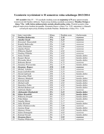 Uczniowie wyróżnieni w II semestrze roku szkolnego 2013/2014 103 uczniów klas IV – VI uzyskało średnią ocen co najmniej 4,75 przy sprawowaniu wzorowym lub bardzo dobrym. Najwyższą średnią uzyskała uczennica: Monika Ociepa z klasy VIa: 6,00, która jednocześnie została absolwentką roku. Pośród uczniów klas piątych najwyższa średnia przypadła: Zuzannie Karcz z klasy Va: 5,92, natomiast w klasach czwartych najwyższą średnią uzyskała Paulina Bednarska z klasy IVa - 5,58. Lp. 1. 2. 3. 4. 5. 6. 7. 8. 9. 10. 11. 12. 13. 14. 15. 16. 17. 18. 19. 20. 21. 22. 23. 24. 25. 26. 27. 28. 29. 30. 31. 32. 33. 34. 35. 36. 37. Imię i nazwisko Paulina Bednarska Amelia Ciszek Krzysztof Dyaczyński Kamila Bełtowska Julia Ormianin Amelia Potym Wiktoria Dudzik Paulina Pilińska Sonia Świtała Kacper Baran Weronika Mech Roksana Baran Zuzanna Przeworska Zuzanna Rogacz Michał Lekstan Łucja Ludwikowska Dawid Jędrusik Marcelina Wink Mateusz Madejski Konrad Jasik Michał Lalik Stanisław Polko Michał Bednarczyk Gabriela Hader Aleksander Dziekański Oskar Kowalski Wiktoria Dwojak Filip Kiljan Natalia Sikora Julia Woźniak Julia Chomiczewska Justyna Knap Mateusz Ornat Edyta Domagała Konrad Nowak Zuzanna Karcz Paulina Widawska Klasa IVa IVa IVa IVa IVa IVa IVa IVa IVa IVa IVa IVa IVa IVb IVb IVb IVb IVb IVb IVb IVb IVb IVb IVb IVc IVc IVc IVc IVc IVc IVc IVc IVc IVc IVc Va Va Średnia ocen 5,58 5,42 5,25 5,08 5,08 5,0 4,92 4,92 4,92 4,83 4,83 4,75 4,75 5,50 5,25 5,25 5,16 5,16 5,08 5,00 4,92 4,92 4,75 4,75 5,25 5,25 5,17 5,17 5,17 5,17 5,00 5,00 4,92 4,83 4,75 5,92 5,58 Zachowanie wzorowe wzorowe wzorowe wzorowe wzorowe wzorowe wzorowe wzorowe bardzo dobre bardzo dobre bardzo dobre wzorowe bardzo dobre wzorowe wzorowe wzorowe bardzo dobre wzorowe bardzo dobre bardzo dobre bardzo dobre bardzo dobre bardzo dobre wzorowe bardzo dobre bardzo dobre bardzo dobre bardzo dobre wzorowe bardzo dobre wzorowe bardzo dobre bardzo dobre wzorowe bardzo dobre wzorowe wzorowe 38. 39. 40. 41. 42. 43. 44. 45. 46. 47. 48. 49. 50. 51. 52. 53. 54. 55. 56. 57. 58. 59. 60. 61. 62. 63. 64. 65. 66. 67. 68. 69. 70. 71. 72. 73. 74. 75. 76. 77. 78. 79. 80. 81. 82. 83. 84. 85. Zuzanna Kuzior Mateusz Grzyb Norbert Luchowski Julia Grabowska Julia Pałka Patryk Kamiński Adam Wróbel Wiktoria Bierońska Oskar Podraza Sylwia Brożyna Alicja Bukała Filip Kowalski Dominik Nanuś Anna Ozga Jakub Polko Natalia Latacz Weronika Wiącek Aleksandra Rekosz Maksymilian Majka Patrycja Gala Paweł Ogonowski Mateusz Cieślikiewicz Jakub Tomczewski Wiktoria Kułak Wiktoria Szewczyk Sandra Niemiec Weronika Olszowy Wiktoria Plaskota Monika Ociepa Zuzanna Kocel Michał Orłowski Zuzanna Mika Jarosław Roznowski Dawid Maziarski Piotr Kulon Olaf Ples Krzysztof Łysak Wiktor Rzeszutek Kacper Więcek Martyna Szczepanik Mateusz Błażkiewicz Maja Skóbel Szymon Jaszczura Wiktoria Paulus Jakub Radomski Wiktoria Spólnik Damian Brodowski Natalia Jackiewicz Va Va Va Va Va Va Va Va Va Va Va Va Va Va Vb Vb Vb Vb Vb Vb Vb Vb Vc Vc Vc Vc Vc Vc VIa VIa VIa VIa VIa VIa VIa VIa VIa VIa VIa VIb VIb VIb VIb VIb VIb VIb VIb VIb 5,50 5,42 5,36 5,25 5,08 5,00 5,00 4,92 4,92 4,75 4,75 4,75 4,75 4,75 5,42 5,33 5,25 5,17 5,08 5,00 5,00 4,83 5,33 5,00 5,00 4,92 4,83 4,75 6,00 5,75 5,45 5,42 5,42 5,00 4,92 4,92 4,92 4,82 4,75 5,58 5,50 5,50 5,41 5,33 5,33 5,16 5,00 5,00 wzorowe wzorowe wzorowe wzorowe wzorowe wzorowe bardzo dobre wzorowe wzorowe bardzo dobre wzorowe bardzo dobre wzorowe wzorowe wzorowe wzorowe wzorowe wzorowe wzorowe wzorowe wzorowe bardzo dobre wzorowe wzorowe wzorowe wzorowe wzorowe wzorowe wzorowe wzorowe wzorowe wzorowe wzorowe wzorowe wzorowe bardzo dobre bardzo dobre wzorowe bardzo dobre wzorowe bardzo dobre wzorowe wzorowe wzorowe wzorowe wzorowe bardzo dobre wzorowe 86. 87. 88. 89. 90. 91. 92. 93. 94 95. 96. 97. 98. 99. 100. 101. 102. 103. Iga Sudak Olga Kubińska Tymoteusz Kisiel Anna Zaporowska Jakub Solipiwko Łukasz Kowalczyk Natalia Lepiarz Katarzyna Rubaj Paweł Krawczyk Kacper Bałdys Aleksandra Bukała Filip Ciś Szymon Sadowski Krzysztof Świtała Paulina Janoszka Krzysztof Kapkowski Konrad Puchała Beata Zawiązalec VIb VIb VIb VIb VIb VIb VIc VIc VIc VIc VIc VIc VIc VIc VIc VIc VIc VIc 5,00 4,92 4,83 4,83 4,75 4,75 5,33 5,33 5,17 5,0 5,0 5,0 4,92 4,92 4,75 7,75 4,75 4,75 wzorowe wzorowe wzorowe wzorowe wzorowe wzorowe wzorowe wzorowe bardzo dobre bardzo dobre wzorowe bardzo dobre bardzo dobre bardzo dobre bardzo dobre bardzo dobre wzorowe bardzo dobre
