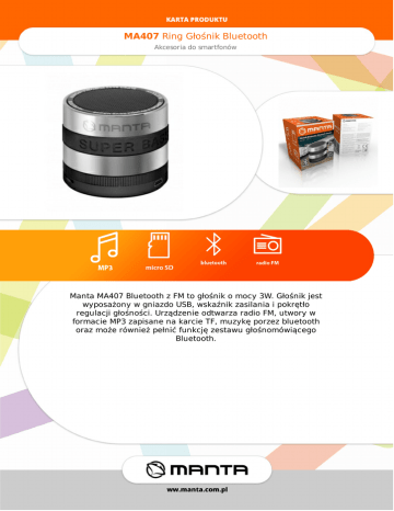 MA407RingGłośnikBluetooth Akcesoriadosmartfonów MantaMA407BluetoothzFMtogłośnikomocy3W.Głośnikjest wyposażonywgniazdoUSB,wskaźnikzasilaniaipokrętło regulacjigłośności.UrządzenieodtwarzaradioFM,utworyw formacieMP3zapisanenakarcieTF,muzykęporzezbluetooth orazmożerównieżpełnićfunkcjęzestawugłośnomówiącego Bluetooth. MA407RingGłośnikBluetooth Akcesoriadosmartfonów Specyfikacja GłośnikwspieraobsługęPC/iPod/iPhone/MP3/ MP4oraztelefonówkomórowychprzezpołączenie Bluetoothlubpopodłączeniukablemjack3,5mm. Jeżelijesteśmiłośnikiemwydajnego,praktycznego sprzętu,owysokimstosunkujakościdoceny,to tengłośnikjestdlaCiebieidealny. Mocgłośników 3W Zasilanie DC5V,500mAh Waga 230g Bluetooth v2.1+EDR(compatibleV3.0),2.4G Gniazdokartpamięci MicroSD(Max32GB) GniazdoUSB MiniUSB RadioFM Tak Dodatkowefunkcje HandsFree,Wskaźnikzasilania,Pokrętło regulacjigłośności,Mikrofon,Zestaw głośnomówiący PortUSB wejścieaudio Pasmoprzenoszenia 60Hz~18KHz Wymiary 60x60x53mm Typakumulatora Litowo-jonowy3.7V/300mAh Cechyszczególne Czaspracydo4godzin Zniekształcenia 0.5% Stosuneksygnałudoszumu 96dB Wielkośćgłośnika 40mm Wbudowanymikrofon Tak Impedancja 2.6ohm Zasięgurządzenia 10m http://www.manta.com.pl/pl/ma407 EAN:5906764654501
