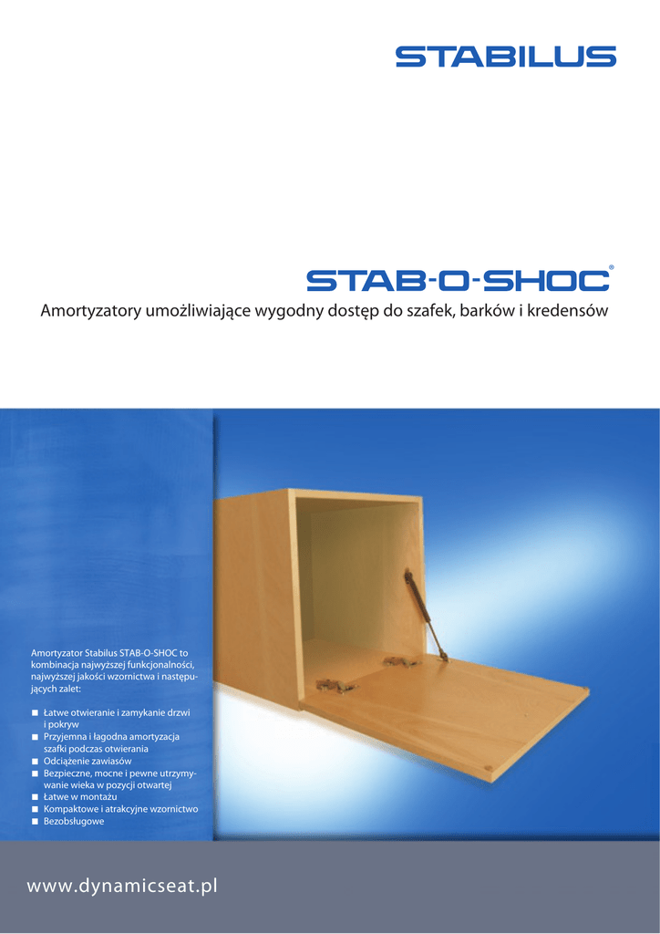 ® Amortyzatory umożliwiające wygodny dostęp do szafek, barków i kredensów Amortyzator Stabilus STAB-O-SHOC to kombinacja najwyższej funkcjonalności, najwyższej jakości wzornictwa i następujących zalet: Łatwe otwieranie i zamykanie drzwi i pokryw Przyjemna i łagodna amortyzacja szafki podczas otwierania Odciążenie zawiasów Bezpieczne, mocne i pewne utrzymywanie wieka w pozycji otwartej Łatwe w montażu Kompaktowe i atrakcyjne wzornictwo Bezobsługowe www.dynamicseat.pl B ±2 A ø 15 ø6 Zastosowanie Najczęstsze zastosowanie amortyzatory typu STAB-O-SHOC znajdują przy drzwiczkach szafek, które otwierają się do dołu. Najlepszy sposób montażu jest pokazany na rysunkach poniżej. Wszystkie pomiary powinny być wykonane od środka zawiasu. Amortyzatory B A 74 mm Drzwi w pozycji zamkniętej Numer katalogowy 235 mm Czarny Chrom 7012VG 7002VM Bez framugi 46 mm 58, 5 mm 229 mm 88+_2° Tabela doboru amortyzatorów Środek zawiasu Waga drzwi 1 - 3,5 Kg Drzwi w pozycji otwartej 4 - 7 kg Drzwi w pozycji zamkniętej Ilość 1 2 330 - 380 mm 1 2 406 - 457 mm 1 2 483 - 533 mm 1 2 559 - 610 mm 1 2 Z framugą Wysokość drzwi 254 - 305 mm Informacja o wartościach w tabelce Podane wartości to tylko wartości wytyczne. Zaleca się przeprowadzenie testu na wybranej aplikacji by wziąć pod uwagę następujące zmienne: dokładny środek ciężkości, system tarcia, etc. Użycie odmiennych typów zawiasów może przynieść różne efekty. Powinno się unikać przeciążenia otwartej pokrywy. 46 mm Wysokość drzwi 58, 5 m m 229 mm 88+_2° Środek zawiasu 9073RT 9074RO Drzwi w pozycji otwartej 6871SU 18 Kugel / Ball - ø 10 2 20 Kugel / Ball - ø 10 2 31 31,6 46, 2 ø 4,3 ø4 90 ° ø 7,3 1, 5 ø 7,3 1, 5 90 ° 19 ø7 1,5 90 ° 14, 2 18 18 13, 5 13, 5 Kugel / Ball - ø 10 15 13,5 ø 4, 3 32 ø 30 www.dynamicseat.pl 46 Tel. 0048 71 398-35-11 Fax 0048 71 314-39-69 e-mail: [email protected]