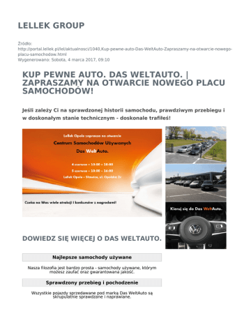 LELLEK GROUP Źródło: http://portal.lellek.pl/lel/aktualnosci/1040,Kup-pewne-auto-Das-WeltAuto-Zapraszamy-na-otwarcie-nowegoplacu-samochodow.html Wygenerowano: Sobota, 4 marca 2017, 09:10 KUP PEWNE AUTO. DAS WELTAUTO. | ZAPRASZAMY NA OTWARCIE NOWEGO PLACU SAMOCHODÓW! Jeśli zależy Ci na sprawdzonej historii samochodu, prawdziwym przebiegu i w doskonałym stanie technicznym - doskonale trafiłeś! DOWIEDZ SIĘ WIĘCEJ O DAS WELTAUTO. Najlepsze samochody używane Nasza filozofia jest bardzo prosta - samochody używane, którym możesz zaufać oraz gwarantowana jakość. Sprawdzony przebieg i pochodzenie Wszystkie pojazdy sprzedawane pod marką Das WeltAuto są skrupulatnie sprawdzane i naprawiane. Gwancja jakości Dzięki szczegółowym testom mamy pewność, że oferujemy naszym Klientom pojazdy najwyższej jakości, dlatego każde auto oddajemy z gwarancją. Jasne warunki sprzedaży Minimalizujemy ryzyko związane z zakupem samochodu używanego i zapewniamy jasne warunki sprzedaży. Nasz Klient nie obawiać się żadnych nieprzyjemnych niespodzianek. Zapraszamy do Centrum Samochodów Używanych! Pn-Pt: 7:00 - 18:00 Sb: 8:00 - 14:00 T: (+48) 77 400 70 22 | E: [email protected] Tweetnij