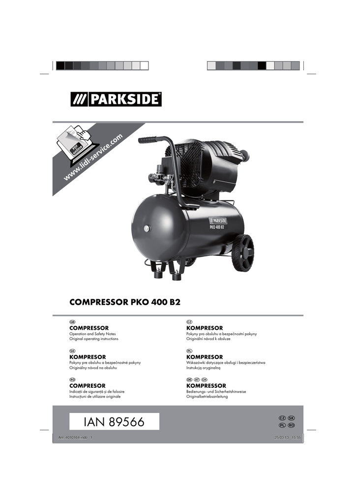 COMPRESSOR PKO 400 B2 K COMPRESSOR D KOMPRESOR Operation and Safety Notes Original operating instructions Pokyny pro obsluhu a bezpečnostní pokyny Originální návod k obsluze W KOMPRESOR T KOMPRESOR Pokyny pre obsluhu a bezpečnostné pokyny Originálny návod na obsluhu Wskazówki dotyczące obsługi i bezpieczeństwa Instrukcją oryginalną e COMPRESOR FAC KOMPRESSOR Indicaţii de siguranţă şi de folosire Instrucţiuni de utilizare originale Bedienungs- und Sicherheitshinweise Originalbetriebsanleitung IAN 89566 Anl_4010164.indb 1 DW Te 25.03.13 15:55 K Before reading, unfold the page containing the illustrations and familiarise yourself with all functions of the device. D Před čtením si otevřete stranu s obrázky a potom se seznamte se všemi funkcemi přístroje. W Pred čítaním si odklopte stranu s obrázkami a potom sa oboznámte so všetkými funkciami prístroja. T Przed przeczytaniem proszę rozłożyć stronę z ilustracjami, a następnie proszę zapoznać się z wszystkimi funkcjami urządzenia. e Înainte de a citi instrucţiunile, deschideţi pagina cu figuri şi apoi familiarizaţi-vă cu toate funcţiile aparatului. FAC Klappen Sie vor dem Lesen die Seite mit den Abbildungen aus und machen Sie sich anschließend mit allen Funktionen des Gerätes vertraut. GB Operation and Safety Notes Page 6 CZ Pokyny pro obsluhu a bezpečnostní pokyny Strana 19 SK Pokyny pre obsluhu a bezpečnostné pokyny Strana 32 PL Wskazówki dotyczące obsługi i bezpieczeństwa Strona 45 RO Indicaţii de siguranţă şi de folosire Pagina 60 DE/AT/CH Bedienungs- und Sicherheitshinweise Seite 74 -2- Anl_4010164.indb 2 25.03.13 15:55 1 15 15 1 14 2 13 3 4 5 6 12 7 11 8 8 10 9 2 3 3 17 19 4 G 21 18 20 16 -3- Anl_4010164.indb 3 25.03.13 15:55 29 4 11 22 23 24 25 26 5 8 27 23 28 15 6 22 28 29 11 23 27 8 23 24 25,26 7 8 15 B -4- Anl_4010164.indb 4 25.03.13 15:55 9 10 15 15 16 A 21 18 11 12 15 16 D max min F C -5- Anl_4010164.indb 5 25.03.13 15:55 GB Table of contents 1. Introduction.................................................................................................................................................. 8 2. Safety regulations ....................................................................................................................................... 8 3. Layout and items supplied ........................................................................................................................10 4. Proper use ...................................................................................................................................................11 5. Technical data ............................................................................................................................................11 6. Before starting the equipment .................................................................................................................. 12 7. Assembly and starting .............................................................................................................................. 12 8. Replacing the power cable ...................................................................................................................... 13 9. Cleaning, maintenance, storage, ordering spare parts and transport ................................................. 13 10. Disposal and recycling ............................................................................................................................. 15 11. Possible causes of failure.......................................................................................................................... 16 12. Declaration of conformity......................................................................................................................... 17 13. Warranty certificate .................................................................................................................................. 18 The reprinting or reproduction by any other means, in whole or in part, of documentation and papers accompanying products is permitted only with the express consent of the iSC GmbH. Subject to technical changes -6- Anl_4010164.indb 6 25.03.13 15:56 GB Caution - Read the operating instructions to reduce the risk of inquiry Wear ear-muffs. The impact of noise can cause damage to hearing. Beware of electrical voltage! Beware of hot parts! Warning! The equipment is remote-controlled and may start-up without warning. Caution! Before using for the first time, check the oil level and replace the oil sealing plug! Important! Do not open the stopcock/pressure regulator until the air hose is connected. If the equipment is overloaded, the overload switch will shut down in order to prevent damage. Once the equipment has cooled down, activate the button to start up again. -7- Anl_4010164.indb 7 25.03.13 15:56 GB • Keep children away! 1. Introduction Congratulations on your new purchase. You have decided in favor of a high-quality product. The operating instructions are a part of this product. They contain information of importance for your safety, for the use of the product and for its disposal. Before you use the product, acquaint yourself with all the information concerning its operation and safety. Use the product only as described and only for the listed areas of application. If you hand on the product to other people, give them all the documentation as well. • • • 2. Safety regulations • Caution! Read all safety regulations and instructions. Any errors made in following the safety regulations and instructions may result in an electric shock, fire and/or serious injury. Keep all safety regulations and instructions in a safe place for future use. • 2.1 Safety information Important! The following basic safety actions must be taken when using this compressor in order to protect the user from electric shocks and the risk of injury and fire. Read and follow these 