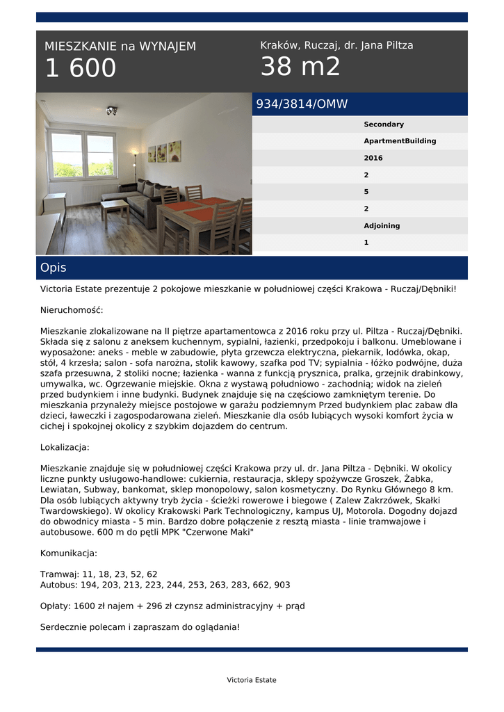 Kraków, Ruczaj, dr. Jana Piltza MIESZKANIE na WYNAJEM 38 m2 1 600 934/3814/OMW Secondary ApartmentBuilding 2016 2 5 2 Adjoining 1 Opis Victoria Estate prezentuje 2 pokojowe mieszkanie w południowej części Krakowa - Ruczaj/Dębniki! Nieruchomość: Mieszkanie zlokalizowane na II piętrze apartamentowca z 2016 roku przy ul. Piltza - Ruczaj/Dębniki. Składa się z salonu z aneksem kuchennym, sypialni, łazienki, przedpokoju i balkonu. Umeblowane i wyposażone: aneks - meble w zabudowie, płyta grzewcza elektryczna, piekarnik, lodówka, okap, stół, 4 krzesła; salon - sofa narożna, stolik kawowy, szafka pod TV; sypialnia - łóżko podwójne, duża szafa przesuwna, 2 stoliki nocne; łazienka - wanna z funkcją prysznica, pralka, grzejnik drabinkowy, umywalka, wc. Ogrzewanie miejskie. Okna z wystawą południowo - zachodnią; widok na zieleń przed budynkiem i inne budynki. Budynek znajduje się na częściowo zamkniętym terenie. Do mieszkania przynależy miejsce postojowe w garażu podziemnym Przed budynkiem plac zabaw dla dzieci, ławeczki i zagospodarowana zieleń. Mieszkanie dla osób lubiących wysoki komfort życia w cichej i spokojnej okolicy z szybkim dojazdem do centrum. Lokalizacja: Mieszkanie znajduje się w południowej części Krakowa przy ul. dr. Jana Piltza - Dębniki. W okolicy liczne punkty usługowo-handlowe: cukiernia, restauracja, sklepy spożywcze Groszek, Żabka, Lewiatan, Subway, bankomat, sklep monopolowy, salon kosmetyczny. Do Rynku Głównego 8 km. Dla osób lubiących aktywny tryb życia - ścieżki rowerowe i biegowe ( Zalew Zakrzówek, Skałki Twardowskiego). W okolicy Krakowski Park Technologiczny, kampus UJ, Motorola. Dogodny dojazd do obwodnicy miasta - 5 min. Bardzo dobre połączenie z resztą miasta - linie tramwajowe i autobusowe. 600 m do pętli MPK "Czerwone Maki" Komunikacja: Tramwaj: 11, 18, 23, 52, 62 Autobus: 194, 203, 213, 223, 244, 253, 263, 283, 662, 903 Opłaty: 1600 zł najem + 296 zł czynsz administracyjny + prąd Serdecznie polecam i zapraszam do oglądania! Victoria Estate Małgorzata Wicha tel. +48 511 560 721 email: [email protected] Victoria Estate Powered by TCPDF (www.tcpdf.org)