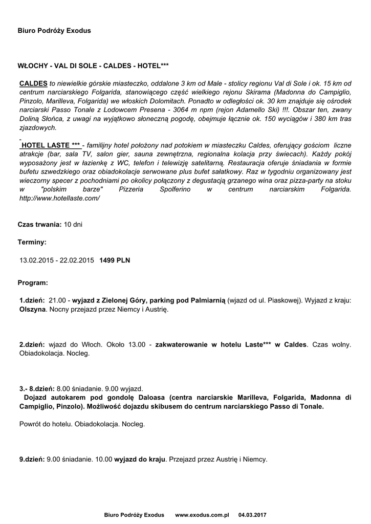 Biuro Podróży Exodus WŁOCHY - VAL DI SOLE - CALDES