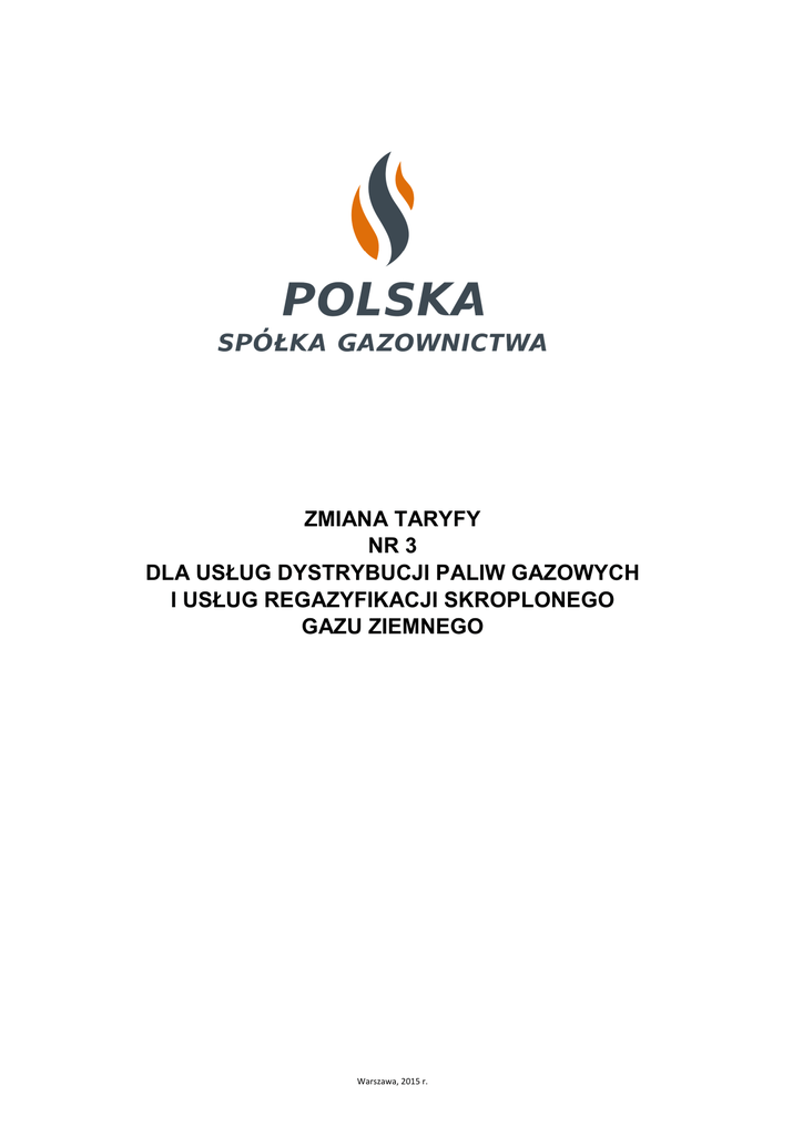 ZMIANA TARYFY NR 3 DLA USŁUG DYSTRYBUCJI PALIW GAZOWYCH I USŁUG REGAZYFIKACJI SKROPLONEGO GAZU ZIEMNEGO Warszawa, 2015 r. Zmiana Taryfy Nr 3 dla usług dystrybucji paliw gazowych i usług regazyfikacji skroplonego gazu ziemnego PSG Sp. z o.o. w Warszawie Niniejsza Zmiana Taryfy została zatwierdzona przez Prezesa Urzędu Regulacji Energetyki w dniu 16 grudnia 2015 r. decyzją Nr DRG-4212-62(6)/2015/22378/III/KGa oraz opublikowana w „Biuletynie Branżowym Urzędu Regulacji Energetyki – Paliwa Gazowe nr 86/2015 (874)” 2 Zmiana Taryfy Nr 3 dla usług dystrybucji paliw gazowych i usług regazyfikacji skroplonego gazu ziemnego PSG Sp. z o.o. w Warszawie W Taryfie Nr 3 dla usług dystrybucji paliw gazowych i usług regazyfikacji skroplonego gazu ziemnego, będącej załącznikiem do decyzji Nr DRG-4212-49(10)/2014/22378/III/AIK/KGa Prezesa Urzędu Regulacji Energetyki z dnia 17 grudnia 2014 r., wprowadza się następujące zmiany: 1. Punkt 2.15. otrzymuje brzmienie: „2.15. 2. Okres rozliczeniowy – ustalony w Taryfie i Umowie przedział czasowy będący podstawą rozliczenia za świadczone Usługi dystrybucji lub Usługi regazyfikacji. Dla potrzeb dokonywania korekt, ostatni Okres rozliczeniowy odpowiada okresowi między ostatnim odczytem Układu pomiarowego i odczytem bezpośrednio go poprzedzającym.” Punkt 4.2 otrzymuje brzmienie: „4.2. Odbiorców gazu ziemnego wysokometanowego lub zaazotowanego, dla których w danym Miejscu odbioru spełnione są łącznie następujące warunki: a) zawarte są przynajmniej 2 Umowy i żadna z Umów zawartych w tym Miejscu Odbioru nie dotyczy Mocy umownej niższej niż 111 kWh/h, b) każda Umowa zawarta jest na okres nie krótszy niż jeden miesiąc umowny bądź jego wielokrotność lub w przypadku Umów zawartych na okres krótszy niż jeden Miesiąc umowny, każda z nich zawarta jest na jednocześnie trwające identyczne okresy, c) żadna z Umów nie dotyczy szczególnych warunków świadczenia Usług dystrybucji, rozliczanych zgodnie z pkt 16. Taryfy, kwalifikuje się do grupy taryfowej z indeksem 2, a Moc umowna będąca kryterium kwalifikacji do grupy taryfowej jest sumą mocy poszczególnych Umów.” 3. Punkt 4.4. lit. b) i c) otrzymuje brzmienie: „b) w przypadku gdy paliwo gazowe dostarczane było przez mniej niż 365 dni, ale więcej niż przez 240 dni przed dniem, w którym wykonano odczyt, na podstawie którego dokonywana jest kwalifikacja – iloczyn 365 dni i średniodobowego zużycia paliwa gazowego w okresie jego dostarczania z uwzględnieniem Charakterystyki poboru paliwa gazowego,” „c) w przypadku gdy paliwo gazowe dostarczane było przez mniej niż przez 240 dni przed dniem, w którym wykonano odczyt, na podstawie którego dokonywana jest kwalifikacja lub w przypadku nowego Miejsca odbioru lub gdy zmieniono warunki przyłączenia do sieci – zadeklarowany przez Odbiorcę roczny odbiór paliwa gazowego.” 4. Punkt 4.5. otrzymuje brzmienie: „4.5. Roczną ilość odebranego paliwa gazowego na potrzeby kwalifikacji do grupy taryfowej ustala się na podstawie: 3 Zmiana Taryfy Nr 3 dla usług dystrybucji paliw gazowych i usług regazyfikacji skroplonego gazu ziemnego PSG Sp. z o.o. w Warszawie – różnicy pomiędzy ilością wynikającą z Odczytu kwalifikacyjnego i odczytu wykonanego w odstępie 12 miesięcy przed ww. odczytem lub w przypadku braku odczytu wykonanego w odstępie 12 miesięcy przed Odczytem kwalifikacyjnym – iloczynu 365 dni i średniodobowego zużycia paliwa gazowego w okresie pomiędzy Odczytem kwalifikacyjnym a odczytem wykonanym w odstępstwie najbardziej zbliżonym do 12 miesięcy przed Odczytem kwalifikacyjnym – jednak nie krótszym niż 355 dni lub – wielkości oszacowanej, zgodnie z pkt 5.2.3., jeżeli z przyczyn leżących po stronie Odbiorcy Operator nie mógł dokonać odczytu.” 5. Punkt 4.17. otrzymuje brzmienie: „4.17. 6. Punkt 5.3.9. otrzymuje brzmienie: „5.3.9. 7. W przypadku upływu terminu ważności cech legalizacyjnych Układu pomiarowego, którego Operator nie jest właścicielem i niedopełnieniu obowiązku jego ponownej legalizacji przez właściciela, a także w przypadku uniemożliwienia przez Odbiorcę dostępu i wymiany Układu pomiarowego, którego właścicielem jest Operator do rozliczeń przyjmuje się ilość paliwa gazowego ustaloną na podstawie prawidłowo zmierzonego poboru paliwa gazowego w porównywalnym okresie oraz Moc umowną zgodnie z Umową.” Za zgodą Operatora, na wniosek Odbiorcy, Moc umowna może być również zmieniona w trakcie bieżącego Roku umownego. W przypadku obniżenia Mocy umownej, zmiana ta będzie obowiązywać przez okres co najmniej 12 kolejnych Miesięcy umownych, począwszy od pierwszego dnia Miesiąca umownego, następującego po miesiącu, w którym złożony został wniosek. Zmiana sprzedawcy lub częściowa zmiana sprzedawcy w danym Punkcie odbioru nie powoduje skrócenia okresu o którym mowa wyżej.” Punkt 5.3.16 otrzymuje brzmienie: „5.3.16. W przypadku, gdy dla danego Miejsca odbioru o mocy większej niż 110 kWh/h, okres realizacji Umowy, zawartej na okres co najmniej 12 miesięcy, był krótszy niż 12 miesięcy na skutek jej wypowiedzenia, Operator dokonuje ponownego rozliczenia Usługi dystrybucji za cały okres trwania Umowy zgodnie z zasadami określonymi w pkt 12. oraz korekty uprzednio wystawionych faktur. Powyższych postanowień nie stosuje się: − gdy rozwiązanie Umowy jest następstwem zmiany sprzedawcy, − w stosunku do podmiotów, które na mocy przepisów prawa są zobowiązane do zawierania umów na czas określony, a zawarta nowa Umowa na czas określony jest kontynuacją umowy poprzedniej, − w przypadku zmiany Odbiorcy bez zmiany Charakterystyki poboru paliwa gazowego, 4 Zmiana Taryfy Nr 3 dla usług dystrybucji paliw gazowych i usług regazyfikacji skroplonego gazu ziemnego PSG Sp. z o.o. w Warszawie − w przypadku zmiany grupy taryfowej na skutek zmiany Pojedynczego Zlecenia Dystrybucji 