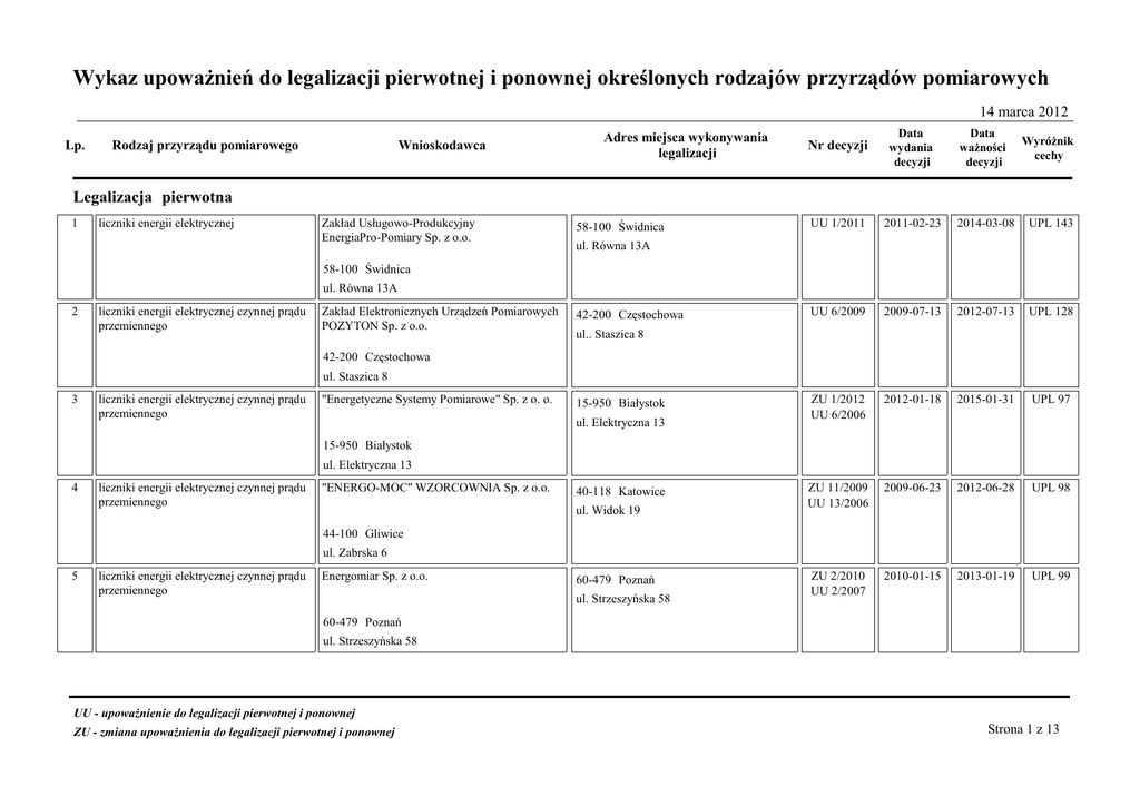 Wykaz upoważnień do legalizacji pierwotnej i ponownej określonych rodzajów przyrządów pomiarowych 14 marca 2012 Lp. Rodzaj przyrządu pomiarowego Wnioskodawca Adres miejsca wykonywania legalizacji Nr decyzji Data wydania decyzji Data ważności decyzji Wyróżnik cechy UU 1/2011 2011-02-23 2014-03-08 UPL 143 UU 6/2009 2009-07-13 2012-07-13 UPL 128 ZU 1/2012 UU 6/2006 2012-01-18 2015-01-31 UPL 97 ZU 11/2009 UU 13/2006 2009-06-23 2012-06-28 UPL 98 ZU 2/2010 UU 2/2007 2010-01-15 2013-01-19 UPL 99 Legalizacja pierwotna 1 liczniki energii elektrycznej Zakład Usługowo-Produkcyjny EnergiaPro-Pomiary Sp. z o.o. 58-100 Świdnica ul. Równa 13A 58-100 Świdnica ul. Równa 13A 2 liczniki energii elektrycznej czynnej prądu przemiennego Zakład Elektronicznych Urządzeń Pomiarowych POZYTON Sp. z o.o. 42-200 Częstochowa ul.. Staszica 8 42-200 Częstochowa ul. Staszica 8 3 liczniki energii elektrycznej czynnej prądu przemiennego "Energetyczne Systemy Pomiarowe" Sp. z o. o. 15-950 Białystok ul. Elektryczna 13 15-950 Białystok ul. Elektryczna 13 4 liczniki energii elektrycznej czynnej prądu przemiennego "ENERGO-MOC" WZORCOWNIA Sp. z o.o. 40-118 Katowice ul. Widok 19 44-100 Gliwice ul. Zabrska 6 5 liczniki energii elektrycznej czynnej prądu przemiennego Energomiar Sp. z o.o. 60-479 Poznań ul. Strzeszyńska 58 60-479 Poznań ul. Strzeszyńska 58 UU - upoważnienie do legalizacji pierwotnej i ponownej ZU - zmiana upoważnienia do legalizacji pierwotnej i ponownej Strona 1 z 13 Lp. Rodzaj przyrządu pomiarowego 6 liczniki energii elektrycznej czynnej prądu przemiennego kl. dokł. 0,2; 0,5; 1 i 2 Wnioskodawca "CECHTAR" Spółka z o.o. Adres miejsca wykonywania legalizacji 33-100 Tarnów ul. Kryształowa 1/3 Data wydania decyzji Data ważności decyzji Wyróżnik cechy ZU 11/2011 UU 11/2008 2011-06-22 2014-07-10 UPL 111 ZU 5/2011 UU 8/2008 2011-03-16 2014-03-18 UPL 109 ZU 8/2010 UU 14/2007 2010-11-15 2013-11-20 UPL 100 ZU 1/2011 UU 4/2008 2011-01-17 2014-01-31 UPL 104 UU 3/2010 2010-04-19 2013-04-27 UPL 136 Nr decyzji 33-100 Tarnów ul. Kryształowa 1/3 7 liczniki energii elektrycznej czynnej prądu p-rzemiennego kl. dokł. 0,2; 0,5; 1 i 2 Przedsiębiorstwo Produkcyjno-HandlowoUsługowe EN-TECH Sp. z o. o. 31-223 Kraków ul. Pachońskiego 9 31-223 Kraków ul. Pachońskiego 9 8 liczniki energii elektrycznej czynnej prądu przemiennego kl. dokł. 0,5; 1; 2 Energetyka Kaliska Liczniki i Instalacje Sp. z o. o. 62-800 Kalisz Al. Wojska Polskiego 35 62-800 Kalisz Al. Wojska Polskiego 35 9 liczniki energii elektrycznej czynnej prądu przemiennego kl. dokł. 2 Zamojskie Przedsiębiorstwo UsługowoProdukcyjne "ENERGOZAM" Sp. z o. o. 22-400 Zamość ul. Zagłoby 5 22-400 Zamość ul. Zagłoby 5 10 liczniki energii elektrycznej czynnej prądu przemiennego klasy dokładnosci 2 PGE Dystrybucja LUBZEL Sp. z o.o. 20-331 Lublin ul. Pancerniaków 4B 20-340 Lublin ul. Garbarska 21A UU - upoważnienie do legalizacji pierwotnej i ponownej ZU - zmiana upoważnienia do legalizacji pierwotnej i ponownej Strona 2 z 13 Lp. Rodzaj przyrządu pomiarowego Wnioskodawca Adres miejsca wykonywania legalizacji Data wydania decyzji Data ważności decyzji Wyróżnik cechy ZU 10/2009 UU 15/2006 2009-06-18 2012-07-06 - ZU 22/2011 UU 20/2008 2011-08-11 2014-10-06 - ZU 24/2011 UU 35/2005 2011-08-24 2014-09-27 - ZU 25/2011 UU 19/2008 2011-08-26 2014-10-02 - ZU 28/2011 UU 22/2008 2011-09-16 2014-10-21 - ZU 7/2011 ZU 1/2008 2011-06-03 2014-07-01 - Nr decyzji Legalizacja ponowna 1 analizatory spalin samochodowych Patrycjusz Stoma AUTO-STOMA 20-806 Lublin ul. Jagiellońska 2D 20-806 Lublin ul. Jagiellońska 2D 2 analizatory spalin samochodowych "HAIK" Sp. z o. o. 62-020 Swarzędz ul. Kórnicka 27 62-020 Swarzędz ul. Kórnicka 27 3 analizatory spalin samochodowych Radiotechnika Serwis Sp. z o. o. 50-335 Wrocław ul. Sienkiewicza 4 50-335 Wrocław ul. Sienkiewicza 4 4 analizatory spalin samochodowych Henryk Michalczewski MESSERVICE 31-564 Kraków Al. Pokoju 81 31-564 Kraków Al. Pokoju 81 5 analizatory spalin samochodowych Piotr Rogowski "MECHANIKA PRECYZYJNA" 62-800 Kalisz Al. Wojska Polskiego 31 98-220 Zduńska Wola Annopole Stare 24 6 analizatory spalin samochodowych Przemysłowy Instytut Motoryzacji 03-301 Warszawa ul. Jagiellońska 55 03-301 Warszawa ul. Jagiellońska 55 UU - upoważnienie do legalizacji pierwotnej i ponownej ZU - zmiana upoważnienia do legalizacji pierwotnej i ponownej Strona 3 z 13 Lp. 7 Rodzaj przyrządu pomiarowego liczniki energii elektrycznej Wnioskodawca Zakład Usługowo-Produkcyjny EnergiaPro-Pomiary Sp. z o.o. Adres miejsca wykonywania legalizacji 58-100 Świdnica Nr decyzji Data wydania decyzji Data ważności decyzji Wyróżnik cechy UU 2/2011 2011-02-23 2014-03-08 UPL 144 UU 5/2009 2009-07-13 2012-07-13 UPL 129 ZU 12/2009 UU 14/2006 2009-06-23 2012-06-28 UPL 59 ZU 2/2012 UU 5/2006 2012-01-18 2015-01-31 UPL 53 ZU 3/2010 UU 3/2007 2010-01-15 2013-01-19 UPL 68 ZU 12/2011 UU 12/2008 2011-06-22 2014-07-10 UPL 111 ul. Równa 13A 58-100 Świdnica ul. Równa 13A 8 liczniki energii elektrycznej czynnej prądu przemiennego Zakład Elektronicznych Urządzeń Pomiarowych POZYTON Sp. z o.o. 42-200 Częstochowa ul.. Staszica 8 42-200 Częstochowa ul. Staszica 8 9 liczniki energii elektrycznej czynnej prądu przemiennego "ENERGO-MOC" WZORCOWNIA Sp. z o.o. 40-118 Katowice ul. Widok 19 44-100 Gliwice ul. Zabrska 6 10 liczniki energii elektrycznej czynnej prądu przemiennego "Energetyczne Systemy Pomiarowe" Sp. z o. o. 15-950 Białystok ul. Elektryczna 13 15-950 Białystok ul. Elektryczna 13 11 liczniki energii elektrycznej czynnej prądu przemiennego Energomiar Sp. z o.o. 60-479 Poznań ul. Strzeszyńska 58 60-479 Poznań ul. Strzeszyńska 58 12 liczniki energii elektrycznej czynnej prądu przemiennego kl. dokł. 0,2; 0,5; 1 i 2 "CECHTAR" Spółka z o.o. 33-100 Tarnów ul. Kryształowa 1/3 33-100 Tarnów ul. Kryształowa 1/3 UU - upoważnienie do legalizacji pierwotnej i ponownej ZU - zmiana upoważnienia do legaliza