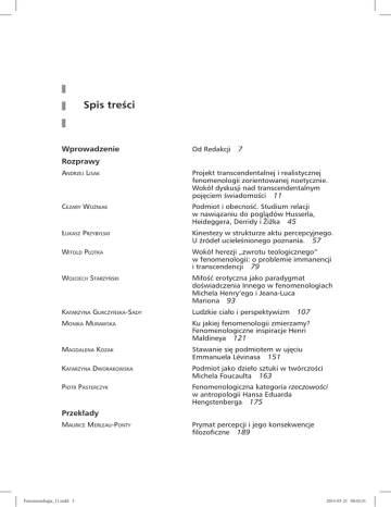 Spis treści Wprowadzenie Od Redakcji 7 Rozprawy ANDRZEJ LISAK Projekt transcendentalnej irealistycznej fenomenologii zorientowanej noetycznie. Wokół dyskusji nad transcendentalnym pojęciem świadomości 11 CEZARY WOŹNIAK Podmiot iobecność. Studium relacji wnawiązaniu do poglądów Husserla, Heideggera, Derridy iŽižka 45 ŁUKASZ PRZYBYLSKI Kinestezy wstrukturze aktu percepcyjnego. Uźródeł ucieleśnionego poznania. 57 WITOLD PŁOTKA Wokół herezji „zwrotu teologicznego” wfenomenologii: oproblemie immanencji itranscendencji 79 WOJCIECH STARZYŃSKI Miłość erotyczna jako paradygmat doświadczenia Innego wfenomenologiach Michela Henry’ego iJeana-Luca Mariona 93 KATARZYNA GURCZYŃSKA-SADY Ludzkie ciało iperspektywizm 107 MONIKA MURAWSKA Ku jakiej fenomenologii zmierzamy? Fenomenologiczne inspiracje Henri Maldineya 121 MAGDALENA KOZAK Stawanie się podmiotem wujęciu Emmanuela Lévinasa 151 KATARZYNA DWORAKOWSKA Podmiot jako dzieło sztuki wtwórczości Michela Foucaulta 163 PIOTR PASTERCZYK Fenomenologiczna kategoria rzeczowości wantropologii Hansa Eduarda Hengstenberga 175 Przekłady MAURICE MERLEAU-PONTY Fenomenologia_11.indd 3 Prymat percepcji ijego konsekwencje filozoficzne 189 2014-03-21 08:43:31 PIOTR KARPIŃSKI Maurice Merleau-Ponty: Filozofia percepcji in nucleo (komentarz do przekładu) 207 Recenzje iomówienia MACIEJ POTĘPA Jana Hartmana metafizyka woli 221 WITOLD PŁOTKA Problematyka horyzontu wfenomenologii według Geniusasa 247 ŁUKASZ CZAJKA Arendt iHeidegger obanalności miłości 252 MICHAEL GUBSER The Far Reaches: Ethics, Phenomenology, and the Call for Social Renewal in Twentieth-Century Central Europe 257 ANDRZEJ PRZYŁĘBSKI Herder jako inicjator hermeneutycznej filozofii życia 263 Kronika WITOLD PŁOTKA MONIKA MURAWSKA „Powroty podmiotu. Fenomenologia ahumanistyka współczesna”. XII Konferencja Polskiego Towarzystwa Fenomenologicznego 275 ANDRZEJ PRZYŁĘBSKI Panel PTFen na Zjeździe Filozofii Polskiej wWiśle 281 TOMASZ WIŚNIEWSKI „Fenomen mądrości” – sprawozdanie zkonferencji Centrum Badań im. Edyty Stein 285 WITOLD PŁOTKA Konferencja „Husserl Circle” wBoston College 289 HENNING NÖRENBERG STEFFEN KLUCK „Begriffene Erfahrung“. Tagungsbericht des XXI. Symposions der Gesellschaft für Neue Phänomenologie 292 MARTYNA ZIMMERMANN „Jedna czy wiele fenomenologii? Fenomenologia wfilozofii współczesnej”. Ogólnopolska konferencja naukowa wGdańsku 296 Fenomenologia_11.indd 4 2014-03-21 08:43:31