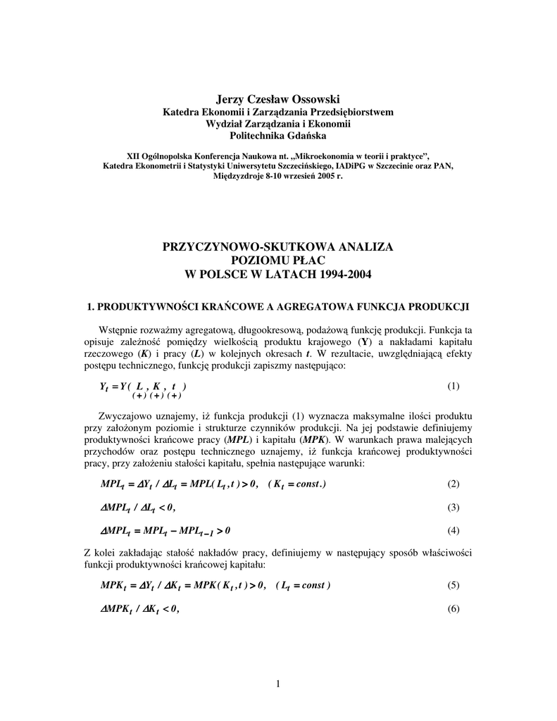 Jerzy Czesław Ossowski Katedra Ekonomii i Zarz dzania Przedsi biorstwem Wydział Zarz dzania i Ekonomii Politechnika Gda ska XII Ogólnopolska Konferencja Naukowa nt. „Mikroekonomia w teorii i praktyce”, Katedra Ekonometrii i Statystyki Uniwersytetu Szczeci skiego, IADiPG w Szczecinie oraz PAN, Mi dzyzdroje 8-10 wrzesie 2005 r. PRZYCZYNOWO-SKUTKOWA ANALIZA POZIOMU PŁAC W POLSCE W LATACH 1994-2004 1. PRODUKTYWNO CI KRA COWE A AGREGATOWA FUNKCJA PRODUKCJI Wst pnie rozwa my agregatow , długookresow , poda ow funkcj produkcji. Funkcja ta opisuje zale no pomi dzy wielko ci produktu krajowego (Y) a nakładami kapitału rzeczowego (K) i pracy (L) w kolejnych okresach t. W rezultacie, uwzgl dniaj c efekty post pu technicznego, funkcj produkcji zapiszmy nast puj co: Yt = Y ( L , K , t ) (1) (+ ) (+ ) (+ ) Zwyczajowo uznajemy, i funkcja produkcji (1) wyznacza maksymalne ilo ci produktu przy zało onym poziomie i strukturze czynników produkcji. Na jej podstawie definiujemy produktywno ci kra cowe pracy (MPL) i kapitału (MPK). W warunkach prawa malej cych przychodów oraz post pu technicznego uznajemy, i funkcja kra cowej produktywno ci pracy, przy zało eniu stało ci kapitału, spełnia nast puj ce warunki: MPLt = ∆Yt / ∆Lt = MPL( Lt , t ) > 0 , ( K t = const .) (2) ∆MPLt / ∆Lt < 0 , (3) ∆MPLt = MPLt − MPLt − 1 > 0 (4) Z kolei zakładaj c stało nakładów pracy, definiujemy w nast puj cy sposób wła ciwo ci funkcji produktywno ci kra cowej kapitału: MPK t = ∆Yt / ∆K t = MPK ( K t , t ) > 0 , ( Lt = const ) (5) ∆MPK t / ∆K t < 0 , (6) 1 ∆MPK t = MPK t − MPK t − 1 > 0 (7) Zauwa my, e stany kapitału rzeczowego na koniec kolejnych okresów s funkcj strumienia nakładów inwestycyjnych brutto (I) w danym okresie oraz wielko ci amortyzacji (D - deprecjacji) kapitału rzeczowego, co zapisujemy nast puj co: K t = K t − 1 + I t − Dt (8) Na podstawie (8) definiujemy w nast puj cy sposób strumie inwestycji netto ( K) w okresie t: ∆K t = K t − K t − 1 = I t − Dt (9) Zauwa my, e: K t = const . ∆K t = 0 I t = Dt (10) Na podstawie powy szego powiemy, e przyj cie zało enia o stało ci kapitału rzeczowego oznacza, i wielko deprecjacji maj tku (D) w okresie t jest równowa ona przez wielko inwestycji brutto (I) w tym samym okresie. Oznacza to, e w warunkach stało ci kapitału nast puje odnowienie maj tku produkcyjnego. Na podobnej zasadzie rozwa y mo emy zagadnienie dotycz ce odnawiania si zasobów pracy. Wyrazem odnowienia si kapitału i pracy jest post p techniczny charakteryzuj cy si wzrostem produkcji w warunkach stało ci czynników. Uzasadnia to przyj cie zało enia o dodatnim wpływie zmiennej t w na wielko produktu (Y) w funkcji (1) oraz na produktywno kra cow pracy (MPL) i produktywno kra cowa kapitału (MPK) w funkcjach (2) i (5). Powiemy wi c, e efektem post pu technicznego, wynikaj cego z odnowienia czynników produkcji, jest przesuni cie w gór : a) krzywej produktu jednakowego kapitału [Y(L,t), K = const.], b) krzywej produktu jednakowej pracy [Y(K,t), L = const.], c) krzywej produktu kra cowego pracy [MPL(L,t), K = const.], d) krzywej produktu kra cowego kapitału [MPK(K,t), L = const.]. 2. PŁACE I PRODUKTYWNO PRACY A POPYT NA PRAC Zauwa my, e w warunkach gospodarki rynkowej podmioty gospodarcze osi gn maksymalny zysk ekonomiczny zatrudniaj c czynnik pracy (L) na takim poziomie, przy którym realna płaca (w) zrówna si z produktem kra cowym pracy (MPL): w = MPL( Lt , t ) ( K t = const ) (11) Funkcja produktu kra cowego pracy zrównana z płac realn wyznacza krzyw popytu na prac . Krzywa popytu na prac jest obrazem graficznym ilo ci pracy, jak pracodawcy chc i s w stanie zatrudni przy ró nych poziomach pracy. Z uwagi na prawo malej cych przychodów, krzywa popytu na prac , b d ca odwzorowaniem krzywej produktywno ci kra cowej, jest krzyw opadaj c (rys.1). Z analizy rysunku 1 wynika, e wzrostowi płacy z poziomu w1 do poziomów w2 i w3 towarzyszy b dzie wzrost ekonomicznie uzasadnionego zapotrzebowania na prac z poziomu L1 do odpowiednio poziomów L2 i L3. Oznacza to, e ceteris paribus, wzrost poziomu płac prowadzi do spadku zapotrzebowania na prac . 2 MPL W A3 W3 A2 W2 A1 W1 DL: MPL(N,K0,t=0) L3 L2 L L1 Rys. 1 Krzywa popytu na prac (DL) Z produktywno ci kra cow pracy (MPL) ci le zwi zana jest produktywno (wydajno ) przeci tna pracy (APL=Y/L). Zwi zek ten wyprowadzi mo emy wykorzystuj c elastyczno produkcji ze wzgl du na prac (EY(L)) : EY ( L ) = ∆Y Y : = MPL( L , t ) : APL( L , t ), ( K = const ) ∆L L Z prostego przekształcenia (12) wynika, produktywno ci przeci tnej: (12) e produktywno kra cowa jest funkcj MPL = EY ( L ) ⋅ APL( L , t ) (13) MPL APL Gdzie: MPLA = wA APLA – wA = zysk jednostkowy APLA A2 Zysk jednostkowy Pole zysku całkowitego MPLA APL(N,K0,t=0) A1 MPL(N,K0,t=0) L LA Rys. 2 Wzajemne poło enie krzywych produktywno ci kra cowej (MPL) i produktywno ci przeci tnej (APL) Zauwa my, prawidłowo : e z uwagi na prawo malej cych przychodów zachodzi nast puj ca 0 < EY ( L ) < 1 MPL( L , t ) < APL( L , t ) 3 (14) Obecnie wykorzystuj c (13), funkcj płacy (11), przedstawi produktywno ci (wydajno ci) przeci tnej: mo emy, jako funkcj w = EY ( L ) ⋅ APL( L , t ) = f ( APL ) (15) Warto zauwa y , co przedstawiono na rysunku 2, e ró nica pomi dzy produktywno ci przeci tn a poziomem płacy wyznacza zysk jednostkowy pracy. W warunkach zrównania płacy z produktywno ci kra cow zysk jednostkowy zapewnia jednocze nie maksymalny zysk całkowity, co równowa ne jest polu zysku na zał czonym rysunku. 3. POZIOM PŁAC, PRODUKTYWN PRACY I STOPA BEZROBOCIA Czynniki poda owe wyznaczaj jedynie potencjalne mo liwo ci produkcji, a tym samym potencjalne mo liwo ci wykorzystania czynników produkcji, przy zało onych poziomach ich wynagrodze . W gospodarce realnej o stopniu wykorzystania czynników decyduje z jednej strony popyt na wytwarzany produkt, rzutuj cy na intensywno wykorzystania czynników, a z drugiej strony poziom wynagrodze czynni