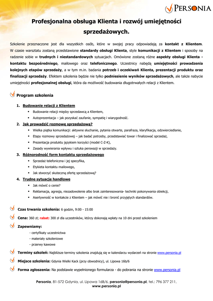Profesjonalna obsługa Klienta i rozwój umiejętności sprzedażowych. Szkolenie przeznaczone jest dla wszystkich osób, które w swojej pracy odpowiadają za kontakt z Klientem. W czasie warsztatu zostaną przedstawione standardy obsługi Klienta, style komunikacji z Klientem i sposoby na radzenie sobie w trudnych i niestandardowych sytuacjach. Omówione zostaną różne aspekty obsługi Klienta kontaktu bezpośredniego, mailowego oraz telefonicznego. Uczestnicy nabędą umiejętności prowadzenia kolejnych etapów sprzedaży, a w tym m.in. badania potrzeb i oczekiwań Klienta, prezentacji produktu oraz finalizacji sprzedaży. Efektem szkolenia będzie nie tylko podniesienie wyników sprzedażowych, ale także nabycie umiejętności profesjonalnej obsługi, która da możliwość budowania długotrwałych relacji z Klientem. Program szkolenia 1. Budowanie relacji z Klientem Budowanie relacji między sprzedawcą a Klientem, Autoprezentacja – jak pozyskać zaufanie, sympatię i wiarygodność. 2. Jak prowadzić rozmowę sprzedażową? Wielka piątka komunikacji: aktywne słuchanie, pytania otwarte, parafraza, klaryfikacja, odzwierciedlanie, Etapy rozmowy sprzedażowej – jak badać potrzeby, przedstawiać towar i finalizować sprzedaż, Prezentacja produktu językiem korzyści (model C-Z-K), Zasady wywierania wpływu i sztuka perswazji w sprzedaży. 3. Różnorodność form kontaktu sprzedażowego Sprzedaż telefoniczna i jej specyfika, Etykieta kontaktu mailowego, Jak stworzyć skuteczną ofertę sprzedażową? 4. Trudne sytuacje handlowe Jak mówić o cenie? Reklamacja, agresja, niezadowolenie albo brak zainteresowania- techniki pokonywania obiekcji, Asertywność w kontakcie z Klientem – jak mówić nie i bronić przyjętych standardów. Czas trwania szkolenia: 6 godzin, 9:00 - 15:00 Cena: 360 zł; rabat: 300 zł dla uczestników, którzy dokonają wpłaty na 10 dni przed szkoleniem Zapewniamy: - certyfikaty uczestnictwa - materiały szkoleniowe - przerwy kawowe Terminy szkoleń: Najbliższe terminy szkolenia znajdują się w kalendarzu wydarzeń na stronie www.personia.pl Miejsce szkolenia: Gdynia Wielki Kack (przy obwodnicy), ul. Lipowa 16b/6 Forma zgłoszenia: Na podstawie wypełnionego formularza - do pobrania na stronie www.personia.pl Personia, 81-572 Gdynia, ul. Lipowa 16B/6, [email protected], tel.: 796 377 211, www.personia.pl
