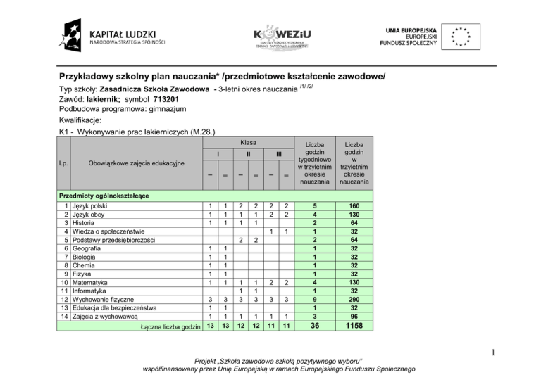 Przykładowy szkolny plan nauczania* /przedmiotowe kształcenie zawodowe/ Typ szkoły: Zasadnicza Szkoła Zawodowa - 3-letni okres nauczania /1/ /2/ Zawód: lakiernik; symbol 713201 Podbudowa programowa: gimnazjum Kwalifikacje: K1 - Wykonywanie prac lakierniczych (M.28.) Klasa I II III II I II I II Obowiązkowe zajęcia edukacyjne I Lp. 1 1 1 1 1 1 2 1 1 2 1 1 2 2 2 2 Liczba godzin tygodniowo w trzyletnim okresie nauczania Liczba godzin w trzyletnim okresie nauczania 5 4 2 1 2 1 1 1 1 4 1 9 1 3 160 130 64 32 64 32 32 32 32 130 32 290 32 96 36 1158 Przedmioty ogólnokształcące 1 2 3 4 5 6 7 8 9 10 11 12 13 14 Język polski Język obcy Historia Wiedza o społeczeństwie Podstawy przedsiębiorczości Geografia Biologia Chemia Fizyka Matematyka Informatyka Wychowanie fizyczne Edukacja dla bezpieczeństwa Zajęcia z wychowawcą 1 1 1 1 1 1 1 1 1 1 3 1 1 13 Łączna liczba godzin 3 1 1 13 1 1 1 1 3 2 2 3 3 1 12 1 11 1 11 2 2 1 1 3 1 12 1 Projekt „Szkoła zawodowa szkołą pozytywnego wyboru” współfinansowany przez Unię Europejską w ramach Europejskiego Funduszu Społecznego Przedmioty w kształceniu zawodowym teoretycznym 1 Podstawy konstrukcji maszyn 4 4 2 Podstawy technik wytwarzania 3 Technologia prac lakierniczych 4 4 4 4 3 3 3 3 4 128 7 224 7 224 Działalność gospodarcza w branży mechanicznej 1 1 1 32 5 Język obcy w branży mechanicznej 1 1 1 32 5 5 20 640 2 74 28 896 30 970 86 2768 4 8 7 Łączna liczba godzin 8 Przedmioty w kształceniu zawodowym praktycznym **/*** 1 Konstrukcje maszyn 2 2 2 Prace lakiernicze - zajęcia praktyczne 4 6 4 6 Łączna liczba godzin Tygodniowy wymiar godzin obowiązkowych zajęć edukacyjnych 27 7 10 10 10 10 29 14 14 14 14 30 /1/ do celów obliczeniowych przyjęto 32 tygodnie w ciągu jednego roku szkolnego /2/ w zasadniczej szkole zawodowej praktyczna nauka zawodu realizowana jest w formie zajęć praktycznych *w szkolnym planie uwzględnia się również wymiar godzin zajęć określonych w par. 4 ust. 2 rozporządzenia w sprawie ramowych planów nauczania, t.j. m.in. religii lub etyki oraz wychowania do życia w rodzinie. ** dla młodocianych pracowników liczbę dni w tygodniu przeznaczonych na praktyczną naukę zawodu u pracodawcy ustala dyrektor szkoły, z uwzględnieniem przepisów Kodeksu Pracy *** zajęcia odbywają się w pracowniach szkolnych, warsztatach szkolnych, centrach kształcenia praktycznego oraz u pracodawcy Egzamin potwierdzający pierwszą kwalifikację (K1) odbywa się pod koniec klasy trzeciej. 2 Projekt „Szkoła zawodowa szkołą pozytywnego wyboru” współfinansowany przez Unię Europejską w ramach Europejskiego Funduszu Społecznego Tabela efektów kształcenia Tabela przyporządkowania poszczególnym przedmiotom efektów kształcenia dla zawodu: Uczeń: I II III I semestr II semestr I semestr II semestr I semestr II semestr Efekty kształcenia /umiejętności, wiedza oraz kompetencje personalne i społeczne/ klasa Liczba godzin przeznaczona na realizację efektów kształcenia symbol 713201 Efekty wspólne dla wszystkich zawodów / wspólne dla zawodów w ramach obszaru M / kwalifikacje Nazwa zajęć edukacyjnych lakiernik; PKZ(M.a) (5) rozróżnia rodzaje połączeń; M.28. 1(6) rozróżnia materiały wypełniające M.28. 1(11) rozróżnia rodzaje materiałów odtłuszczających PKZ(M.a) PKZ(M.a) (4) rozróżnia części maszyn i urządzeń; XX XX XX XX XX PKZ (M.a) (7) rozróżnia materiały konstrukcyjne i eksploatacyjne; XX PKZ (M.a) (17) posługuje się dokumentacją techniczną maszyn i urządzeń oraz przestrzega norm dotyczących materiałów konstrukcyjnych i eksploatacyjnych; PKZ(M.a) (18) stosuje programy komputerowe wspomagające wykonywanie zadań; 34 XX PKZ(M.a) (6) przestrzega zasad tolerancji i pasowań; PKZ(M.a) Podstawy konstrukcji maszyn PKZ(M.a) (2) sporządza szkice części maszyn; M.28. Kształcenie zawodowe teoretyczne XX 46 48 XX Łączna liczba godzin 128 3 Projekt „Szkoła zawodowa szkołą pozytywnego wyboru” współfinansowany przez Unię Europejską w ramach Europejskiego Funduszu Społecznego PKZ(M.a) X X X X X X X X X X X X X X X X X X X X X X X X X X X X X X X X X X X X 212 XXXX BHP Podstawy technik wytwarzania PKZ(M.a) (16) określa budowę oraz przestrzega zasad działania maszyn i urządzeń; PKZ (M.a) (8) rozróżnia środki transportu wewnętrznego; PKZ (M.a) (9) dobiera sposoby transportu i składowania materiałów; PKZ (M.a) (10) rozpoznaje rodzaje korozji oraz określa sposoby ochrony przed korozją; PKZ (M.a) (11) rozróżnia techniki i metody wytwarzania części maszyn i urządzeń; PKZ (M.a) (12) rozróżnia maszyny, urządzenia i narzędzia do obróbki ręcznej i maszynowej; PKZ (M.a) (13) rozróżnia przyrządy pomiarowe stosowane podczas obróbki ręcznej i maszynowej; PKZ (M.a) (15) rozróżnia metody kontroli jakości wykonanych prac; PKZ(M.a) (18) stosuje programy komputerowe wspomagające wykonywanie zadań; BHP (1) rozróżnia pojęcia związane z bezpieczeństwem i higieną pracy, ochroną przeciwpożarową, ochroną środowiska i ergonomią; BHP (2) rozróżnia zadania i uprawnienia instytucji oraz służb działających w zakresie ochrony pracy i ochrony środowiska w Polsce; BHP (3) określa prawa i obowiązki pracownika oraz pracodawcy w zakresie bezpieczeństwa i higieny pracy; XXXX 12 XXXX Łączna liczba godzin 224 4 Projekt „Szkoła zawodowa szkołą pozytywnego wyboru” współfinansowany przez Unię Europejską w ramach Europejskiego Funduszu Społecznego BHP (6) określa skutki oddziaływania czynników szkodliwych na organizm człowieka; PKZ (M.a) (17) posługuje się dokumentacją techniczną maszyn i urządzeń oraz przestrzega norm dotyczących rysunku technicznego, części maszyn, materiałów konstrukcyjnych i eksploatacyjnych; KPS (1) przestrzega zasad kultury i etyki; BHP PKZ(M.a) XXXX XXXX XXXX KPS (3) przewiduje skutki podejmowanych działań; XXXX KPS (5) potrafi radzić sobie ze stresem; XXXX KPS (7) przestrzega tajemnicy za