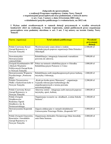 Załącznik do sprawozdania z realizacji Programu współpracy Gminy Nowy Tomyśl z organizacjami pozarządowymi oraz podmiotami, o których mowa w art. 3 ust. 3 ustawy z dnia 24 kwietnia 2003 roku o działalności pożytku publicznego i o wolontariacie, na 2012 rok I Wykaz zadań zrealizowanych w ramach dotacji przyznanych w wyniku otwartych konkursów ofert na realizację, w formie wspierania, zadań publicznych przez organizacje pozarządowe oraz podmioty określone w art. 3 ust. 3 tej ustawy na terenie Gminy Nowy Tomyśl: Nazwa organizacji Tytuł zadania publicznego Wysokość przyznanej dotacji 2.300,00 zł Polski Czerwony Krzyż Zarząd Rejonowy w Nowym Tomyślu Wyrównywanie szans dzieci z rodzin dysfunkcyjnych poprzez organizacje Dnia Dziecka i Mikołajek Nowotomyskie Stowarzyszenie AMAZONKI Związek Kombatantów RP i Byłych Więźniów Politycznych Zarząd Koła w Nowym Tomyślu Stowarzyszenie Wsparcia Psychicznego „Pomocna Dłoń” Polskie Towarzystwo Walki z Kalectwem koło w Nowym Tomyślu Rehabilitacja i integracja Amazonek warunkiem powrotu do zdrowia. 7.000,00 zł Pobyt na turnusie rehabilitacyjnym w Ośrodku Rehabilitacyjnym Pomorze w Ustce 1.000,00 zł Polski Czerwony Krzyż Zarząd Rejonowy w Nowym Tomyślu Polski Związek Działkowców Rodzinny Ogród Działkowy im. K. Świerczewskiego Stowarzyszenie Kopernik NT Rehabilitacja osób niepełnosprawnych przez kulturę, 1.800,00 zł turystykę i rekreację. „Krok po kroku przez Warszawę” - organizacja wyjazdu rekreacyjno-kulturalnego dla niepełnosprawnych z terenu powiatu nowotomyskiego. Aktywny senior - integracja osób starszych poprzez turystykę, sport, kulturę 2.200,00 zł Organizacja wczasów na działkach „Letnia Szkoła Seniora”. 1.300,00 zł Zajęcia edukacyjne w ramach działalności Uniwersytetu Trzeciego Wieku „Kopernik NT” 3.000,00 zł Polski Związek Emerytów, Organizacja obchodów Światowego Dnia Inwalidy Rencistów i Inwalidów oraz Dnia Seniora. Zarząd Rejonowy w Nowym Tomyślu 1.000,00 zł 2.000,00 zł Polski Związek Organizacja Dnia Białej Laski. Niewidomych Zarząd Koła w Nowym Tomyślu Polskie Stowarzyszenie Organizacja spotkań integracyjnych w środowisku Diabetyków Koło diabetyków. Powiatowe w Nowym Tomyślu 1.300,00 zł Polski Związek Hodowców Gołębi Pocztowych zarząd oddziału w Nowym Tomyślu Polski Związek Działkowców Rodzinny Ogród Działkowy im. K. Świerczewskiego Polski Związek Wędkarski Koło Nowy Tomyśl Integracja nowotomyskich członków Polskiego Związku Hodowców Gołębi Pocztowych poprzez organizowanie lotów gołębi pocztowych 3.400,00 zł Organizacja Dnia Działkowca 2012 800,00 zł Wędkarska przyjaźń z gminą Sulęcin – organizacja międzygminnych zawodów wędkarskich 1.500,00 zł Związek Harcerstwa Polskiego Hufiec Nowy Tomyśl Nowotomyskie Towarzystwo Kulturalne W gromadzie, w drużynie, w kręgu – projekt wychowawczo-edukacyjny w jednostkach Hufca ZHP Nowy Tomyśl Wydanie IV numerów kwartalnika społecznokulturalnego 3.500,00 zl Związek Harcerstwa Polskiego Hufiec Nowy Tomyśl Ogólnopolskie Stowarzyszenie Plecionkarzy i Wikliniarzy Polski Związek Wędkarski Koło Nowy Tomyśl Przegląd Małych Form Teatralnych „Teatr w walizce 1.500,00 zł 2012”. Stowarzyszenie Przyjaciół Nowego Tomyśla 3.000,00 zł 3.900,00 zł 22.000,00 zł XII Piknik z wikliną – Wybory Miss Polskiej Wikliny 5.000,00 zł Międzynarodowe zawody wędkarskie Biesehthal – Nowy Tomyśl 2012 Organizacja i prowadzenie wymiany członków Stowarzyszenia Przyjaciół Nowego Tomyśla z Partner Klubem Goch Międzyszkolny Popularyzacja piłki siatkowej wśród dzieci i Uczniowski Klub Sportowy młodzieży nowotomyskich szkół KANGUR – Nowy Tomyśl 2.500,00 zł 12.500,00 zł Uczniowski Klub Sportowy Propagowanie aktywności fizycznej i zdrowego stylu 3.900,00 zł JASTRZĄB – Jastrzębsko życia w środowisku szkolnym Jastrzębska Starego. Stare Uczniowski Klub Sportowy Propagowanie aktywności fizycznej i zdrowego stylu 7.700,00 zł ORZEŁ – Boruja życia w środowisku szkolnym Borui Kościelnej. Kościelna Uczniowski Klub Sportowy Upowszechnianie kultury fizycznej i sportu i wśród SOKÓŁ – Boruja młodzieży gimnazjum w Borui Kościelnej. Kościelna 4.600,00 zł Uczniowski Klub Sportowy Aktywne propagowanie kultury fizycznej i sportu KORONA - Bukowiec wśród dzieci i młodzieży wsi Bukowiec. 5.000,00 zł Uczniowski Klub Sportowy Propagowanie aktywności ruchowej i zdrowego stylu 5.500,00 zł JEDYNKA – Nowy życia wśród dzieci i młodzieży ze Szkoły Tomyśl Podstawowej Nr 1 im. Tadeusza Kościuszki w Nowym Tomyślu. Nowotomyski Klub Tenisowy Uczniowski Klub Sportowy GIMTOM – Nowy Tomyśl Popularyzacja tenisa ziemnego wśród mieszkańców 2.600,00 zł miasta i gminy Nowy Tomyśl. Upowszechnianie kultury fizycznej i sportu w ramach 7.100,00 zł klubów i organizacji sportowych Ludowo -Uczniowski Klub Promowanie sportu wśród dzieci i młodzieży jako Sportowy ZENIT forma spędzania wolnego czasu Wytomyśl 3.300,00 zł LIGA OBRONY KRAJU Rejonowa Organizacja w nowym Tomyślu 3.400,00 zł Propagowanie strzelectwa sportowego wśród młodzieży szkół gimnazjalnych oraz mieszkańców miasta i gminy Nowy Tomyśl poprzez prowadzenie nauki strzelania i organizację zawodów strzeleckich. Uczniowski Klub Sportowy Upowszechnianie kultury fizycznej i sportu wśród 8.600,00 zł ZŁOTA DWÓJKA – Nowy dzieci i młodzieży Szkoły Podstawowej w ramach Tomyśl prowadzonych sekcji piłki ręcznej, siatkowej, nożnej , lekkiej atletyki, koszykowej mające na celu usprawnienie i zainteresowanie sportem najmłodszych uczniów. Stowarzyszenie Nowotomyski Klub Biegacza Chyży Aktywne propagowanie sportu oraz promocja gminy Nowy Tomyśl poprzez organizowanie biegów masowych, w szczególności organizacja biegu ulicznego „Chyża Dziesiątka” Rada Przyjaciół Harcerstwa IV Rajd „Szlakiem dworów i dworków polskich” Hufca ZHP Nowy Tomyśl oraz XI