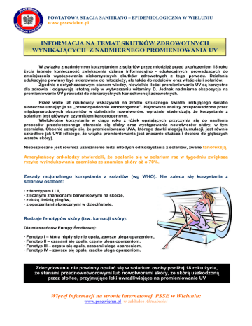 POWIATOWA STACJA SANITRANO – EPIDEMIOLOGICZNA W WIELUNIU www.pssewielun.pl INFORMACJA NA TEMAT SKUTKÓW ZDROWOTNYCH WYNIKAJĄCYCH Z NADMIERNEGO PROMIENIOWANIA UV W związku z nadmiernym korzystaniem z solariów przez młodzież przed ukończeniem 18 roku życia istnieje konieczność zwiększenia działań informacyjno - edukacyjnych, prowadzących do zmniejszenia występowania niekorzystnych skutków zdrowotnych z tego powodu. Działania edukacyjne powinny być skierowane do młodzieży, ale także do rodziców oraz właścicieli solariów. Zgodnie z dotychczasowym stanem wiedzy, niewielkie ilości promieniowania UV są korzystne dla zdrowia i odgrywają istotną rolę w wytwarzaniu witaminy D. Jednak nadmierna ekspozycja na promieniowanie UV prowadzi do niekorzystnych konsekwencji zdrowotnych. Przez wiele lat naukowcy wskazywali na źródło sztucznego światła imitującego światło słoneczne uznając je za „prawdopodobnie kancerogenne”. Najnowsze analizy przeprowadzone przez międzynarodowych ekspertów w dziedzinie nowotworów, wyraźnie stwierdzają, że korzystanie z solarium jest głównym czynnikiem kancerogennym. Wielokrotne korzystanie w ciągu roku z łóżek opalających przyczynia się do nasilenia procesów przedwczesnego starzenia się skóry oraz występowania nowotworów skóry, w tym czerniaka. Obecnie uznaje się, że promieniowanie UVA, którego dawki ulegają kumulacji, jest równie szkodliwe jak UVB (dlatego, że wiązka promieniowania jest znacznie dłuższa i dociera do głębszych warstw skóry). Niebezpieczne jest również uzależnienie ludzi młodych od korzystania z solariów, zwane tanoreksją. Amerykańscy onkolodzy stwierdzili, że opalanie się w solarium raz w tygodniu zwiększa ryzyko wyindukowania czerniaka ze znamion skóry aż o 70%. Zasady racjonalnego korzystania z solariów (wg WHO). Nie zaleca się korzystania z solariów osobom: · z fenotypem I i II, · z licznymi znamionami barwnikowymi na skórze, · z dużą ilością piegów, · z oparzeniami słonecznymi w dzieciństwie. Rodzaje fenotypów skóry (tzw. karnacji skóry): Dla mieszańców Europy Środkowej: · Fenotyp I – która nigdy się nie opala, zawsze ulega oparzeniom, · Fenotyp II – czasami się opala, często ulega oparzeniom, · Fenotyp III – często się opala, czasami ulega oparzeniom, · Fenotyp IV – zawsze się opala, rzadko ulega oparzeniom. Zdecydowanie nie powinny się w solarium roku ze życia, Zdecydowanie nie powinny opalaćopalać się w solarium osoby osoby poniżejponiżej 18 roku18życia, stanami ze stanami przednowotworowymi lub nowotworami skóry, ze skórą uszkodzoną przednowotworowymi lub nowotworami skóry, ze skórą uszkodzoną przez słońce, przez słońce, przyjmujące leki uwrażliwiające na promieniowanie UV przyjmujące leki uwrażliwiające na promieniowanie UV. Więcej informacji na stronie internetowej PSSE w Wieluniu: www.pssewielun.pl w zakładce Aktualności