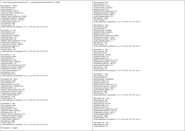 ***Dane Pierwiastków Chemicznych*** - Układ Okresowy Pierwiastków 2.5.1.FREE Pierwiastek: H - Wodór Stan skupienia: gaz Liczba atomowa: 1 Masa atomowa: 1.00794 Charakter tlenku: amfoteryczny Elektroujemność: 2.1 Gęstość: [g/cm sześcienny]: 0.0899 Temperatura topnienia: -259.34 C Temperatura wrzenia: -252.88 C Liczba izotopów stałych: 3 Rok odkrycia: 1766 Promień atomu: 30 Liczba elektronów w powłokach: K: 1 L: 0 M: 0 N: 0 O: 0 P: 0 Q: 0 Pierwiastek: He - Hel Stan skupienia: gaz Liczba atomowa: 2 Masa atomowa: 4.002602 Charakter tlenku: b.d. Elektroujemność: b.d. Gęstość: [g/cm sześcienny]: 0.126 Temperatura topnienia: b.d. Temperatura wrzenia: -268.9 C Liczba izotopów stałych: 4 Rok odkrycia: 1868 Promień atomu: 140 Liczba elektronów w powłokach: K: 2 L: 0 M: 0 N: 0 O: 0 P: 0 Q: 0 Pierwiastek: Li - Lit Stan skupienia: stały Liczba atomowa: 3 Masa atomowa: 6.941 Charakter tlenku: zasadowy Elektroujemność: 1.0 Gęstość: [g/cm sześcienny]: 0.532 Temperatura topnienia: 180.6 C Temperatura wrzenia: 1342 C Liczba izotopów stałych: 5 Rok odkrycia: 1817 Promień atomu: 152 Liczba elektronów w powłokach: K: 2 L: 1 M: 0 N: 0 O: 0 P: 0 Q: 0 Pierwiastek: Be - Beryl Stan skupienia: stały Liczba atomowa: 4 Masa atomowa: 9.012182 Charakter tlenku: amfoteryczny Elektroujemność: 1.5 Gęstość: [g/cm sześcienny]: 1.85 Temperatura topnienia: 1287 C Temperatura wrzenia: 2500 C Liczba izotopów stałych: 6 Rok odkrycia: 1798 Promień atomu: 112 Liczba elektronów w powłokach: K: 2 L: 8 M: 0 N: 0 O: 0 P: 0 Q: 0 Pierwiastek: B - Bor Stan skupienia: stały Liczba atomowa: 5 Masa atomowa: 10.811 Charakter tlenku: kwasowy Elektroujemność: 2.0 Gęstość: [g/cm sześcienny]: 2.35 Temperatura topnienia: 2100 C Temperatura wrzenia: 3700 C Liczba izotopów stałych: 8 Rok odkrycia: 1808 Promień atomu: 81 Liczba elektronów w powłokach: K: 2 L: 3 M: 0 N: 0 O: 0 P: 0 Q: 0 Pierwiastek: C - Węgiel Stan skupienia: stały Liczba atomowa: 6 Masa atomowa: 12.011 Charakter tlenku: kwasowy Elektroujemność: 2.5 Gęstość: [g/cm sześcienny]: 2.27 Temperatura topnienia: 3850 C Temperatura wrzenia: 3600 C Liczba izotopów stałych: 12 Rok odkrycia: staroż. Promień atomu: 77 Liczba elektronów w powłokach: K: 2 L: 4 M: 0 N: 0 O: 0 P: 0 Q: 0 Pierwiastek: N - Azot Stan skupienia: gaz Liczba atomowa: 7 Masa atomowa: 14.00674 Charakter tlenku: kwasowy Elektroujemność: 3.0 Gęstość: [g/cm sześcienny]: 0.808 Temperatura topnienia: -210 C Temperatura wrzenia: -195.8 C Liczba izotopów stałych: 11 Rok odkrycia: 1772 Promień atomu: 70 Liczba elektronów w powłokach: K: 2 L: 5 M: 0 N: 0 O: 0 P: 0 Q: 0 Pierwiastek: O - Tlen Stan skupienia: gaz Liczba atomowa: 8 Masa atomowa: 15.9994 Charakter tlenku: b.d. Elektroujemność: 3.5 Gęstość: [g/cm sześcienny]: 1.141 Temperatura topnienia: -218.8 C Temperatura wrzenia: -182.9 C Liczba izotopów stałych: 12 Rok odkrycia: 1772 Promień atomu: 66 Liczba elektronów w powłokach: K: 2 L: 6 M: 0 N: 0 O: 0 P: 0 Q: 0 Pierwiastek: F - Fluor Stan skupienia: gaz Liczba atomowa: 9 Masa atomowa: 18.9984032 Charakter tlenku: b.d. Elektroujemność: 4.0 Gęstość: [g/cm sześcienny]: 1.51 Temperatura topnienia: -218.6 C Temperatura wrzenia: -188.1 C Liczba izotopów stałych: 10 Rok odkrycia: 1886 Promień atomu: 64 Liczba elektronów w powłokach: K: 2 L: 7 M: 0 N: 0 O: 0 P: 0 Q: 0 Pierwiastek: Ne - Neon Stan skupienia: gaz Liczba atomowa: 10 Masa atomowa: 20.1797 Charakter tlenku: b.d. Elektroujemność: b.d. Gęstość: [g/cm sześcienny]: 1.20 Temperatura topnienia: -248.6 C Temperatura wrzenia: -246.1 C Liczba izotopów stałych: 13 Rok odkrycia: 1898 Promień atomu: 150 Liczba elektronów w powłokach: K: 2 L: 8 M: 0 N: 0 O: 0 P: 0 Q: 0 Pierwiastek: Na - Sód Stan skupienia: stały Liczba atomowa: 11 Masa atomowa: 22.989768 Charakter tlenku: zasadowy Elektroujemność: 0.9 Gęstość: [g/cm sześcienny]: 0.97 Temperatura topnienia: 97.9 C Temperatura wrzenia: 881 C Liczba izotopów stałych: 17 Rok odkrycia: 1807 Promień atomu: 186 Liczba elektronów w powłokach: K: 2 L: 8 M: 1 N: 0 O: 0 P: 0 Q: 0 Pierwiastek: Mg - Magnez Stan skupienia: stały Liczba atomowa: 12 Masa atomowa: 24.3050 Charakter tlenku: zasadowy Elektroujemność: 1.2 Gęstość: [g/cm sześcienny]: 1.74 Temperatura topnienia: 650 C Temperatura wrzenia: 1105 C Liczba izotopów stałych: 15 Rok odkrycia: 1808 Promień atomu: 160 Liczba elektronów w powłokach: K: 2 L: 8 M: 2 N: 0 O: 0 P: 0 Q: 0 Pierwiastek: Al - Glin Stan skupienia: stały Liczba atomowa: 13 Masa atomowa: 28.981539 Charakter tlenku: amfoteryczny Elektroujemność: 1.5 Gęstość: [g/cm sześcienny]: 2.70 Temperatura topnienia: 660.3 C Temperatura wrzenia: 2520 C Liczba izotopów stałych: 13 Rok odkrycia: 1827 Promień atomu: 143 Liczba elektronów w powłokach: K: 2 L: 8 M: 3 N: 0 O: 0 P: 0 Q: 0 Pierwiastek: Si - Krzem Stan skupienia: stały Liczba atomowa: 14 Masa atomowa: 28.0855 Charakter tlenku: kwasowy Elektroujemność: 1.8 Gęstość: [g/cm sześcienny]: 2.33 Temperatura topnienia: 1417 C Temperatura wrzenia: 3280 C Liczba izotopów stałych: 15 Rok odkrycia: 1823 Promień atomu: 118 Liczba elektronów w powłokach: K: 2 L: 8 M: 4 N: 0 O: 0 P: 0 Q: 0 Pierwiastek: P - Fosfor Stan skupienia: stały Liczba atomowa: 15 Masa atomowa: 30.973762 Charakter tlenku: kwasowy Elektroujemność: 2.1 Gęstość: [g/cm sześcienny]: 1.823 Temperatura topnienia: 44.15 C Temperatura wrzenia: 280.5 C Liczba izotopów stałych: 17 Rok odkrycia: 1669 Promień atomu: 110 Liczba elektronów w powłokach: K: 2 L: 8 M: 5 N: 0 O: 0 P: 0 Q: 0 Pierwiastek: S - Siarka Stan skupienia: stały Liczba atomowa: 16 Masa atomowa: 32.066 Charakter tlenku: kwasowy Elektroujemność: 2.5 Gęstość: [g/cm sześcienny]: 2.07 Temperatura topnienia: 119.6 C Temperatura wrzenia: 444.6 C Liczba izotopów stałych: 16 Rok odkrycia: staroż. Promień atomu: 104 Liczba elektronów w powłokach: K: 2 L: 8 M: 6 N: 0 O: 0 P: 0 Q: 0 Pierwiastek: 