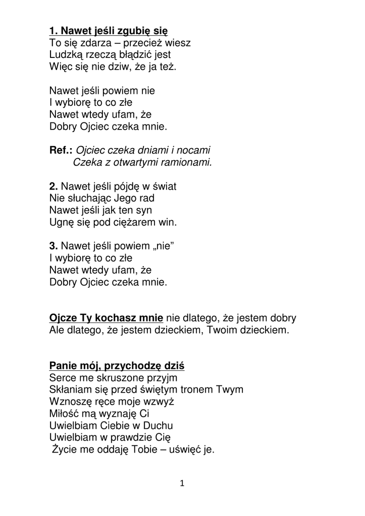 1. Nawet jeśli zgubię się To się zdarza – przecież wiesz Ludzką rzeczą błądzić jest Więc się nie dziw, że ja też. Nawet jeśli powiem nie I wybiorę to co złe Nawet wtedy ufam, że Dobry Ojciec czeka mnie. Ref.: Ojciec czeka dniami i nocami Czeka z otwartymi ramionami. 2. Nawet jeśli pójdę w świat Nie słuchając Jego rad Nawet jeśli jak ten syn Ugnę się pod ciężarem win. 3. Nawet jeśli powiem „nie” I wybiorę to co złe Nawet wtedy ufam, że Dobry Ojciec czeka mnie. Ojcze Ty kochasz mnie nie dlatego, że jestem dobry Ale dlatego, że jestem dzieckiem, Twoim dzieckiem. Panie mój, przychodzę dziś Serce me skruszone przyjm Skłaniam się przed świętym tronem Twym Wznoszę ręce moje wzwyż Miłość mą wyznaję Ci Uwielbiam Ciebie w Duchu Uwielbiam w prawdzie Cię Życie me oddaję Tobie – uświęć je. 1 Dziś składamy – dziś składamy na Twym stole – na Twym stole to, co mamy – to, co mamy; choć ubogie tak jest, choć ubogie tak jest. Naszą radość – naszą radość, naszą miłość – naszą miłość, nasze życie – nasze życie, które dałeś nam, które dałeś nam. O, Alleluja, Alleluja! /4x O wychwalajcie Go wszystkie narody I wysławiajcie Go wszystkie ludy Jego łaskawość nad nami potężna A Jego wierność trwa na wieki. Hosanna! Hosanna! Hosanna na niebiosach! / 2x Sławić chcemy Cię wciąż Z radością i czcią Wywyższony bądź, Boże nasz! Hosanna niechaj ciągle brzmi! Tobie Panie zaufałem Moje życie daję pod Twoje władanie Tylko Ciebie będzie uwielbiać serce me. Bo cudowna jest miłość Twoja Jedyna, takiej nie może dać nikt inny Nieskończone miłosierdzie dla nas masz Nie zabraknie dla nikogo. 2 Ref.: Ja nie opuszczę cię, będę zawsze z tobą Będę wspierał cię. 1. Tylko w Moim miłosierdziu Znajdziesz spokój duszy swej Nawet choćbyś bardzo zbłądził Nie zostawię nigdy cię. 2. Kiedy jest ci bardzo ciężko Przyjdź i popatrz w oczy Me Szepnij „Jezu ufam Tobie” Nie zawiodę nigdy cię. Oddaję Ci życie swe Ty Panie wiesz jakie jest Za wszystko przepraszam Cię Co było grzechem i złem. Daj Ducha Świętego mi By odtąd prowadził mnie Rozpalił dziś w sercu mym Ognisko miłości Twej. Miłość Twa od najwyższych gór wyższa jest Wielka jest wierność Twa, do nieba sięga wzwyż Miłość Twa głębsza niż ocean bez dna Wielka jest wierność Twa, gdy do mnie zniżasz się. Święty, Święty, Święty, Święty, Święty Pan Święty, Święty, Święty, Święty Bóg i Król. /2x Otwieram serce me, podnoszę ręce swe Królu wejdź i rozgość się. /2x 3 Mój Zbawiciel, On bardzo kocha mnie Ja nie wiem czemu miłością darzy mnie On mi nowe życie dzisiaj ofiarować chce Będę, będę mieszkał razem z Panem mym Będę, będę mieszkał razem z Panem mym. Chwalę Ciebie Panie i uwielbiam Wznoszę w górę swoje ręce, uwielbiając Imię Twe. /2x Bo wielkiś Ty, wielkie dzieła czynisz dziś Nie dorówna Tobie nikt, nie dorówna Tobie nikt. /2x Jedyny Pan, prawdziwy Bóg Wszystko co mam oddaję Mu On jedynym Panem jest Sh’ma Israel! Sh’ma Israel! Jesteś Królem, jesteś Królem Królem jest Bóg. /2x Podnieśmy wszyscy nasze serca Podnieśmy wszyscy nasze dłonie Stawajmy przed obliczem Pan Wielbiąc Go. Święte Imię Jezus, święte Imię Jezus Jest na ustach mych i w sercu mym W mocy Ducha uwielbiam Cię. /2x Nie ma w innym zbawienia Gdyż nie dano nam ludziom innego imienia w Nim zbawienie jest. /2x 4 Łaską jesteśmy zbawieni, z łaski możemy tu stać Łaską usprawiedliwieni i przez Baranka Krew Wzywasz nas Panie do siebie, przed Twój w niebie tron My łaską obdarowani, Tobie składamy hołd Tobie składamy hołd. 1. Jezus daje nam zbawienie Jezus daje pokój nam Jemu składam dziękczynienie Chwałę z serca mego dam. Ref.: Jezus siłą mą, Jezus pieśnią mego życia Królem wiecznym On, niepojęty w mocy Swej W Nim znalazłem to, czego szukałem do dzisiaj Sam mi podał dłoń – bym zwyciężał w każdy dzień. 2. W Jego ranach uzdrowienie W Jego śmierci życia dar Jego krew to oczyszczenie Jego życie chwałą nam. Ref.: Jezu ufam Tobie, Jezu kocham Cię W miłosierdziu Swoim nie opuścisz mnie Jezu ufam Tobie, Jezu kocham Cię Do swojego serca mocno przytul mnie. 1. Tak jak jasne słońce patrzysz na mnie z góry Nie zasłonią Ciebie nawet ciemne chmury. /2x 2. Przyjaźń Twa serdeczna zawieść mnie nie może Grzechy me wybaczasz miłosierny Boże. /2x 5 Ref.: Pochwalony bądź, Panie pochwalony bądź / 4x 1. Z wszystkimi Twymi stworzeniami I z naszym bratem słońcem Z księżycem i gwiazdami - pochwalony bądź! 2. Przez naszego brata wiatr Przez powietrze i obłoki Od Bałtyku aż do Tatr - pochwalony bądź! 3. Przez naszą ziemię Która nas żywi i chowa Przez owoce, kwiaty i zioła - pochwalony bądź! Ref.: Duch Święty niech jednoczy nas Bo każdy człowiek to siostra i brat. 1. Otwórzmy serca na tchnienie Ducha By każdy wiarą mógł Boga posłuchać. 2. Otwórzmy serca na Boże dary By każdy śpiewał dziś dla Jego chwały. 3. Otwórzmy serca na Boże światło By to co dobre w nas nigdy nie zgasło. Tobie chór Aniołów śpiewa nową pieśń Chwała Barankowi. /2x Alleluja, alleluja, alleluja! Chwała i cześć. /2x 6 Jezus zwyciężył, to wykonało się Szatan pokonany, Jezus złamał śmierci moc Jezus jest Panem, o, Alleluja! Po wieczne czasy Królem królów jest. Jezus jest Panem. /4x Tylko Jezus jest Panem, Jezus jest Panem On jest Panem ziemi tej. Uwielbiam Imię Twoje Panie Wywyższam Cię i daję Ci hołd W przedsionku chwały Twej staję Z radością śpiewam Ci pieśń. O, Panie Jezu, chcę wyznać, że Ja kocham Ciebie – Ty zmieniasz mnie Chcę Ci dziękować dziś ze wszystkich sił Dajesz mi siebie, bym na wieki żył. Ofiaruję Tobie, Panie mój całe życie me Cały jestem Twój aż na wieki Oto moje serce, przecież wiesz Tyś miłością mą jedyną jest. Jezu, tchnij w moje serce Twojego Ducha. /2x Rozpal 