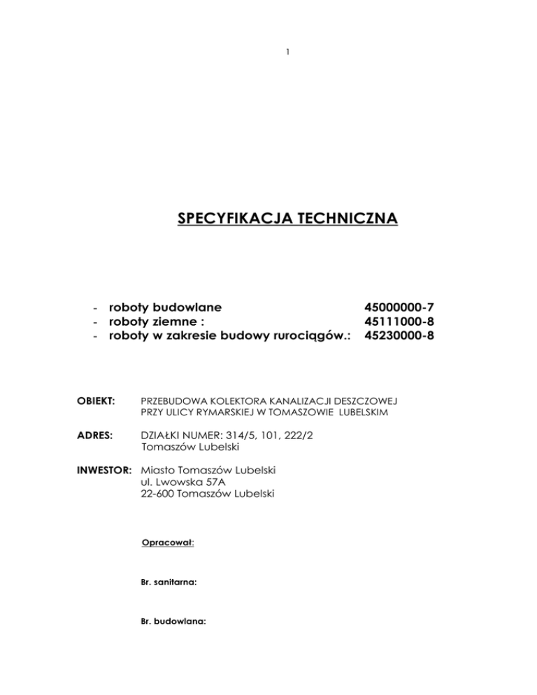 1 SPECYFIKACJA TECHNICZNA - roboty budowlane - roboty ziemne : - roboty w zakresie budowy rurociągów.: 45000000-7 45111000-8 45230000-8 OBIEKT: PRZEBUDOWA KOLEKTORA KANALIZACJI DESZCZOWEJ PRZY ULICY RYMARSKIEJ W TOMASZOWIE LUBELSKIM ADRES: DZIAŁKI NUMER: 314/5, 101, 222/2 Tomaszów Lubelski INWESTOR: Miasto Tomaszów Lubelski ul. Lwowska 57A 22-600 Tomaszów Lubelski Opracował: Br. sanitarna: Br. budowlana: 2 UWAGA: WYMIENIONE PONIśEJ MATERIAŁY I URZĄDZENIA NIE SĄ WSKAZANIEM WYROBU - SŁUśĄ TYLKO OKREŚLENIU WYMAGANEGO STANDARDU PROJEKTOWANYCH URZĄDZEŃ I MOGĄ ZOSTAĆ ZASTĄPIONE PRZEZ URZĄDZENIA RÓWNOWAśNE. WYKONAWCA PRZED PRZYSTĄPIENIEM DO ROBÓT WINIEN ZAPOZNAĆ SIĘ Z WARUNKAMI TECHNICZNYMI WYKONANIA I ODBIORU SIECI KANALIZACYJNYCH (WYMAGANIA TECHNICZNE COBRTI INSTAL ZESZYT NR 9, WYDANIE 2003R.) I WARUNKAMI TECHNICZNYMI WYKONANIA I ODBIORU SIECI WODOCIĄGOWYCH (WYMAGANIA TECHNICZNE COBRTI INSTAL ZESZYT NR 3, wydanie 2001r.) A NASTĘPNIE STOSOWAĆ PRZEDSTAWIONE W NICH INSTRUKCJE I WYMAGANIA W TRAKCIE WYKONYWANIA ROBÓT OBJĘTYCH PROJEKTEM. 1. Wstęp. 1.1. Przedmiot Specyfikacji Technicznej. Przedmiotem niniejszej Specyfikacji Technicznej są wymagania dot. budowy sieci kanalizacji deszczowej wg projektu budowlano – wykonawczego przebudowy kanalizacji deszczowej w ulicy Rymarskiej w Tomaszowie Lub.. 1.2. Zakres stosowania S.T. Specyfikacja techniczna jest dokumentem przetargowym na zadanie opisane w p. 1.1. 1.3. Zakres robót objętych S.T Specyfikacja obejmuje wszystkie roboty konieczne do wybudowania sieci kanalizacji deszczowej w ulicy Rymarskiej w Tomaszowie Lubelskim. W szczególności roboty obejmują : - budowę ogrodzenia i oznakowania wykopów - barierki ochronne z desek na słupkach drewnianych - wykonanie i oznakowanie objazdów - demontaŜ nawierzchni utwardzonej z podbudową w ulicy Starozamojskiej - odwodnienie wykopów - budowa dróg tymczasowych z płyt Ŝelbetowych średniowymiarowych - roboty ziemne– wykopy, ręczne i mechaniczne, wraz z umocnieniem ścian wykopów systemowymi obudowami wciskanymi (głębionymi) w grunt w trakcie wykonywania wykopów z wywozem gruntu w miejsce wskazane przez inwestora, - wykonanie podłoŜa pod rurociągi, studnie, osadnik wirowy i separator - wybudowanie ławy betonowej pod kanał 1000 WIPRO - demontaŜ istniejącej studni na kanale 1000mm, - demontaŜ istniejącego kanału betonowego o średnicy 200mm i długości 4,5m - dwukrotną przebudowę po demontaŜu odcinka sieci kanalizacji deszczowej z rur kamionkowych 600mm na rury z PE 560mm o dł. 7,0m, - budowę sieci kanalizacyjnej z rur betonowych WIPRO kl. II o dł. łacznej 170,5m, - budowę sieci kanalizacyjnej deszczowej z rur PVC-U strukturalnych o średnicy 400 i 1000mm, rur PVC-U 160mm - o długościach odpowiednio 14,0m, 2,5m, 2,0m (długości za wyjątkiem PROCOR 1000 podano w osiach studni) - budowę separatora lamelowego substancji ropopochodnych o średnicy zbiornika Ŝelbetowego 2500mm - budowę studni Ŝelbetowych 1200 i 1500mm - szt. 10, ze szczelnymi przejściami dla 3 wszystkich wymiarów i typów rur budowę osadnika wirowego 2-komorowego o średnicach komór 3000mm i 2000mm wykonanie warstwy ochronnej zasypu z piasku, zasypka wykopów piaskiem zagęszczenie obsypki i zasypki w trakcie ich wykonywania budowa zatoki technologicznej z kostki brukowej zabezpieczenie rurami osłonowymi skrzyŜowań z uzbrojeniem podziemnym w tym przebudowa 2 odcinków sieci wodociągowej, - zabezpieczenie istniejących obiektów (budynków i ogrodzeń) przed uszkodzeniem w trakcie robót ewentualnie naprawa (przywrócenie do stanu pierwotnego) po uszkodzeniu - zaślepienie końcówek pozostawionych w gruncie rur kamionkowych 600mm - wypełnienie pianobetonem pozostawionych w gruncie rur betonowych 1000mm - próby i odbiory wybudowanej sieci. Szczegóły przedstawiono w opisie technicznym do projektu i w części rysunkowej projektu. - 1.4. Ogólne wymagania. - - - Wykonawca jest odpowiedzialny za : realizację robót zgodnie z dokumentacją projektową, specyfikacją techniczną, poleceniami nadzoru autorskiego i inwestorskiego zapewnienie i utrzymanie bezpieczeństwa placu budowy oraz robót poza placem budowy (jeŜeli wynikną) w okresie trwania umowy, aŜ do zakończenia robót odbiorem końcowym budową sieci zgodnie z warunkami technicznymi wykonania i odbioru robót, przywołanymi w opisie do projektu polskimi normami, rozporządzeniem MI z 12.04.2002 r. w sprawie warunków technicznych, jakim powinny odpowiadać budynki i ich usytuowanie (łącznie z obowiązującymi Polskimi Normami przywołanymi w rozporządzeniu) oraz Polskimi Normami wymienionymi w niniejszej S.T. bezpieczne dla ludzi i materiałów przechowywanie i składowanie tych materiałów, do czasu gdy będą potrzebne do wbudowania 1.5. Przekazanie placu budowy. Przekazanie palcu budowy zostanie dokonane w terminie określonym w umowie o wykonanie robót. Łącznie z przekazaniem placu budowy Inwestor przekaŜe Wykonawcy następujące dokumenty: – decyzję o pozwoleniu na budowę – Dokumentację Projektową – Dziennik Budowy – księgę obmiarów – specyfikacje techniczne. 1.6. Zabezpieczenie interesu osób trzecich. Wykonawca zobowiązany jest do oznaczenia instalacji, urządzeń i obiektów oraz do zabezpieczenia ich przed uszkodzeniem. 1.7. Ochrona środowiska Wykonawca zobowiązany jest do znajomości przepisów o ochronie środowiska i stosowania ich w trakcie prowadzenia robót. W szczególności wykonawca zadba o to aby: - miejsca na bazy i magazyny, drogi, składowiska będą tak zlokalizowane i prowadzone aby nie zanieczyszczać środowiska naturalnego - praca uŜywanego sprzętu nie spowoduje zanieczyszczenia środowiska naturalnego poza placem budowy - nie wystąpiło zanieczyszczenie powietrza pyłami i gazami, przekroczenie dopuszczalnych norm hałasu, nie doszło do wybuchu poŜaru. Kary naliczone za ewentualne zanieczyszczenie środowiska spowodowane przez 4 personel wykona