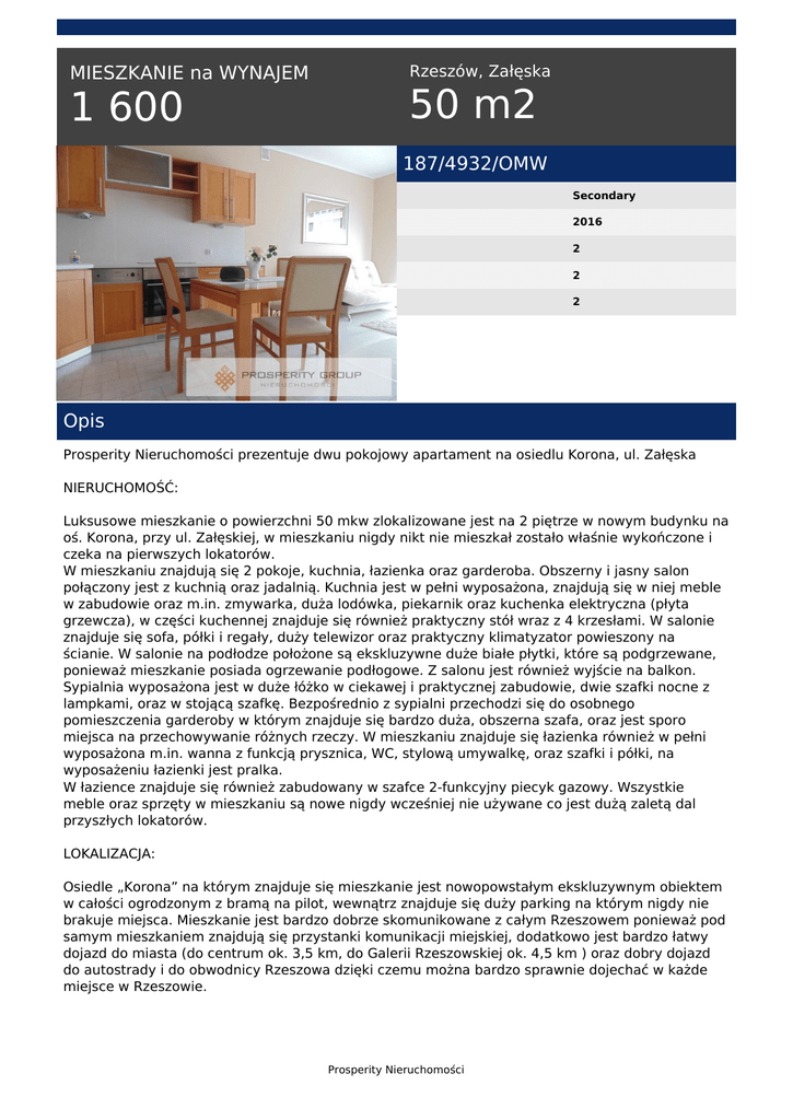 MIESZKANIE na WYNAJEM 1 600 Rzeszów, Załęska 50 m2 187/4932/OMW Secondary 2016 2 2 2 Opis Prosperity Nieruchomości prezentuje dwu pokojowy apartament na osiedlu Korona, ul. Załęska NIERUCHOMOŚĆ: Luksusowe mieszkanie o powierzchni 50 mkw zlokalizowane jest na 2 piętrze w nowym budynku na oś. Korona, przy ul. Załęskiej, w mieszkaniu nigdy nikt nie mieszkał zostało właśnie wykończone i czeka na pierwszych lokatorów. W mieszkaniu znajdują się 2 pokoje, kuchnia, łazienka oraz garderoba. Obszerny i jasny salon połączony jest z kuchnią oraz jadalnią. Kuchnia jest w pełni wyposażona, znajdują się w niej meble w zabudowie oraz m.in. zmywarka, duża lodówka, piekarnik oraz kuchenka elektryczna (płyta grzewcza), w części kuchennej znajduje się również praktyczny stół wraz z 4 krzesłami. W salonie znajduje się sofa, półki i regały, duży telewizor oraz praktyczny klimatyzator powieszony na ścianie. W salonie na podłodze położone są ekskluzywne duże białe płytki, które są podgrzewane, ponieważ mieszkanie posiada ogrzewanie podłogowe. Z salonu jest również wyjście na balkon. Sypialnia wyposażona jest w duże łóżko w ciekawej i praktycznej zabudowie, dwie szafki nocne z lampkami, oraz w stojącą szafkę. Bezpośrednio z sypialni przechodzi się do osobnego pomieszczenia garderoby w którym znajduje się bardzo duża, obszerna szafa, oraz jest sporo miejsca na przechowywanie różnych rzeczy. W mieszkaniu znajduje się łazienka również w pełni wyposażona m.in. wanna z funkcją prysznica, WC, stylową umywalkę, oraz szafki i półki, na wyposażeniu łazienki jest pralka. W łazience znajduje się również zabudowany w szafce 2-funkcyjny piecyk gazowy. Wszystkie meble oraz sprzęty w mieszkaniu są nowe nigdy wcześniej nie używane co jest dużą zaletą dal przyszłych lokatorów. LOKALIZACJA: Osiedle „Korona” na którym znajduje się mieszkanie jest nowopowstałym ekskluzywnym obiektem w całości ogrodzonym z bramą na pilot, wewnątrz znajduje się duży parking na którym nigdy nie brakuje miejsca. Mieszkanie jest bardzo dobrze skomunikowane z całym Rzeszowem ponieważ pod samym mieszkaniem znajdują się przystanki komunikacji miejskiej, dodatkowo jest bardzo łatwy dojazd do miasta (do centrum ok. 3,5 km, do Galerii Rzeszowskiej ok. 4,5 km ) oraz dobry dojazd do autostrady i do obwodnicy Rzeszowa dzięki czemu można bardzo sprawnie dojechać w każde miejsce w Rzeszowie. Prosperity Nieruchomości CENA: 1600zł + media według zużycia Mieszkanie wolne od zaraz, zapraszam do pooglądania mieszkania. KONTAKT: Hubert Skrzypek 662 556 171 [email protected] Prosperity Nieruchomości ul. Bandurskiego 24/1 31-515 Kraków www.prosperitynieruchomosci.pl www.prosperity-group.pl Hubert Skrzypek tel. 662 556 171 email: [email protected] Prosperity Nieruchomości Powered by TCPDF (www.tcpdf.org)