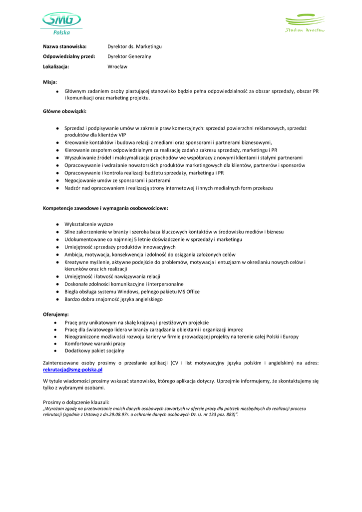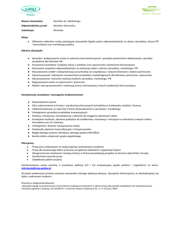 Nazwa stanowiska: Dyrektor ds. Marketingu Odpowiedzialny przed: Dyrektor Generalny Lokalizacja: Wrocław Misja: Głównym zadaniem osoby piastującej stanowisko będzie pełna odpowiedzialnośd za obszar sprzedaży, obszar PR i komunikacji oraz marketing projektu. Główne obowiązki: Sprzedaż i podpisywanie umów w zakresie praw komercyjnych: sprzedaż powierzchni reklamowych, sprzedaż produktów dla klientów VIP Kreowanie kontaktów i budowa relacji z mediami oraz sponsorami i partnerami biznesowymi, Kierowanie zespołem odpowiedzialnym za realizację zadao z zakresu sprzedaży, marketingu i PR Wyszukiwanie źródeł i maksymalizacja przychodów we współpracy z nowymi klientami i stałymi partnerami Opracowywanie i wdrażanie nowatorskich produktów marketingowych dla klientów, partnerów i sponsorów Opracowywanie i kontrola realizacji budżetu sprzedaży, marketingu i PR Negocjowanie umów ze sponsorami i parterami Nadzór nad opracowaniem i realizacją strony internetowej i innych medialnych form przekazu Kompetencje zawodowe i wymagania osobowościowe: Wykształcenie wyższe Silne zakorzenienie w branży i szeroka baza kluczowych kontaktów w środowisku mediów i biznesu Udokumentowane co najmniej 5 letnie doświadczenie w sprzedaży i marketingu Umiejętnośd sprzedaży produktów innowacyjnych Ambicja, motywacja, konsekwencja i zdolnośd do osiągania założonych celów Kreatywne myślenie, aktywne podejście do problemów, motywacja i entuzjazm w określaniu nowych celów i kierunków oraz ich realizacji Umiejętnośd i łatwośd nawiązywania relacji Doskonałe zdolności komunikacyjne i interpersonalne Biegła obsługa systemu Windows, pełnego pakietu MS Office Bardzo dobra znajomośd języka angielskiego Oferujemy: Pracę przy unikatowym na skalę krajową i prestiżowym projekcie Pracę dla światowego lidera w branży zarządzania obiektami i organizacji imprez Nieograniczone możliwości rozwoju kariery w firmie prowadzącej projekty na terenie całej Polski i Europy Komfortowe warunki pracy Dodatkowy pakiet socjalny Zainteresowane osoby prosimy o przesłanie aplikacji (CV i list motywacyjny języku polskim i angielskim) na adres: [email protected] W tytule wiadomości prosimy wskazad stanowisko, którego aplikacja dotyczy. Uprzejmie informujemy, że skontaktujemy się tylko z wybranymi osobami. Prosimy o dołączenie klauzuli: „Wyrażam zgodę na przetwarzanie moich danych osobowych zawartych w ofercie pracy dla potrzeb niezbędnych do realizacji procesu rekrutacji (zgodnie z Ustawą z dn.29.08.97r. o ochronie danych osobowych Dz. U. nr 133 poz. 883)”.
