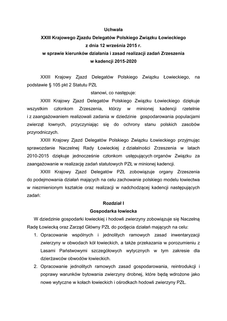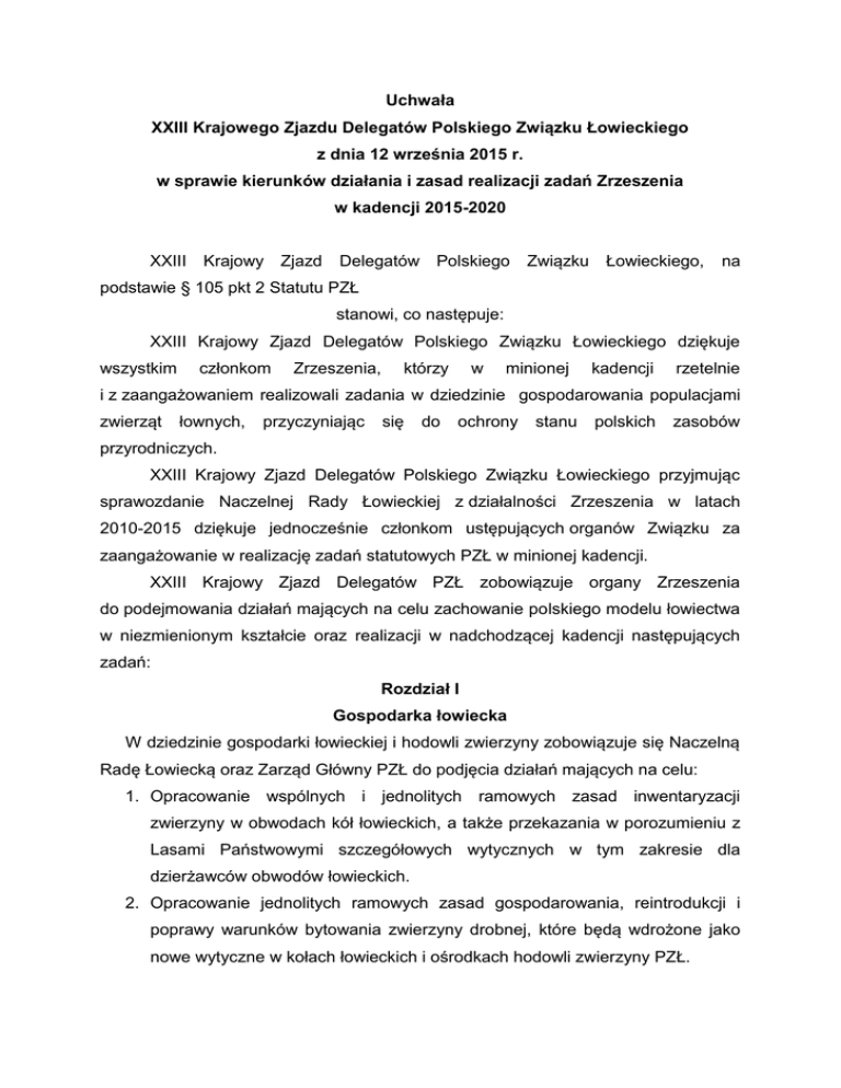 Uchwała XXIII Krajowego Zjazdu Delegatów Polskiego Związku Łowieckiego z dnia 12 września 2015 r. w sprawie kierunków działania i zasad realizacji zadań Zrzeszenia w kadencji 2015-2020 XXIII Krajowy Zjazd Delegatów Polskiego Związku Łowieckiego, na podstawie § 105 pkt 2 Statutu PZŁ stanowi, co następuje: XXIII Krajowy Zjazd Delegatów Polskiego Związku Łowieckiego dziękuje wszystkim członkom Zrzeszenia, którzy w minionej kadencji rzetelnie i z zaangażowaniem realizowali zadania w dziedzinie gospodarowania populacjami zwierząt łownych, przyczyniając się do ochrony stanu polskich zasobów przyrodniczych. XXIII Krajowy Zjazd Delegatów Polskiego Związku Łowieckiego przyjmując sprawozdanie Naczelnej Rady Łowieckiej z działalności Zrzeszenia w latach 2010-2015 dziękuje jednocześnie członkom ustępujących organów Związku za zaangażowanie w realizację zadań statutowych PZŁ w minionej kadencji. XXIII Krajowy Zjazd Delegatów PZŁ zobowiązuje organy Zrzeszenia do podejmowania działań mających na celu zachowanie polskiego modelu łowiectwa w niezmienionym kształcie oraz realizacji w nadchodzącej kadencji następujących zadań: Rozdział I Gospodarka łowiecka W dziedzinie gospodarki łowieckiej i hodowli zwierzyny zobowiązuje się Naczelną Radę Łowiecką oraz Zarząd Główny PZŁ do podjęcia działań mających na celu: 1. Opracowanie wspólnych i jednolitych ramowych zasad inwentaryzacji zwierzyny w obwodach kół łowieckich, a także przekazania w porozumieniu z Lasami Państwowymi szczegółowych wytycznych w tym zakresie dla dzierżawców obwodów łowieckich. 2. Opracowanie jednolitych ramowych zasad gospodarowania, reintrodukcji i poprawy warunków bytowania zwierzyny drobnej, które będą wdrożone jako nowe wytyczne w kołach łowieckich i ośrodkach hodowli zwierzyny PZŁ. 3. Wypracowanie nowych, jednolitych dla całego kraju, zasad selekcji osobniczej i populacyjnej zwierząt łownych oraz zasad postępowania przy ocenie prawidłowości odstrzału. 4. Dążenie do wprowadzenia partycypacji Skarbu Państwa w wypłacanych odszkodowaniach za szkody w uprawach i płodach rolnych. 5. Z uwagi na zagrożenia występowania na terenie Polski wirusa afrykańskiego pomoru świń, dążenie do ograniczenia populacji dzika i utrzymania jej liczebności na stałym poziomie ok. 200 tys. osobników. 6. W związku z rosnącą populacją łosia oraz szkodami w gospodarce leśnej i rolnej, powodowanymi przez ten gatunek, dążenie do zmiany rozporządzenia Ministra Środowiska poprzez przywrócenie okresu polowania na łosia w województwach: podlaskim, lubelskim, warmińsko-mazurskim oraz na wschód od Wisły w woj. mazowieckim, kujawsko-pomorskim i pomorskim. 7. Opracowanie i wydanie „Kodeksu Dobrej Praktyki Łowieckiej”, który będzie zawierał zasady prowadzenia gospodarki łowieckiej w zgodzie z ochroną środowiska przyrodniczego, racjonalną gospodarką rolną, leśną i rybacką w poszanowaniu tradycji, kultury i zwyczajów łowieckich. 8. Doprowadzenie do wprowadzenia na listę gatunków łownych i redukcji niektórych gatunków ptaków, zwłaszcza krukowatych, będących obecnie na liście gatunków chronionych, których ekspansja stanowi zagrożenie dla innych zwierząt dziko żyjących, szczególnie w rejonach objętych programem ochrony i rozwoju populacji zwierzyny drobnej. Rozdział II Organizacja W dziedzinie organizacji zobowiązuje się Naczelną Radę Łowiecką oraz Zarząd Główny PZŁ do podjęcia działań mających na celu: 9. Utrzymanie i rozwijanie ścisłej współpracy z Państwowym Gospodarstwem Leśnym Lasy Państwowe, Państwową Strażą Łowiecką, Państwową Strażą Rybacką oraz Strażą Graniczną w celu ograniczenia kłusownictwa na terenie całego kraju. 10. Utrzymanie i rozwijanie współpracy z Policją, w tym między innymi w zakresie informowania Polskiego Związku Łowieckiego przez organy Policji o każdej decyzji administracyjnej dotyczącej cofnięcia pozwolenia do posiadania broni palnej do celów łowieckich. 11. Umożliwienie udziału w polowaniach osobom poruszającym się na wózkach inwalidzkich, a nie mającym innych możliwości polowania niż w pozycji siedzącej. 12. Powołanie przez Naczelną Radę Łowiecką Funduszu celowego na rzecz prawnej ochrony dobrego imienia łowiectwa oraz członków Polskiego Związku Łowieckiego. Rozdział III Szkolenie W dziedzinie szkolenia zobowiązuje się Naczelną Radę Łowiecką oraz Zarząd Główny PZŁ do podjęcia działań mających na celu: 13. Systematyczne pracowników podnoszenie etatowych PZŁ kwalifikacji oraz oraz działaczy wiedzy kół i umiejętności łowieckich poprzez organizację kursów doskonalących z różnych dziedzin, w tym lektorskich i instruktorsko-sędziowskich. 14. Ujednolicenie systemu egzaminowania dla kandydatów do PZŁ i selekcjonerów poprzez stworzenie centralnej bazy zagadnień tematycznych oraz pytań testowych i ustnych. 15. Wprowadzanie nowoczesnych metod dydaktycznych i pomocy naukowych, w tym prezentacji multimedialnych i filmów instruktażowo – edukacyjnych. Rozdział IV Kynologia myśliwska W dziedzinie kynologii myśliwskiej zobowiązuje się Naczelną Radę Łowiecką oraz Zarząd Główny PZŁ do podjęcia działań mających na celu: 16. Kontynuowanie kompleksowego systemu układania oraz oceny pracy psów myśliwskich. 17. Kontynuowanie procesu wprowadzania zasady, iż wszystkie koła łowieckie pozyskujące zwierzynę grubą posiadają co najmniej jednego psa ułożonego do tropienia i poszukiwania postrzałków. 18. Promowanie klubów specjalistycznych poszczególnych grup ras psów myśliwskich, ze szczególnym uwzględnieniem upowszechniania ich działalności nastawionej na popularyzację idei polowania z profesjonalnie ułożonym psem myśliwskim. Rozdział V Strzelectwo W dziedzinie strzelectwa myśliwskiego zobowiązuje się Naczelną Radę Łowiecką oraz Zarząd Główny PZŁ do podjęcia 