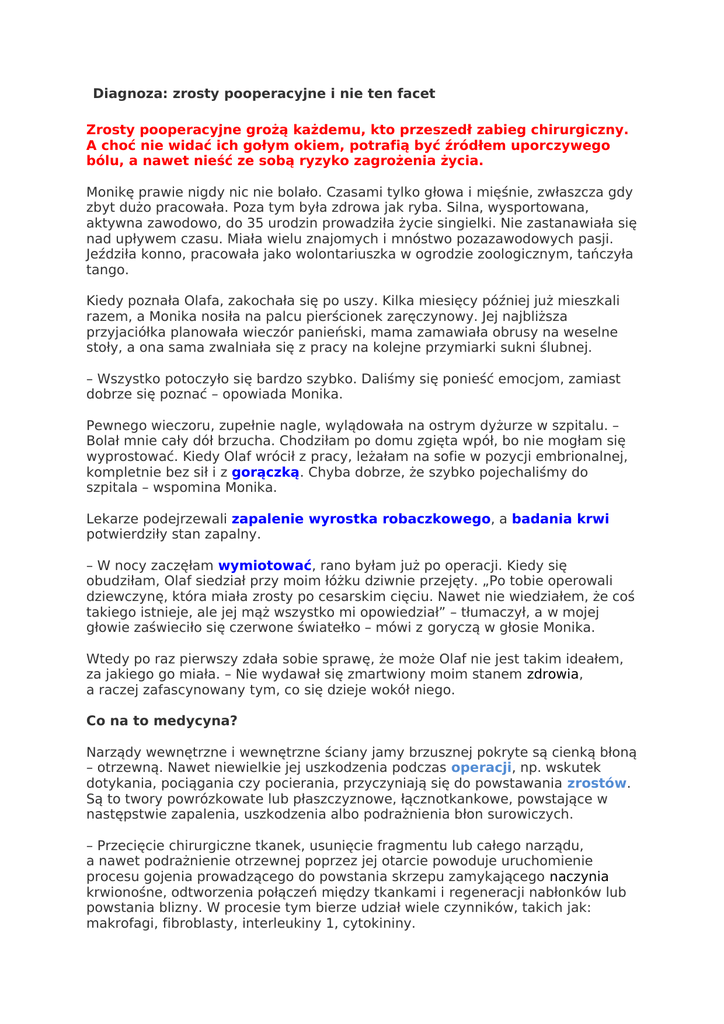 Diagnoza: zrosty pooperacyjne i nie ten facet Zrosty pooperacyjne grożą każdemu, kto przeszedł zabieg chirurgiczny. A choć nie widać ich gołym okiem, potrafią być źródłem uporczywego bólu, a nawet nieść ze sobą ryzyko zagrożenia życia. Monikę prawie nigdy nic nie bolało. Czasami tylko głowa i mięśnie, zwłaszcza gdy zbyt dużo pracowała. Poza tym była zdrowa jak ryba. Silna, wysportowana, aktywna zawodowo, do 35 urodzin prowadziła życie singielki. Nie zastanawiała się nad upływem czasu. Miała wielu znajomych i mnóstwo pozazawodowych pasji. Jeździła konno, pracowała jako wolontariuszka w ogrodzie zoologicznym, tańczyła tango. Kiedy poznała Olafa, zakochała się po uszy. Kilka miesięcy później już mieszkali razem, a Monika nosiła na palcu pierścionek zaręczynowy. Jej najbliższa przyjaciółka planowała wieczór panieński, mama zamawiała obrusy na weselne stoły, a ona sama zwalniała się z pracy na kolejne przymiarki sukni ślubnej. – Wszystko potoczyło się bardzo szybko. Daliśmy się ponieść emocjom, zamiast dobrze się poznać – opowiada Monika. Pewnego wieczoru, zupełnie nagle, wylądowała na ostrym dyżurze w szpitalu. – Bolał mnie cały dół brzucha. Chodziłam po domu zgięta wpół, bo nie mogłam się wyprostować. Kiedy Olaf wrócił z pracy, leżałam na sofie w pozycji embrionalnej, kompletnie bez sił i z gorączką. Chyba dobrze, że szybko pojechaliśmy do szpitala – wspomina Monika. Lekarze podejrzewali zapalenie wyrostka robaczkowego, a badania krwi potwierdziły stan zapalny. – W nocy zaczęłam wymiotować, rano byłam już po operacji. Kiedy się obudziłam, Olaf siedział przy moim łóżku dziwnie przejęty. „Po tobie operowali dziewczynę, która miała zrosty po cesarskim cięciu. Nawet nie wiedziałem, że coś takiego istnieje, ale jej mąż wszystko mi opowiedział” – tłumaczył, a w mojej głowie zaświeciło się czerwone światełko – mówi z goryczą w głosie Monika. Wtedy po raz pierwszy zdała sobie sprawę, że może Olaf nie jest takim ideałem, za jakiego go miała. – Nie wydawał się zmartwiony moim stanem zdrowia, a raczej zafascynowany tym, co się dzieje wokół niego. Co na to medycyna? Narządy wewnętrzne i wewnętrzne ściany jamy brzusznej pokryte są cienką błoną – otrzewną. Nawet niewielkie jej uszkodzenia podczas operacji, np. wskutek dotykania, pociągania czy pocierania, przyczyniają się do powstawania zrostów. Są to twory powrózkowate lub płaszczyznowe, łącznotkankowe, powstające w następstwie zapalenia, uszkodzenia albo podrażnienia błon surowiczych. – Przecięcie chirurgiczne tkanek, usunięcie fragmentu lub całego narządu, a nawet podrażnienie otrzewnej poprzez jej otarcie powoduje uruchomienie procesu gojenia prowadzącego do powstania skrzepu zamykającego naczynia krwionośne, odtworzenia połączeń między tkankami i regeneracji nabłonków lub powstania blizny. W procesie tym bierze udział wiele czynników, takich jak: makrofagi, fibroblasty, interleukiny 1, cytokininy. W konsekwencji miejsce zranienia pokrywa się warstwą włóknika, zamykając uszkodzoną tkankę. Jest to efekt korzystny, niekiedy ratujący nasze życie. Równolegle jednak włóknik może pokrywać sąsiadujące tkanki, powodując powstawanie nieprawidłowych połączeń dających dolegliwości, a niekiedy i dysfunkcję zagrażającą życiu – wyjaśnia dr n. med. Andrzej Wojtyś. Zrosty mogą więc prowadzić do sklejenia się tkanek między sobą. Bywa, że nie powodują żadnych komplikacji przez wiele lat i nie dają dolegliwości. Mogą być jednak przyczyną uciążliwego bólu – przewlekłego lub nawracającego, umiejscowionego najczęściej w podbrzuszu. Świeża rana ma prawo boleć Mama Moniki powtarzała jej, że w dzisiejszych czasach wycięcie wyrostka to zabieg kosmetyczny i nie powinna się niczym martwić. Ona jednak nie czuła się dobrze. – Przy wypisie ze szpitala mówiłam lekarzowi, że dokuczają mi bóle podbrzusza. Usłyszałam, że świeża rana ma prawo boleć, a dolegliwości z czasem będą mniejsze. Niestety, tak się nie stało, choć przestrzegałam zaleceń. Nie nosiłam nic ciężkiego, niczego nie podnosiłam, starałam się oszczędzać, wzięłam zwolnienie w pracy – opowiada Monika. Po 40 dniach od operacji wróciła do normalnego trybu życia. Poszła do pracy, przygotowania do ślubu znowu ruszyły pełną parą, jej przyjaciółka wyznaczyła kolejny termin wieczoru panieńskiego. – Wychodziłam właśnie z pracy, kiedy złapał mnie ból tak silny, że nie byłam w stanie się ruszyć. Stałam na korytarzu i nie mogłam zrobić kroku, zlana potem i zgięta wpół. Koleżanka wezwała pogotowie, trafiłam na izbę przyjęć. Olaf przyjechał po kilku godzinach wyraźnie niezadowolony. Sugerował, że brzuch może mnie boleć ze stresu, bo pewnie boję się ślubu. Powiedziałam mu wtedy, żeby poszedł do diabła, skoro tylko tyle ma mi do powiedzenia – mówi rozżalona Monika. Po tamtym incydencie narzeczony wyprowadził się z jej mieszkania. – Nie miałam wtedy sił zastanawiać się, czy jest obrażony. Za bardzo mnie bolało. Byłam u chirurga, ginekologa, urologa, na USG brzucha, zrobiono mi mnóstwo badań. Po dwóch tygodniach postawiono diagnozę – zrosty pooperacyjne. Dostałam antybiotyk i środki rozkurczowe. Leków przeciwbólowych miałam się wystrzegać. Chirurg tłumaczył mi wtedy, że bóle z czasem powinny ustępować. Radził, byśmy poczekali trzy miesiące. Jeśli ból nadal będzie bardzo silny, być może trzeba będzie ponownie operować – wspomina. Co na to medycyna? Zrosty zwykle tworzą się w ciągu tygodnia po zabiegu operacyjnym. Kiedy się pojawią i niosą ze sobą dolegliwości bólowe, można je usunąć, ale tylko podczas dodatkowego zabiegu. Niestety, on również obarczony jest ryzykiem powstania kolejnych zrostów. Naukowcy wykazali w badaniach, że u 79% pacje