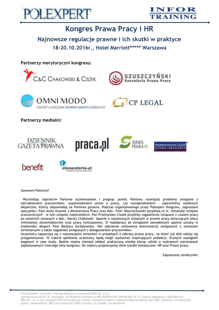 Kongres Prawa Pracy i HR Najnowsze regulacje prawne i ich skutki w praktyce 18-20.10.2016r., Hotel Marriott***** Warszawa Partnerzy merytoryczni kongresu: Partnerzy medialni: Szanowni Państwo! Wychodząc naprzeciw Państwa oczekiwaniom i pragnąc pomóc Państwu rozwiązać problemy związane z zatrudnianiem pracowników, wypowiadaniem umów o pracę, czy wynagradzaniem - zaprosiliśmy wybitnych ekspertów, którzy odpowiedzą na Państwa pytania. Podczas organizowanego przez Polexpert Kongresu, zaproszeni specjaliści: Pani Anita Gwarek z Ministerstwa Pracy oraz Mec. Piotr Wojciechowski przybliżą m.in. tematykę urlopów pracowniczych - w tym urlopów rodzicielskich, Pan Przemysław Ciszek przybliży zagadnienia związane z czasem pracy po ostatnich zmianach a Mec. Maciej Chakowski opowie o najnowszych zmianach w prawie pracy dotyczących płacy minimalnej zleceniobiorców oraz pracy tymczasowej. O współpracy ze związkami zawodowymi opowie uznany w środowisku ekspert Pani Barbara Surdykowska. Nie zabraknie omówienia kontrowersji związanych z umowami terminowymi a także zagadnień związanych z delegowaniem pracowników. Uczestnicy zapoznają się z najnowszymi zmianami w przepisach z zakresu prawa pracy, na które już dziś należy się przygotowywać. W trakcie spotkania uczestnicy będą mogli wysłuchać inspirujących prelekcji, licznych wystąpień bogatych w case study. Będzie można również zdobyć praktyczną wiedzę biorąc udział w wybranych warsztatach zaplanowanych trzeciego dnia kongresu. Do wyboru proponujemy dwie ścieżki tematyczne: HR oraz Prawo pracy. Zapraszamy serdecznie! Filie Polexpert oraz Infor Training działają w strukturach BDO Sp. z o.o. Sąd Rejonowy dla M. St. Warszawy, XIII Wydział Gospodarczy KRS 0000293339, NIP108-000-42-12, Kapitał zakładowy 1.000.000 PLN. BDO Sp. z o. o.jest członkiem BDO International Limited, brytyjskiej spółki i częścią międzynarodowej sieci BDO, złożonej z niezależnych spółek członkowskich. BDO jest nazwą sieci BDO i każdej z jej spółek członkowskich I dzień wykładów – 18.10.2016 Rejestracja Uczestników i Kawa powitalna - 09.00 – 09.45 Uroczyste powitanie Uczestników kongresu – 09.45 – 10.00 1. Zmiany w prawie pracy 2016/17 – płaca minimalna i praca tymczasowa – Dr Maciej Chakowski, godz. 10.00 – 11.00 a) Planowane zmiany w ustawie o zatrudnianiu pracowników tymczasowych 2017 - Ograniczenia dla tzw. „pączkujących agencji” – zasada 18 miesięcy na pracodawcę użytkownika - Nowe możliwości kontrolne dla marszałków województw – odprowadzanie składek na ZUS przez APT - Ewentualne gwarancje finansowe dla APT - Zmiany w zakresie ustawy o promocji zatrudnienia – nowe sankcje - Nowe sankcje wykroczeniowe dla pracodawców użytkowników i agencji pracy b) Planowane zmiany w zakresie płacy minimalnej zleceniobiorców 2016 - Nowa minimalna stawka godzinowa dla zleceniobiorców - W jakich przypadkach jest obowiązek jej stosowania - Obowiązkowa ewidencja czasu pracy dla zleceniobiorców - Nowe sankcje od PIP 2. Czas pracy pracowników działów handlowych 2016 - Przemysław Ciszek, godz. 11.15-12.15 a) System zadaniowego czasu pracy pracownika mobilnego – czy moja organizacja stosuje go właściwie (lista kontrolna)? b) Czas dojazdu „od domu do miejsca pracy”, a czas pracy, c) Czas pracy w delegacji pracowników „terenowych” d) Pojęcie „zapewnienia miejsca wykonywania czynności przez pracodawcę”, e) Rekompensata pracy w godzinach nadliczbowych – argumentacja w potencjalnym procesie 3. Umowy terminowe – problemy i kontrowersje – Mec. Michał Szuszczyński, godz. 12.30 – 13.30 a) Rozbieżności wokół metody liczenia okresu 33 miesięcy zatrudnienia terminowego b) Co w praktyce oznacza „obiektywna przyczyna leżąca po stronie pracodawcy” uzasadniająca zawarcie umowy terminowej z pominięciem limitów wynikających z kodeksu pracy? c) Cel zawiadomienia Państwowej Inspekcji Pracy o zawarciu umowy terminowej z powołaniem na istnienie „obiektywnej przyczyny leżącej po stronie pracodawcy” oraz uprawnienia Państwowej Inspekcji Pracy związane z tym zawiadomieniem. d) Okresy wypowiedzenia umów zawartych na czas określony trwających w dniu wejścia znowelizowanych przepisów oraz umów zawartych po tej dacie – niedopatrzenie ustawodawcy czy celowe zróżnicowanie sytuacji pracowników? e) Przekroczenie limitu 33 miesięcy w sytuacji przedłużenia okresu obowiązywania umowy terminowej do dnia porodu. f) Limit 33 miesięcy a urlop bezpłatny pracownika. g) Przejście zakładu pracy lub jego części na nowego pracodawcę, a okresy zatrudnienia terminowego u poprzedniego pracodawcy. Obiad – 13.30 – 14.30 4. Zmiany w ustawie o związkach zawodowych – Barbara Surdykowska, godz. 14.30 – 15.30 a) Rozszerzenie prawa do zrzeszania się na osoby zatrudnione cywilnoprawnie b) Określenie zasad współpracy pracodawcy z zakładowymi organizacjami związkowymi - nowe zasady reprezentatywności c) Kierunki rozwoju zbiorowego prawa pracy: od pracowniczego zbiorowego prawa pracy ku zbiorowemu prawu zatrudnienia Filie Polexpert oraz Infor Training działają w strukturach BDO Sp. z o.o. Sąd Rejonowy dla M. St. Warszawy, XIII Wydział Gospodarczy KRS 0000293339, NIP108-000-42-12, Kapitał zakładowy 1.000.000 PLN. BDO Sp. z o. o.jest członkiem BDO International Limited, brytyjskiej spółki i częścią międzynarodowej sieci BDO, złożonej z niezależnych spółek członkowskich. BDO jest nazwą sieci BDO i każdej z jej spółek członkowskich 5. Wynagrodzenia w najnowszym orzecznictwie Sądu Najwyższego - Łukasz Prasołek, godz. 15.45 – 16.45 a) Kiedy sąd pracy może miarkować wynagrodzenie za nadgodziny? b) Czy żądanie wypłaty premii przez pracownika może być uznane za sprzeczne z zasadami współżycia społecznego? c) Czy prawo do premii rocznej nabędzie pracownik, który nie przepracował całego roku? d) Czy można