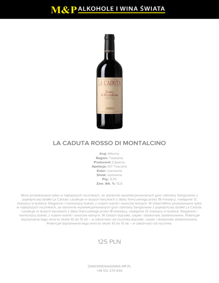LA CADUTA ROSSO DI MONTALCINO Kraj: Włochy Region: Toskania Producent: Caparzo Apelacja: IGT Toscana Kolor: czerwone Smak: wytrawne Poj.: 0,75 Zaw. Alk. %: 13,5 Wino produkowane tylko w najlepszych rocznikach, ze starannie wyselekcjonowanych gron odmiany Sangiovese z pojedynczej działki La Caduta. Leżakuje w dużych beczkach z dębu francuskiego przez 18 miesięcy, następnie 12 miesięcy w butelce. Elegancki i harmonijny bukiet, z nutami wanilii i owoców leśnych. W UstachWino produkowane tylko w najlepszych rocznikach, ze starannie wyselekcjonowanych gron odmiany Sangiovese z pojedynczej działki La Caduta. Leżakuje w dużych beczkach z dębu francuskiego przez 18 miesięcy, następnie 12 miesięcy w butelce. Elegancki i harmonijny bukiet, z nutami wanilii i owoców leśnych. W Ustach dojrzałe, ciepłe i doskonale zbalansowane. Potencjał dojrzewania tego wina to około 10 do 15 lat – w zależności od rocznika.dojrzałe, ciepłe i doskonale zbalansowane. Potencjał dojrzewania tego wina to około 10 do 15 lat – w zależności od rocznika. 125 PLN [email protected] +48 512 270 830