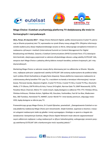 Mega-Choice i Eutelsat uruchamiają platformę TV dedykowaną dla treści informacyjnych i rozrywkowych Akra, Paryż, 25 stycznia 2017 – Mega-Choice Network Digital, spółka stowarzyszona Crystal TV, pierwszej w Ghanie prywatnej sieci TV, wprowadza na rynek Ghany nową usługę DTH. Oficjalna informacja została wydana przy okazji międzynarodowego szczytu w Akrze, dotyczącego zarządzania treściami w nadawaniu cyfrowym i mediach (International Summit on Content Management for Digital Broadcasting and Media). Zawarty z Eutelsat Communications (NYSE Euronext Paris: ETL) dziesięcioletni kontrakt, obejmujący pojemność w zakresie afrykańskiego obszaru usług satelity EUTELSAT 16A, wesprze start Mega-Choice z pokaźną ofertą dobrze znanych kanałów, zarówno krajowych, jak i międzynarodowych. Marketing Mega-Choice w zakresie nowej oferty skierowany jest na odbiorców w Ghanie. Wysoka moc, najlepsze pokrycie i popularność satelity EUTELSAT 16A zostaną wykorzystane do podbicia kolejnych rynków Afryki Zachodniej w drugiej fazie ekspansji. Nowa platforma rozpoczyna nadawanie ze zróżnicowaną ofertą kanałów FTA i pay TV, z naciskiem na kanały o tematyce informacyjnej i rozrywkowej. Pierwsze kanały, Aljazeera English, Crystal TV Prime, Crystal TV Xtra, Crystal TV Plus, Deutsche Welle, E TV Ghana, EWTN Africa & Asia, France 24 English, Narrow Gate TV, GMP Newsworld, CGTN, Paradise Music Channel, Metro TV i wiele innych, będą dostępne w odbiorze FTA i FTV. Filmbox Africa, Filmbox Arthouse, Filmbox Action, Fightbox HD, Docubox, FashionBox, Fast & Fun Box, Madscreen Box, 360 Tunebox, Homeland TV, AMNET, Junior World TV i inne kanały premium, włączając treści VOD, będą dostępne w ofercie pay TV. Przewodniczący grupy Mega-Choice, Dr Crystal-Djirackor, powiedział: „Zaangażowanie Eutelsat w rozwój platformy nadawczej Mega-Choice jest niesamowite. Dzięki Eutelast, wyprawa w kosmos z naszymi usługami nadawczymi stała się gładka i mniej wymagająca. Działając w oparciu o bogate doświadczenia i kompetencje Eutelsat, Mega-Choice Digital Network może obecnie zagwarantować swym odbiorcom najlepsze z usług nadawczych w Afryce Subsaharyjskiej, wzbogacając zarazem pozycję satelitarną EUTELSAT 16A o konkurencyjne treści wysokiej jakości.” www.eutelsat.com – Dołącz do nas na Twitter @Eutelsat_SA lub Facebook Eutelsat.SA Michel Azibert, dyrektor Eutelsat ds rozwoju i reklamy, dodał: „Cieszymy się, że wraz z uruchomieniem nowej platformy na satelicie EUTELSAT 16A, nasza współpraca z Mega-Choice osiągnęła kolejny poziom. Dzięki temu możemy być częścią drużyny, która pomoże Mega-Choice spełnić obietnice o cyfrowej jakości usług, różnorodności oferty programowej i afrykańskich treściach.” O Mega-Choice Digital Network Mega-Choice Digital Network, spółka stowarzyszona Crystal Radiovision Network (CRYSTAL TV), działa jako cyfrowa platforma telewizji satelitarnej, dostarczająca usługi nadawcze DTH. Przy współpracy z Crystal TV, Mega-Choice oferuje usługi DTT odbiorcom w Ghanie i całej Afryce Subsaharyjskiej. Mając w swej ofercie ponad 36 kanałów w jakości SD i HD w dostępie FTA i pay TV, Mega-Choice Digital wykorzystuje najnowszą technologię transmisyjną DVB-S2/T2. Platforma wciąż dysponuje wol nym miejscem dla kolejnych programów. Dzięki najnowocześniejszym możliwościom emisyjnym i usługom teleportu w zakresie dystrybucji i kontrybucji treści, Mega-Choice Digital uważany jest za dominującego dostawcę usług na rynku nadawczym Afryki, z nieodpartą i zróżnicowaną, światowej klasy ofertą programową w sektorze rozrywki i informacji. Kontakt z Mega-Choice w Akrze: Dział prasowy Sarah Twinkle Djirackor Tel: + 233 57 229 1675, [email protected] + 233 57 229 1683 Dział techniczny Prince Hari Crystal Tel: + 233 57 229 1687 [email protected] O Eutelsat Communications Założona w 1977 roku firma Eutelsat Communications (NYSE Euronext Paris: ETL, kod ISIN: FR0010221234) jest jednym z wiodących na świecie i najbardziej doświadczonych operatorów satelitów komunikacyjnych. Firma oferuje pojemność nadawczą na 39 satelitach klientom, wśród których są nadawcy i stowarzyszenia nadawców, operatorzy płatnej telewizji, dostawcy usług internetowych i wideo oraz przedsiębiorstwa i agencje rządowe. Satelity Eutelsat zapewniają pełen zasięg na Europę, Bliski Wschód, Afrykę, region Azji i Pacyfiku oraz obie Ameryki, umożliwiając szerokopasmową i rządową komunikację wideo, danych, niezależnie od lokalizacji użytkownika. Siedziba firmy znajduje się w Paryżu, a biura i teleporty zlokalizo wane są na całym świecie. Eutelsat zatrudnia 1000 mężczyzn i kobiet z 37 krajów, którzy będąc ekspertami w swych dziedzi nach, współpracują z klientami zapewniając najwyższą jakość świadczonych usług. Więcej informacji na: www.eutelsat.com Dział prasowy Vanessa O’Connor Tel: + 33 1 53 98 37 91 [email protected] Marie-Sophie Ecuer Tel: + 33 1 53 98 37 91 [email protected] Joanna Darlington Tel. : +33 1 53 98 35 30 [email protected] Cédric Pugni Tel. : +33 1 53 98 35 30 [email protected] Inwestorzy i analitycy www.eutelsat.com – Dołącz do nas na Twitter @Eutelsat_SA lub Facebook Eutelsat.SA www.eutelsat.com – Dołącz do nas na Twitter @Eutelsat_SA lub Facebook Eutelsat.SA