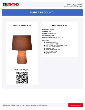 telefon: +48 61 4367 481 e-mail: [email protected] KARTA PRODUKTU ZDJĘCIE PRODUKTU OPIS PRODUKTU Producent Lucide Nazwa YODA Symbol 61561/40/36 Rekomendowana cena konsumencka 377.61 PLN Parametry ● średnica (mm): 400 ● wysokość (mm): 600 ● ilość źródeł / rodzaj trzonka: 2xE27 ● max moc źródła: 60 W ● napięcie: 230 V ● źródło w zestawie: brak ● kolor lampy: szary ● materiał: tkanina ● IP: 20 ZOBACZ WIĘCEJ DELighting ul.Budowlana 10 Psary Małe k. Wrześni, 62-300 Września www.delighting.pl