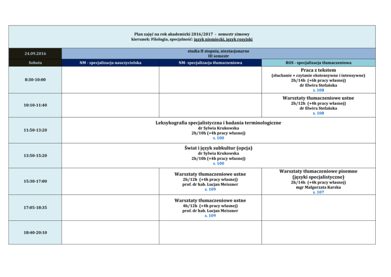 Plan zajęć na rok akademicki 2016/2017 - semestr zimowy kierunek: Filologia, specjalność: język niemiecki, język rosyjski studia II stopnia, niestacjonarne III semestr 24.09.2016 Sobota NM - specjalizacja nauczycielska NM- specjalizacja tłumaczeniowa ROS - specjalizacja tłumaczeniowa Praca z tekstem (słuchanie + czytanie ekstensywne i intensywne) 2h/14h (+6h pracy własnej) dr Elwira Stefańska s. 108 8:30-10:00 Warsztaty tłumaczeniowe ustne 2h/12h (+4h pracy własnej) dr Elwira Stefańska s. 108 10:10-11:40 Leksykografia specjalistyczna i badania terminologiczne 11:50-13:20 dr Sylwia Krukowska 2h/10h (+4h pracy własnej) s. 100 Świat i język subkultur (opcja) 13:50-15:20 dr Sylwia Krukowska 2h/10h (+4h pracy własnej) s. 100 Warsztaty tłumaczeniowe ustne 15:30-17:00 2h/12h (+4h pracy własnej) prof. dr hab. Lucjan Meissner s. 109 Warsztaty tłumaczeniowe ustne 17:05-18:35 18:40-20:10 4h/12h (+4h pracy własnej) prof. dr hab. Lucjan Meissner s. 109 Warsztaty tłumaczeniowe pisemne (języki specjalistyczne) 2h/14h (+4h pracy własnej) mgr Małgorzata Karska s. 107 studia II stopnia, niestacjonarne III semestr 25.09.2016 Niedziela NM - specjalizacja nauczycielska NM- specjalizacja tłumaczeniowa ROS - specjalizacja tłumaczeniowa Warsztaty tłumaczeniowe ustne (języki specjalistyczne) Występowanie publiczne 8:30-10:00 10:10-11:40 11:50-13:20 2h/14h (+4h pracy własnej) dr Marcin Michoń s. 112 Pisanie akademickie oraz znajomość struktur leksykalno-gramatycznych Pisanie akademickie oraz znajomość struktur leksykalno-gramatycznych Pisanie akademickie oraz znajomość struktur leksykalno-gramatycznych 2h/12h (+8h pracy własnej) mgr Ewa Voellnagel-Kasiak s. 107 2h/12h (+8h pracy własnej) mgr Ewa Voellnagel-Kasiak s. 107 2h/12h (+8h pracy własnej) dr Nadzieja Kuptel s. 113 Seminarium dyplomowe 13:50-15:20 15:30-17:00 17:05-18:35 18:40-20:10 2h/14h (+6h pracy własnej) dr Nadzieja Kuptel s. 107 2h/14h dr hab. Anna Just s. 107 Dydaktyka nauczania języka niemieckiego na III i IV etapie edukacyjnym 2h/40h (+20h pracy własnej) dr Joanna Sobańska-Jędrych s. 108 Dydaktyka nauczania języka niemieckiego na III i IV etapie edukacyjnym 4h/40h (+20h pracy własnej) dr Joanna Sobańska-Jędrych s. 108 Warsztaty tłumaczeniowe ustne (języki specjalistyczne) 2h/14h (+4h pracy własnej) dr Elwira Stefańska s. 113 Seminarium dyplomowe 2h/14h dr Elwira Stefańska s. 113 II stopień - III sem. 8.10.2016 Sobota NM - specjalizacja nauczycielska Praca z tekstem Praca z tekstem Praca z tekstem 8:30-10:00 (słuchanie + czytanie ekstensywne i intensywne) 2h/14h (+6h pracy własnej) dr Tomasz Ososiński (słuchanie + czytanie ekstensywne i intensywne) 2h/14h (+6h pracy własnej) dr Tomasz Ososiński (słuchanie + czytanie ekstensywne i intensywne) 4h/14h (+6h pracy własnej) dr Elwira Stefańska Występowanie publiczne Występowanie publiczne Warsztaty tłumaczeniowe ustne 2h/14h (+6h pracy własnej) dr Tomasz Ososiński 2h/14h (+6h pracy własnej) dr Tomasz Ososiński 4h/12h (+4h pracy własnej) dr Elwira Stefańska 10:10-11:40 11:50-13:20 13:50-15:20 15:30-17:00 17:05-18:35 18:40-20:10 NM- specjalizacja tłumaczeniowa ROS - specjalizacja tłumaczeniowa Leksykografia specjalistyczna i badania terminologiczne dr Sylwia Krukowska 4h/10h (+4h pracy własnej) Świat i język subkultur (opcja) dr Sylwia Krukowska 4h/10h (+4h pracy własnej) Warsztaty tłumaczeniowe ustne Występowanie publiczne 6h/12h (+4h pracy własnej) prof. dr hab. Lucjan Meissner 4h/14h (+6h pracy własnej) dr Nadzieja Kuptel Warsztaty tłumaczeniowe ustne 8h/12h (+4h pracy własnej) prof. dr hab. Lucjan Meissner II stopień - III sem. 9.10.2016 Niedziela NM - specjalizacja nauczycielska NM- specjalizacja tłumaczeniowa Warsztaty tłumaczeniowe ustne (języki specjalistyczne) 8:30-10:00 4h/14h (+4h pracy własnej) dr Elwira Stefańska Warsztaty tłumaczeniowe ustne (języki specjalistyczne) Pisanie akademickie oraz znajomość struktur leksykalno-gramatycznych 4h/14h (+4h pracy własnej) dr Marcin Michoń 4h/12h (+8h pracy własnej) dr Nadzieja Kuptel Pisanie akademickie oraz znajomość struktur leksykalno-gramatycznych Pisanie akademickie oraz znajomość struktur leksykalno-gramatycznych Warsztaty tłumaczeniowe pisemne (języki specjalistyczne) 4h/12h (+8h pracy własnej) mgr Ewa Voellnagel-Kasiak 4h/12h (+8h pracy własnej) mgr Ewa Voellnagel-Kasiak 4h/14h (+4h pracy własnej) mgr Małgorzata Karska 10:10-11:40 11:50-13:20 13:50-15:20 Seminarium dyplomowe 4h/14h dr hab. Anna Just Seminarium dyplomowe 4h/14h dr Elwira Stefańska 15:30-17:00 Dydaktyka nauczania języka niemieckiego na III i IV etapie edukacyjnym 6h/40h (+20h pracy własnej) dr Joanna Sobańska-Jędrych Warsztaty tłumaczeniowe pisemne (języki specjalistyczne) 17:05-18:35 Dydaktyka nauczania języka niemieckiego na III i IV etapie edukacyjnym 8h/40h (+20h pracy własnej) dr Joanna Sobańska-Jędrych Warsztaty tłumaczeniowe pisemne (języki specjalistyczne) 18:40-20:10 ROS - specjalizacja tłumaczeniowa 2h/14h (+4h pracy własnej) dr Marcin Michoń 4h/14h (+4h pracy własnej) dr Marcin Michoń II stopień - III sem. 22.10.2016 Sobota 8:30-10:00 10:10-11:40 NM - specjalizacja nauczycielska NM- specjalizacja tłumaczeniowa ROS - specjalizacja tłumaczeniowa Praca z tekstem Praca z tekstem Praca z tekstem (słuchanie + czytanie ekstensywne i intensywne) 4h/14h (+6h pracy własnej) dr Tomasz Ososiński s. 117 (słuchanie + czytanie ekstensywne i intensywne) 4h/14h (+6h pracy własnej) dr Tomasz Ososiński s. 117 (słuchanie + czytanie ekstensywne i intensywne) 6h/14h (+6h pracy własnej) dr Elwira Stefańska s. 109 Praca z tekstem Praca z tekstem (słuchanie + czytanie ekstensywne i intensywne) 6h/14h (+6h pracy własnej) dr Tomasz Ososiński s. 117 (słuchanie + czytanie ekstensywne i intensywne) 6h/14h (+6h pracy własnej) dr Tomasz Ososiński s. 117 Warsztaty tłumaczeniowe ustne 6h/12h (+4h pracy własnej) dr Elwira Stefańska s. 109 Leksykografia specja