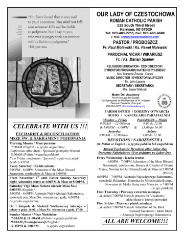 OUR LADY OF CZESTOCHOWA ROMAN CATHOLIC PARISH 115 South Third Street Harrison, NJ 07029 Tel: 973-483-2255, Fax: 973-483-4688 E-mail: [email protected] PASTOR / PROBOSZCZ Fr. Paul Molewski / Ks. Paweł Molewski PAROCHIAL VICAR / WIKARIUSZ Fr. / Ks. Marian Spanier RELIGIOUS EDUCATION - CCD DIRECTOR / DYREKTOR PROGRAMU KATECHETYCZNEGO Mrs. Marzena Żmuda - Dudek MUSIC DIRECTOR / DYREKTOR MUZYCZNY Mr. John Lepore SECRETARY / SEKRETARKA Mrs. Beata Wiklinski Mater Dei Academy Pre-K through 8th Grades Co-Sponsored for the Parishes of W. Hudson Deborah DeMattia, Principal 201-991-3271 http://mdacademy.org CELEBRATE WITH US !!! EUCHARIST & RECONCILIATION MSZE ŚW. & SAKRAMENT POJEDNANIA Morning Masses / Msze poranne: 7:00AM (English / w języku angielskim) Confessions after Mass / Spowiedź pomiędzy Mszami 8:00AM (Polish / w języku polskim) First Friday confession / Spowiedź w pierwsze piątki 6PM- 6:45PM Every Saturday / Każda sobota: 5:00PM - 6:00PM Adoration of the Most Blessed Sacrament, confessions & Mass at 6:00PM From November 1st until Easter Sunday Saturday night Adoration starts at 4:00PM & Mass at 5:00PM. Saturday Vigil Mass/ Sobota wieczór Msza Św.: 6:00PM (English ) 5:00PM - 6:00PM Adoracja Najświętszego Sakramentu, spowiedź oraz Msza Św. wieczorna o godz. 6:00PM (w języku angielskim) Od 1 listopada do Niedzieli Wielkanocnej Adoracja w soboty o godz. 16:00, a Msza Św. wieczorna o godz. 17:00. Sunday Masses / Msze Niedzielne: 7:30AM & 11:00AM (Polish / w języku polskim) 9:00AM [Youth-focused] (English / 12:15PM & 7:00PM w języku angielskim) PARISH OFFICE / GODZINY OTWARCIA HOURS / KANCELARII PARAFIALNEJ Monday -- Friday Poniedziałek -- Piątek 9:00AM – 12:00Noon 9:00 do 12:00 & 1:00PM – 4:00PM & 13:00 do 16:00 Saturday Sobota 9:00AM – 12:00Noon 9:00 do 12:00 DEVOTIONS / NABOŻEŃSTWA (in Polish or English / w języku polskim lub angielskim) Annual Eucharistic Devotions after Labor Day Doroczne Nabożeństwo 40-to godzinne po Labor Day. Every Wednesday / Każda środa: 6:00PM - 7:00PM Adoration of the Most Blessed Sacrament, confessions, Rosary & Chaplet of Divine Mercy, Novena to Our Blessed Lady & Mass at 7:00PM (Polish) 6:00PM – 7:00PM Adoracja Najświętszego Sakramentu, spowiedź, Różaniec i Koronka do Miłosierdzia Bożego, Nowenna do Matki Bożej oraz Msza św. o 7:00PM (w jęz. polskim) First Thursday / Pierwszy czwartek miesiąca …& added 7:00PM Mass & prayers for Vocations / także Msza w intencji powołań First Friday / Pierwszy piątek miesiąca …& added 7:00PM Mass & Adoration of the Most Blessed Sacrament / także Msza i Adoracja Najświętszego Sakramentu ALL ARE WELCOME!!! February 13, 2011 Our Lady of Czestochowa Parish, Harrison, NJ 6TH SUNDAY IN ORDINARY TIME / VI NIEDZIELA W OKRESIE ZWYKŁYM Saturday – Sobota – February 19 7:00AM O Boże łaski dla Łucji 8:00AM O powrót do zdrowia i Boże błogosławieństwo dla Ewy Boguckiej z okazji urodzin (Beata, Piotr & Konrad Wiklinski) Sunday – Niedziela – February 13 5:00Vigil 7TH SUNDAY IN ORDINARY TIME / VII NIEDZIELA W OKRESIE ZWYKŁYM + Rev. Joseph Sapeta 7:30AM 1) O zdrowie dla brata i rodziców (siostra) 2) + Henryk, Stanisław & Genowefa Robak (siostra i córka Elżbieta Wołosz z rodziną) + Kazimiera Parafińska (Krystyna) Sunday – Niedziela – February 20 5:00Vigil 9:00AM Youth Mass For good health & God’s blessings for Bronisław & Józefa Zajkowski on their 60th wedding anniversary For good health & God’s blessings for Ala Karwowska on her 67th Birthday (daughter) 7:30AM + Bronisław Kurcoń (córka) 9:00AM Youth Mass & CCD Classes „til 11:00AM + Peter Rogowski (family) 11:00AM 1) O zdrowie i Boże błogosławieństwo dla Jana Żmudy z okazji urodzin od dzieci z rodzinami 2) + Aniela Cacaj + Tadeusz Pawlicz (żona Eugenia z dziećmi) + Rose Fiorelli (Alicja i Zenon Boryszewski) 12:15PM + Bronisław & Martha Bielinski (daughter) 7:00PM + Wiktoria & Czesław 11:00AM 1) O zdrowie i Boże błogosławieństwo dla: - Ewy Boguckiej z okazji urodzin (córka Edyta Kozdra z rodziną) - Mateusz Głażewskiego z okazji 8.urodzin - Marzeny Żmuda – Dudek dziękczynno- błagalna z okazji urodzin 2) + Zofia Owsiannik – 5 rocz. (córka i wnuk z rodziną) + 12:15PM + Estella & Raymond Franklin (Zarbetski triplets) 7:00PM + Jessie Varano (Rich Suydam) Monday – Poniedziałek – February 14 7:00AM + Jan Sądej (wife & family) 8:00AM + Eleanor Antonaccio (Antonaccio Family) Tuesday – Wtorek – February 15 7:00AM + Rozalia, Piotr & Stefan 8:00AM + Mary Hoven (Laura Dombrowski & family) Wednesday – Środa – February 16 OFFERINGS: 7:00AM + Carl Maffia (Sue & Bruce Matonis) 8:00AM + Ludwika Dudek (Lidia Bizub) Host & Wine o zdrowie Mamy Adeli Pulkosnik od Jadwigi Laski Sanctuary Lamp in memory of + Mitchell Kozlowski from Rose Kozlowski Mass Candles in special intention Devotional Candles in special intention from Mr. & Mrs. Marcin Plich 6:00PM Adoracja Najświętszego Sakramentu, okazja do spowiedzi, Różaniec i Koronka do Miłosierdzia Bożego, Nowenna do Matki Bożej 7:00PM 13 Luty 2011 + Julia Mazurek & Jacek Mazurek – 1 rocz. (Ewa Bogucka z rodziną) + Cicchino & Czesnowicz Families, Diane & Helen (Regina Cicchino) “Before man are life and death, good and evil, whichever he chooses shall be given to him.” - Sirach 15:17 Thursday – Czwartek – February 17 7:00AM Father’s Day Novena Mass 8:00AM O zdrowie dla domowników (Grażyna) It seems that in this life we have an endless array of difficult choices always conflicting for our time and our attention. But in the end it is all very simple. Do we choose to give or do we choose to have? Do we choose to participate or do we choose to go our own way? Do we choose God or do we choose the world? Friday – Piątek – February 18 7:00AM For the people of the parish 8:00AM O Boże łaski dla Daniela 2 February 13, 2011 Our Lady of Czestochowa Parish, Harrison, NJ UPCOMING EVENTS LAST WEEK‟S DONATIONS: First collecti