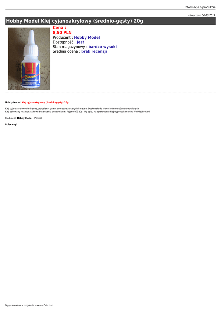 Informacje o produkcie Utworzono 04-03-2017 Hobby Model Klej cyjanoakrylowy (średnio-gęsty) 20g Cena : 8,50 PLN Producent : Hobby Model Dostępność : Jest Stan magazynowy : bardzo wysoki Średnia ocena : brak recenzji Hobby Model Klej cyjanoakrylowy (średnio-gęsty) 20g Klej cyjanoakrylowy do drewna, porcelany, gumy, tworzyw sztucznych i metalu. Doskonały do klejenia elementów fototrawionych. Klej pakowany jest w plastikowe buteleczki z dozownikiem. Pojemność 20g. Wg opisu na opakowaniu klej wyprodukowani w Wielkiej Brytanii Producent: Hobby Model (Polska) Polecamy! Wygenerowano w programie www.oscGold.com