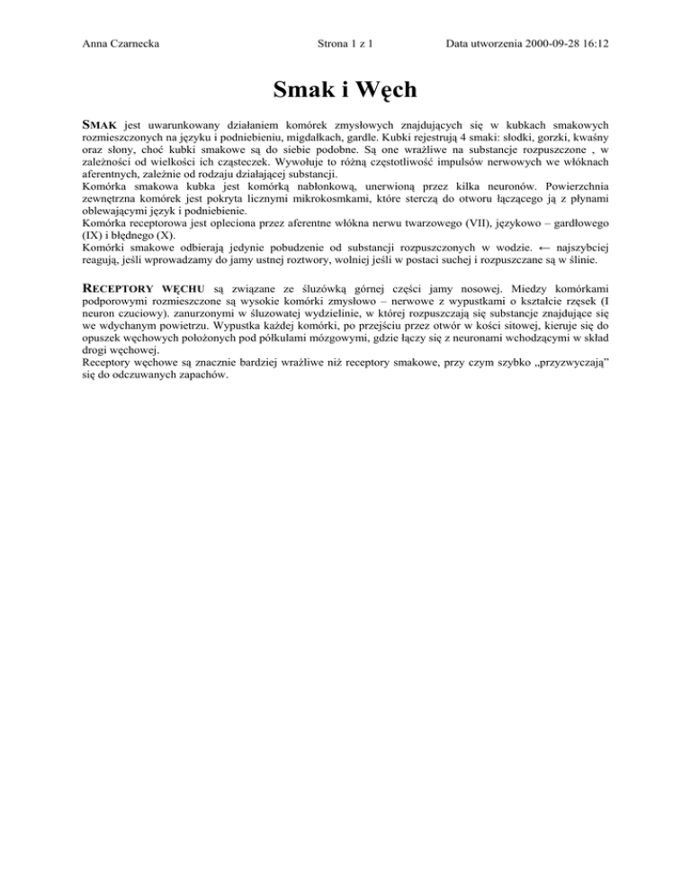 Anna Czarnecka Strona 1 z 1 Data utworzenia 2000-09-28 16:12 Smak i Węch SMAK jest uwarunkowany działaniem komórek zmysłowych znajdujących się w kubkach smakowych rozmieszczonych na języku i podniebieniu, migdałkach, gardle. Kubki rejestrują 4 smaki: słodki, gorzki, kwaśny oraz słony, choć kubki smakowe są do siebie podobne. Są one wrażliwe na substancje rozpuszczone , w zależności od wielkości ich cząsteczek. Wywołuje to różną częstotliwość impulsów nerwowych we włóknach aferentnych, zależnie od rodzaju działającej substancji. Komórka smakowa kubka jest komórką nabłonkową, unerwioną przez kilka neuronów. Powierzchnia zewnętrzna komórek jest pokryta licznymi mikrokosmkami, które sterczą do otworu łączącego ją z płynami oblewającymi język i podniebienie. Komórka receptorowa jest opleciona przez aferentne włókna nerwu twarzowego (VII), językowo – gardłowego (IX) i błędnego (X). Komórki smakowe odbierają jedynie pobudzenie od substancji rozpuszczonych w wodzie. ← najszybciej reagują, jeśli wprowadzamy do jamy ustnej roztwory, wolniej jeśli w postaci suchej i rozpuszczane są w ślinie. RECEPTORY WĘCHU są związane ze śluzówką górnej części jamy nosowej. Miedzy komórkami podporowymi rozmieszczone są wysokie komórki zmysłowo – nerwowe z wypustkami o kształcie rzęsek (I neuron czuciowy). zanurzonymi w śluzowatej wydzielinie, w której rozpuszczają się substancje znajdujące się we wdychanym powietrzu. Wypustka każdej komórki, po przejściu przez otwór w kości sitowej, kieruje się do opuszek węchowych położonych pod półkulami mózgowymi, gdzie łączy się z neuronami wchodzącymi w skład drogi węchowej. Receptory węchowe są znacznie bardziej wrażliwe niż receptory smakowe, przy czym szybko „przyzwyczają” się do odczuwanych zapachów.