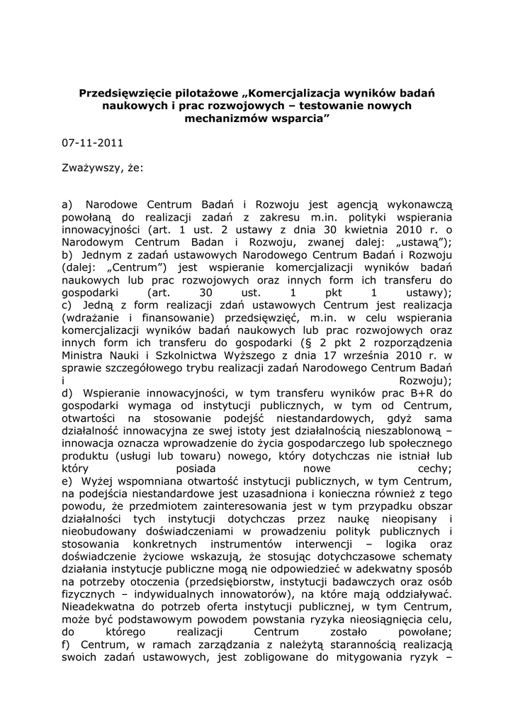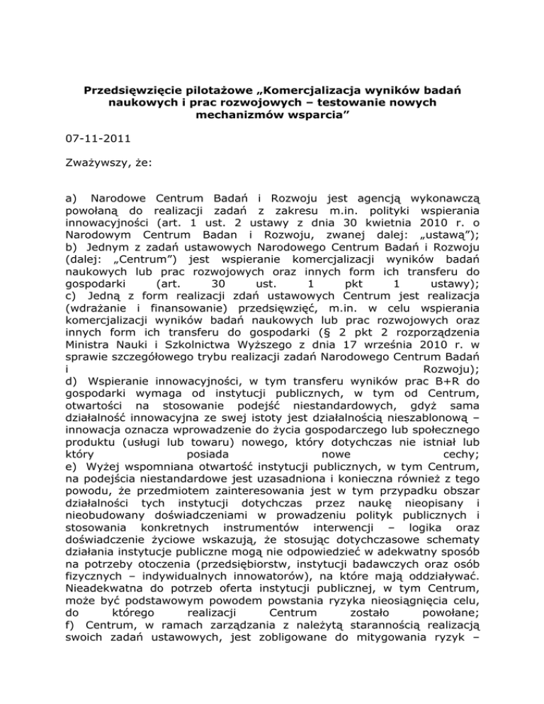 Przedsięwzięcie pilotażowe „Komercjalizacja wyników badań naukowych i prac rozwojowych – testowanie nowych mechanizmów wsparcia” 07-11-2011 Zważywszy, że: a) Narodowe Centrum Badań i Rozwoju jest agencją wykonawczą powołaną do realizacji zadań z zakresu m.in. polityki wspierania innowacyjności (art. 1 ust. 2 ustawy z dnia 30 kwietnia 2010 r. o Narodowym Centrum Badan i Rozwoju, zwanej dalej: „ustawą”); b) Jednym z zadań ustawowych Narodowego Centrum Badań i Rozwoju (dalej: „Centrum”) jest wspieranie komercjalizacji wyników badań naukowych lub prac rozwojowych oraz innych form ich transferu do gospodarki (art. 30 ust. 1 pkt 1 ustawy); c) Jedną z form realizacji zdań ustawowych Centrum jest realizacja (wdrażanie i finansowanie) przedsięwzięć, m.in. w celu wspierania komercjalizacji wyników badań naukowych lub prac rozwojowych oraz innych form ich transferu do gospodarki (§ 2 pkt 2 rozporządzenia Ministra Nauki i Szkolnictwa Wyższego z dnia 17 września 2010 r. w sprawie szczegółowego trybu realizacji zadań Narodowego Centrum Badań i Rozwoju); d) Wspieranie innowacyjności, w tym transferu wyników prac B+R do gospodarki wymaga od instytucji publicznych, w tym od Centrum, otwartości na stosowanie podejść niestandardowych, gdyż sama działalność innowacyjna ze swej istoty jest działalnością nieszablonową – innowacja oznacza wprowadzenie do życia gospodarczego lub społecznego produktu (usługi lub towaru) nowego, który dotychczas nie istniał lub który posiada nowe cechy; e) Wyżej wspomniana otwartość instytucji publicznych, w tym Centrum, na podejścia niestandardowe jest uzasadniona i konieczna również z tego powodu, że przedmiotem zainteresowania jest w tym przypadku obszar działalności tych instytucji dotychczas przez naukę nieopisany i nieobudowany doświadczeniami w prowadzeniu polityk publicznych i stosowania konkretnych instrumentów interwencji – logika oraz doświadczenie życiowe wskazują, że stosując dotychczasowe schematy działania instytucje publiczne mogą nie odpowiedzieć w adekwatny sposób na potrzeby otoczenia (przedsiębiorstw, instytucji badawczych oraz osób fizycznych – indywidualnych innowatorów), na które mają oddziaływać. Nieadekwatna do potrzeb oferta instytucji publicznej, w tym Centrum, może być podstawowym powodem powstania ryzyka nieosiągnięcia celu, do którego realizacji Centrum zostało powołane; f) Centrum, w ramach zarządzania z należytą starannością realizacją swoich zadań ustawowych, jest zobligowane do mitygowania ryzyk – przedsiębrania środków, które mogą zmniejszyć prawdopodobieństwo nieosiągnięcia celów, do których realizacji Centrum zostało powołane; g) Racjonalnym jest podejście, w którym Centrum, przygotowując się do decyzji o ewentualnym wprowadzeniu nowego instrumentu interwencji (programu w znaczeniu art. 2 pkt 2 ustawy), przed jego uruchomieniem przeprowadza przedsięwzięcie pilotażowe, którego celem jest przetestowanie nowego instrumentu interwencji i zweryfikowanie poprawności jego założeń, zasadności wprowadzenia (zapotrzebowania na interwencję publiczną) oraz przyjętego sposobu realizacji (m.in. mechanizmu wsparcia, sposobu realizacji); na podstawie § 2 pkt 2 rozporządzenia Ministra Nauki i Szkolnictwa Wyższego z dnia 17 września 2010 r. w sprawie szczegółowego trybu realizacji zadań Narodowego Centrum Badań i Rozwoju, w związku z art. 30 ust. 1 pkt 1 ustawy ustanawia się Przedsięwzięcie pilotażowe „Komercjalizacja wyników badań naukowych i prac rozwojowych – testowanie nowych mechanizmów wsparcia”. I. Cel główny Przedsięwzięcia pilotażowego: Celem głównym Przedsięwzięcia pilotażowego jest wsparcie komercjalizacji wyników prac badawczych i rozwojowych wypracowanych w publicznych organizacjach badawczych (uczelnie, instytuty badawcze, instytuty naukowe PAN), przedsiębiorstwach lub niezależnie – poza tymi organizacjami. II. Cele szczegółowe Przedsięwzięcia pilotażowego: 1. Identyfikacja specyficznych potrzeb młodych przedsiębiorców, zwłaszcza małych średnich, w zakresie komercjalizacji prac B+R, które nie wpisują się w aktualnie istniejące programy i schematy wsparcia oferowane przez Centrum i inne instytucje publiczne. 2. Przetestowanie w praktyce nowych, niestosowanych dotychczas instrumentów i sposobów wspierania komercjalizacji wyników prac badawczych i rozwojowych. 3. Identyfikacja niedoskonałości rynku (market failures) oraz luk lub niedoskonałości w ofercie instytucji publicznych, z powodu których specyficzne problemy przedsiębiorców oraz publicznych jednostek badawczych (uczelnie, instytuty badawcze, instytuty naukowe Polskiej Akademii Nauk) komercjalizujących wyniki prac badawczych i rozwojowych nie są rozwiązywane i tym samym stanowią przeszkodę dla komercjalizacji wyników B+R. 4. Stworzenie podstawy, w postaci wiedzy opartej na faktach, do podjęcia przez Centrum decyzji o ewentualnym ustanowieniu nowego programu lub programów w zakresie wsparcia komercjalizacji wyników B+R. III. Adresaci Przedsięwzięcia: Przedsięwzięcie zaadresowane jest do: a) b) c) d) e) przedsiębiorców, uczelni, instytutów badawczych, instytutów naukowych PAN, osób fizycznych – indywidualnych innowatorów. Preferencyjnie traktowani będą przedsiębiorcy mikro, mali i średni, w szczególności start-ups, które powstały w celu komercjalizacji wyników prac badawczych i rozwojowych. IV. Mechanizm interwencji i warunki udziału w Przedsięwzięciu: Rodzaj wsparcia oferowanego przez Centrum będzie zależał od konkretnych potrzeb adresata Przedsięwzięcia pilotażowego zakwalifikowanego do udziału w Przedsięwzięciu. Przyjmuje się, że wsparcie będzie co do zasady przekazywane w formie środków finansowych, ale nie wyklucza się innego rodzaju wsparcia, gdyby w przypadku konkretnego uczestnika Przedsięwzięcia okazało się to adekwatne do jego in
