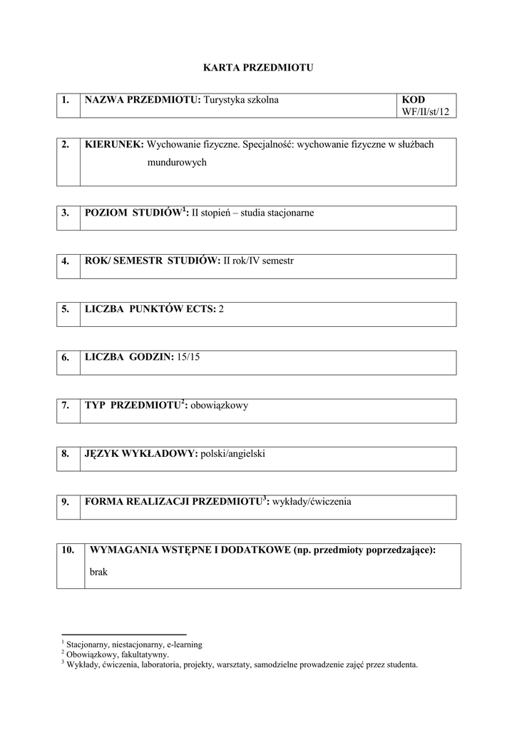 KARTA PRZEDMIOTU 1. NAZWA PRZEDMIOTU: Turystyka szkolna