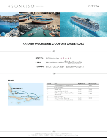 OFERTA KARAIBY WSCHODNIE Z/DO FORT LAUDERDALE STATEK: MS Westerdam LINIA: Holland America Line TERMIN: 08 LISTOPADA 2014 – 15 LISTOPADA 2014 TRASA Dzień 1 2 3 4 5 6 7 8 Port Fort Lauderdale (Floryda,USA) dzień na morzu Grand Turk San Juan (Puerto Rico) St. Thomas (Amerykańskie Wyspy Dziewicze) dzień na morzu Half Moon Cay (Bahamy) Fort Lauderdale (Floryda,USA) Wpłynięcie 08:00 12:00 Wypłynięcie 16:00 15:00 23:00 08:00 17:00 08:00 07:00 15:00 - SONRISO | Lipiński Passage | Al. Jero zo limskie 61 | 00-697 Warszawa tel. +48 22 206 45 00 | fax. +48 22 100 14 61 | e-mail: biuro @so nriso .pl | web: www.so nriso .pl OFERTA CENA Typ kabiny Cena z osobę Kabina wewnętrzna od 499 EUR Kabina z oknem od 549 EUR Kabina z balkonem od 649 EUR Superior Veranda Suite od 999 EUR CENA ZAWIERA DOTATKOWE OPŁATY zakwaterowanie w 2 - os. kabinie wybranej kategorii pełne wyżywienie: 3 posiłki, przekąski między posiłakmi, bufet o północy napoje do posiłków: woda stołowa, kawa, herbata oraz sok do śniadania serwis bagażowy podczas wejścia i zejścia ze statku 24 godzinny serwis kabinowy korzystanie z urządzeń sportowo - rekreacyjnych dostępnych na pokładzie (baseny, jacuzzi, boiska sportowe, kluby dla dzieci i młodzieży itp.) udział we wszystkich imprezach organizowanych na pokładzie (przedstawienia, pokazy, aukcje, animacje i inne) obowiązkowe opłaty portowe dojazd/przelot do portu rozpoczęcia i zakończenia rejsu transfery (lotnisko - port - lotnisko) ewentulne noclegi przed lub po rejsie wycieczki fakultatywne napoje: bezalkoholowe, alkoholowe, woda mineralna dostępne w restauracjach i barach (istnieje możliwość wykupienia pakietów napojów, o szczegóły zapytaj w biurze) korzystanie z mini baru w kabinie korzystanie z usług typu: SPA, salon piękności, pralnia itp. wydatki osobiste tj. zakupy w butikach, internet, kasyno itp. obowiązkowa opłata serwisowa (napiwki dla obsługi statku ok. 12,50 USD/os. dorosła/dzień, dzieci poniżej 3 lat nie płacą) obowiązkowe ubezpieczenie turystyczne koszt wymaganych wiz Na życzenie świadczymy dodatkowo usługi: rezerwacje hotelowe na całym świecie rezerwacje biletów lotniczych, trasferów oraz parkingu w porcie rezerwacje wycieczek fakultatywnych i innych atrakcji SONRISO | Lipiński Passage | Al. Jero zo limskie 61 | 00-697 Warszawa tel. +48 22 206 45 00 | fax. +48 22 100 14 61 | e-mail: biuro @so nriso .pl | web: www.so nriso .pl