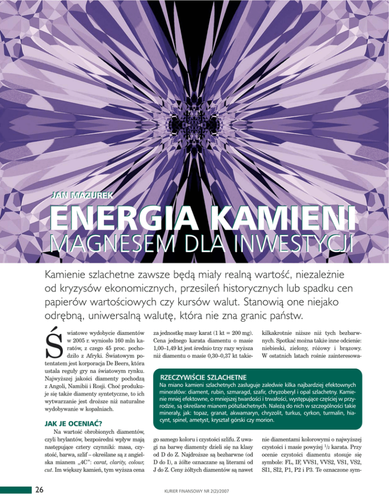 JAN MAZUREK ENERGIA KAMIENI MAGNESEM DLA INWESTYCJI Kamienie szlachetne zawsze b´dà mia∏y realnà wartoÊç, niezale˝nie od kryzysów ekonomicznych, przesileƒ historycznych lub spadku cen papierów wartoÊciowych czy kursów walut. Stanowià one niejako odr´bnà, uniwersalnà walut´, która nie zna granic paƒstw. wiatowe wydobycie diamentów w 2005 r. wynios∏o 160 mln karatów, z czego 45 proc. pochodzi∏o z Afryki. Âwiatowym potentatem jest korporacja De Beers, która ustala regu∏y gry na Êwiatowym rynku. Najwy˝szej jakoÊci diamenty pochodzà z Angoli, Namibii i Rosji. Choç produkuje si´ tak˝e diamenty syntetyczne, to ich wytwarzanie jest dro˝sze ni˝ naturalne wydobywanie w kopalniach.  JAK JE OCENIAå? Na wartoÊç obrobionych diamentów, czyli brylantów, bezpoÊredni wp∏yw majà nast´pujàce cztery czynniki: masa, czystoÊç, barwa, szlif – okreÊlane sà z angielska mianem ,,4C”: carat, clarity, colour, cut. Im wi´kszy kamieƒ, tym wy˝sza cena 26 za jednostk´ masy karat (1 kt = 200 mg). Cena jednego karata diamentu o masie 1,00–1,49 kt jest Êrednio trzy razy wy˝sza ni˝ diamentu o masie 0,30–0,37 kt takie- kilkakrotnie ni˝sze ni˝ tych bezbarwnych. Spotkaç mo˝na tak˝e inne odcienie: niebieski, zielony, ró˝owy i bràzowy. W ostatnich latach roÊnie zainteresowa- RZECZYWIÂCIE SZLACHETNE Na miano kamieni szlachetnych zas∏uguje zaledwie kilka najbardziej efektownych minera∏ów: diament, rubin, szmaragd, szafir, chryzoberyl i opal szlachetny. Kamienie mniej efektowne, o mniejszej twardoÊci i trwa∏oÊci, wyst´pujàce cz´Êciej w przyrodzie, sà okreÊlane mianem pó∏szlachetnych. Nale˝à do nich w szczególnoÊci takie minera∏y, jak: topaz, granat, akwamaryn, chryzolit, turkus, cyrkon, turmalin, hiacynt, spinel, ametyst, kryszta∏ górski czy morion. go samego koloru i czystoÊci szlifu. Z uwagi na barw´ diamenty dzieli si´ na klasy od D do Z. Najdro˝sze sà bezbarwne (od D do I), a ˝ó∏te oznaczane sà literami od J do Z. Ceny ˝ó∏tych diamentów sà nawet KURIER FINANSOWY NR 2(2)/2007 nie diamentami kolorowymi o najwy˝szej czystoÊci i masie powy˝ej 1/2 karata. Przy ocenie czystoÊci diamentu stosuje si´ symbole: FL, IF, VVS1, VVS2, VS1, VS2, SI1, SI2, P1, P2 i P3. Te oznaczone sym- INWESTUJEMY diamenty bolami FL i IF sà najczystsze, nie zawierajà widocznych pod lupà inkluzji (specyficznych chemicznych „zanieczyszczeƒ”) i dzi´ki temu uzyskuje si´ z nich najdro˝sze brylanty. 2003 r. wzros∏a o 20 proc. i wynosi oko∏o 12 tys. dolarów za karat. Kamienie szlachetne mo˝na nabyç na specjalnej gie∏dzie, poprzez jej akredytowanego cz∏onka, z którym ne- CHIMERYCZNY JAK DIAMENTY PRAWDZIWA RZADKOÂå gocjuje si´ warunki transakcji. Takie kupowanie diamentów praktycznie nie niesie ˝adnego ryzyka oszustwa. Ka˝dy mo˝e sprawdziç reputacj´ poÊrednika, który w jego imieniu b´dzie uczestniczy∏ w transakcji wymarzonego klejnotu. Najlepszym êród∏em danych o cenach brylantów jest cennik Rynek kamieni szlachetnych jest zdecydowanie mniej p∏ynny ni˝ rynek finansowy, towarowy, a nawet nieruchomoÊci. Znalezienie nabywcy, który by∏by sk∏onny zap∏aciç zadowalajàcà cen´, mo˝e zajàç du˝o czasu. Oferty kupna i sprzeda˝y diamentów na gie∏dach i aukcjach charakteryzuje du˝a rozpi´toÊç (spread). Nie mo˝na mieç pewnoÊci, ˝e za rok, pi´ç czy dziesi´ç lat otrzymamy wymarzony zysk. Dlatego nie nale˝y inwestowaç w kamienie szlachetne, je˝eli nie posiadamy odpowiednich oszcz´dnoÊci lub aktywów p∏ynnych pozwalajàcych na normalnà egzystencj´, szczególnie w trudnych okresach ˝ycia. Najlepszym sposobem na uchronienie si´ przed oszustwem jest pomoc rzeczoznawcy lub zawieranie transakcji wy∏àcznie poprzez licencjonowanego poÊrednika. List´ zawo- ,,Rapaport Diamond Report”. Wyceny brylantów mo˝na dokonaç równie˝ za pomocà kalkulatora internetowego (http://www.diamond.info). Innà formà inwestycji w kamienie szlachetne jest nabywanie akcji kopalƒ lub kontraktów terminowych na diamenty. Sà one jednak obarczone du˝ym dowych rzeczoznawców diamentów prowadzi Polskie Towarzystwo Gemmologiczne. Ka˝dy legalnie sprzedawany brylant na Êwiecie posiada certyfikat autentycznoÊci, wydawany przez uznanà organizacj´, np. International Gemmological Institute (IGI) lub Gemmological Institute of America (GIA). ■ Diament to najcenniejszy kamieƒ szlachetny. Jest to w´giel, a dok∏adniej – jego odmiana alotropowa, wykrystalizowana w uk∏adzie regularnym, w kszta∏cie oÊmioÊcianu, dwunastoÊcianu lub dwudziestoczteroÊcianu. Jest to najtwardszy materia∏ – 10 stopni w skali Mosha. Aby powsta∏ z w´gla diament, niezb´dna jest temperatura 1325°C oraz ciÊnienie 50 tys. kg/cm2 – to tak, jakby wie˝´ Eiffla postawiç na d∏oni. Goràczka diamentów rozpocz´∏a si´ w XIX wieku i trwa po dzieƒ dzisiejszy. Du˝e diamenty stanowià jedne z najcenniejszych klejnotów na Êwiecie. Najwi´kszy diament znaleziony w RPA w 1905 roku mia∏ mas´ 3106 karatów. Po dokonaniu podzia∏u na 103 cz´Êci i oszlifowaniu, najwi´kszà z nich o wadze 530,2 karatów osadzono w berle królowej Anglii. Nosi nazw´ Wielkiej Gwiazdy Afryki (Cullinan I). Diament to najrzadziej spotykany minera∏ w przyrodzie. Najlepsze pochodzà z Angoli, Namibii i Rosji. Surowe sà matowe, bez po∏ysku. Dopiero odpowiedni szlif wydobywa z nich ˝ycie, ˝ar i ogieƒ. Jedynie najlepszy szlifierz potrafi nadaç diamentowi taki kszta∏t, aby wnikajàce do jego wn´trza Êwiat∏o, po odbiciu si´ od jego Êcian, mog∏o byç wyemitowane w wiàzce pe∏nej refleksów i kolorów, podobnych do t´czy. Najbardziej popularne szlify diamentów to: okràg∏y, markiz, owal, ∏ezka, serce, szmaragd, ksi´˝niczka, kwadrat. W 1919, matematyk Marcel Tolkowski w swej publikacji okreÊli∏ proporcje okràg∏ego brylantu, który posiada 57 fasetek i tafl´. Inne popularne szlify to idealny praktyczn
