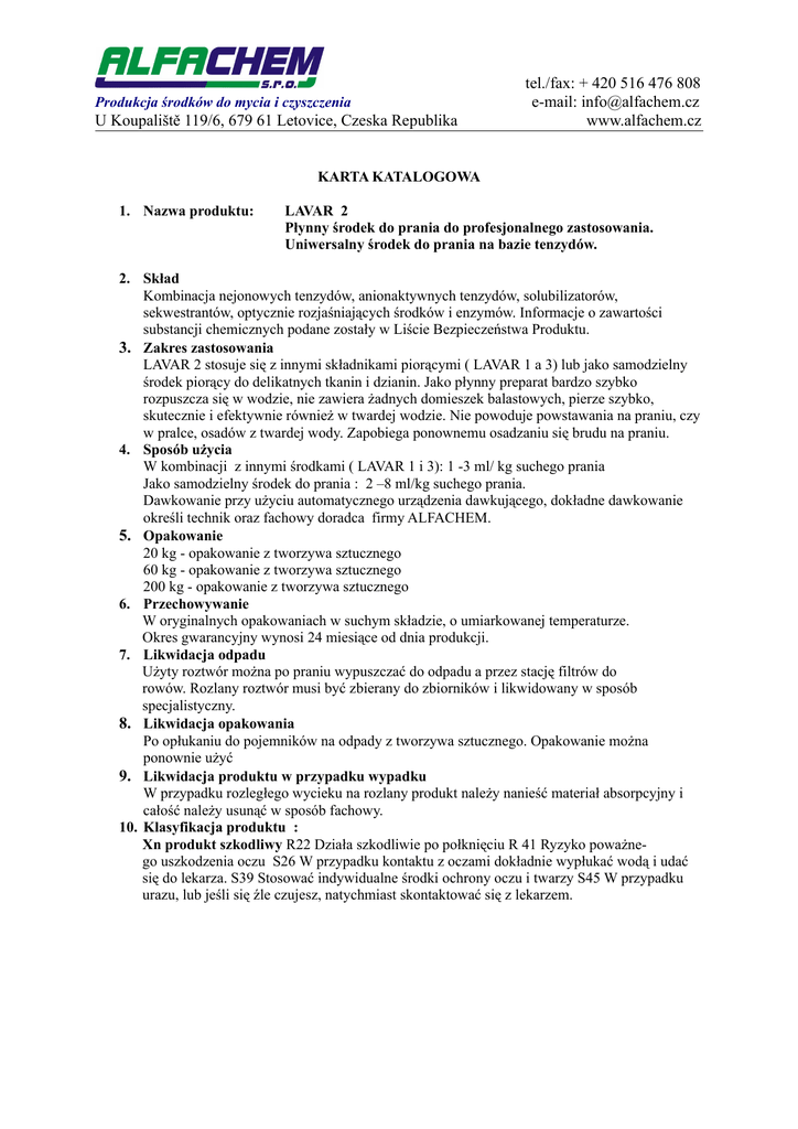 Produkcja środków do mycia i czyszczenia U Koupaliště 119/6, 679 61 Letovice, Czeska Republika tel./fax: + 420 516 476 808 e-mail: [email protected] www.alfachem.cz KARTA KATALOGOWA 1. Nazwa produktu: LAVAR 2 Płynny środek do prania do profesjonalnego zastosowania. Uniwersalny środek do prania na bazie tenzydów. 2. Skład Kombinacja nejonowych tenzydów, anionaktywnych tenzydów, solubilizatorów, sekwestrantów, optycznie rozjaśniających środków i enzymów. Informacje o zawartości substancji chemicznych podane zostały w Liście Bezpieczeństwa Produktu. 3. Zakres zastosowania LAVAR 2 stosuje się z innymi składnikami piorącymi ( LAVAR 1 a 3) lub jako samodzielny środek piorący do delikatnych tkanin i dzianin. Jako płynny preparat bardzo szybko rozpuszcza się w wodzie, nie zawiera żadnych domieszek balastowych, pierze szybko, skutecznie i efektywnie również w twardej wodzie. Nie powoduje powstawania na praniu, czy w pralce, osadów z twardej wody. Zapobiega ponownemu osadzaniu się brudu na praniu. 4. Sposób użycia W kombinacji z innymi środkami ( LAVAR 1 i 3): 1 -3 ml/ kg suchego prania Jako samodzielny środek do prania : 2 –8 ml/kg suchego prania. Dawkowanie przy użyciu automatycznego urządzenia dawkującego, dokładne dawkowanie określi technik oraz fachowy doradca firmy ALFACHEM. 5. Opakowanie 20 kg - opakowanie z tworzywa sztucznego 60 kg - opakowanie z tworzywa sztucznego 200 kg - opakowanie z tworzywa sztucznego 6. Przechowywanie W oryginalnych opakowaniach w suchym składzie, o umiarkowanej temperaturze. Okres gwarancyjny wynosi 24 miesiące od dnia produkcji. 7. Likwidacja odpadu Użyty roztwór można po praniu wypuszczać do odpadu a przez stację filtrów do rowów. Rozlany roztwór musi być zbierany do zbiorników i likwidowany w sposób specjalistyczny. 8. Likwidacja opakowania Po opłukaniu do pojemników na odpady z tworzywa sztucznego. Opakowanie można ponownie użyć 9. Likwidacja produktu w przypadku wypadku W przypadku rozległego wycieku na rozlany produkt należy nanieść materiał absorpcyjny i całość należy usunąć w sposób fachowy. 10. Klasyfikacja produktu : Xn produkt szkodliwy R22 Działa szkodliwie po połknięciu R 41 Ryzyko poważnego uszkodzenia oczu S26 W przypadku kontaktu z oczami dokładnie wypłukać wodą i udać się do lekarza. S39 Stosować indywidualne środki ochrony oczu i twarzy S45 W przypadku urazu, lub jeśli się źle czujesz, natychmiast skontaktować się z lekarzem.