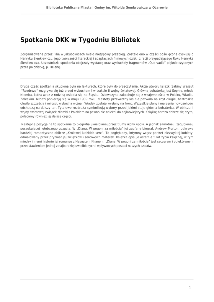 Biblioteka Publiczna Miasta i Gminy im. Witolda Gombrowicza w Ożarowie Spotkanie DKK w Tygodniu Bibliotek Zorganizowane przez Filię w Jakubowicach miało nietypowy przebieg. Zostało ono w części poświęcone dyskusji o Henryku Sienkiewiczu, jego twórczości literackiej i adaptacjach filmowych dzieł, z racji przypadającego Roku Henryka Sienkiewicza. Uczestniczki spotkania obejrzały wystawę oraz wysłuchały fragmentów „Quo vadis” pięknie czytanych przez polonistkę, p. Helenę. Druga część spotkania skupiona była na lekturach, które były do przeczytania. Akcja utworu książki Sabiny Waszut "Rozdroża" rozgrywa się tuż przed wybuchem i w trakcie II wojny światowej. Główną bohaterką jest Sophie, młoda Niemka, która wraz z rodziną osiedla się na Śląsku. Dziewczyna zakochuje się z wzajemnością w Polaku, Władku Zaleskim. Młodzi pobierają się w maju 1939 roku. Niestety przewrotny los nie pozwala na zbyt długie, beztroskie chwile szczęścia i miłości, wybucha wojna i Władek zostaje wysłany na front. Wszystkie plany i marzenia nowożeńców odchodzą na dalszy tor. Tytułowe rozdroża symbolizują wybory przed jakimi staje główna bohaterka. W obliczu II wojny światowej związek Niemki z Polakiem na pewno nie należał do najłatwiejszych. Książkę bardzo dobrze się czyta, polecamy również jej dalsze części. Następna pozycja na to spotkanie to biografia uwielbianej przez tłumy ikony epoki. A jednak samotnej i zagubionej, poszukującej głębszego uczucia. W „Diana. W pogoni za miłością” jej zaufany biograf, Andrew Morton, odkrywa bardziej romantyczne oblicze „Królowej ludzkich serc”. To pogłębiony, intymny wręcz portret niezwykłej kobiety, odmalowany przez pryzmat jej związków i sercowych rozterek. Książka opisuje ostatnie 5 lat życia księżnej, w tym między innymi historię jej romansu z Hasnatem Khanem. „Diana. W pogoni za miłością” jest szczerym i obiektywnym przedstawieniem jednej z najbardziej uwielbianych i wpływowych postaci naszych czasów. 1