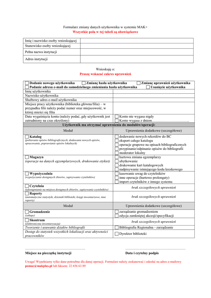 Formularz zmiany danych użytkownika w systemie MAK+ Wszystkie pola w tej tabeli są obowiązkowe Imię i nazwisko osoby wnioskującej Stanowisko osoby wnioskującej Pełna nazwa instytucji Adres instytucji Wnioskuję o: Proszę wskazać zakres uprawnień Dodanie nowego użytkownika Zmianę hasła użytkownika Zmianę uprawnień użytkownika Podanie adresu e-mail do samodzielnego zmieniania hasła użytkownika Usunięcie użytkownika Imię użytkownika Nazwisko użytkownika Służbowy adres e-mail użytkownika Miejsce pracy użytkownika (biblioteka główna/filia) – w przypadku filii należy podać numer oraz miejscowość, w której mieści się filia Data wygaśnięcia konta (należy podać, gdy użytkownik jest Konto nie wygasa nigdy zatrudniony na czas określony) Konto wygasa z dniem………………………….. Użytkownik ma otrzymać uprawnienia do modułów/operacji: Moduł Katalog (pobieranie opisów bibliograficznych, dodawanie nowych opisów, opracowanie, poprawianie opisów lokalnych) Magazyn (operacje na danych egzemplarzowych, drukowanie etykiet) Wypożyczalnia (wypożyczanie dostępnych zbiorów, zapisywanie czytelników) Czytelnia (udostępnianie na miejscu dostępnych zbiorów, zapisywanie czytelników) Raporty (automatyczne statystyki, dziennik biblioteki, księgi inwentarzowe, inne raporty) Moduł Gromadzenie (zakupy) Skontrum (elektroniczna inwentaryzacja) Tworzenie i usuwanie działów bibliografii Dostęp do statystek wszystkich lokalizacji oraz aktywności pracowników …………………………………………… Miejsce na pieczątkę instytucji Uprawnienia dodatkowe (szczegółowe) dodawanie nowych rekordów do BC eksport całego katalogu operacje grupowe na opisach bibliograficznych przypinanie/odpinanie opisów do bibliografii moderator lokalny hurtowa zmiana egzemplarzy ubytkowanie drukowanie kart katalogowych nadpisywanie istniejącego kodu kreskowego kasowanie uwag do czytelników inne operacje (hurtowe prolongaty) import czytelników z innego systemu brak szczegółowych uprawnień brak szczegółowych uprawnień Uprawnienia dodatkowe (szczegółowe) zarządzanie gromadzeniem edycja zamkniętej akcesji/specyfikacji brak szczegółowych uprawnień Bibliografia Regionalna - zarządzanie Dyrektor biblioteki …………………………………………… Data i czytelny podpis Uwaga! Wypełniamy tylko dane potrzebne dla danej operacji. Formularz należy zeskanować i odesłać na adres e-mailowy [email protected] lub faksem: 22 656 63 89