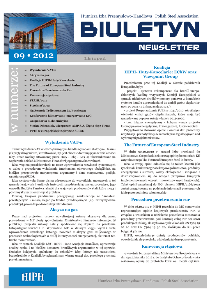 Hutnicza Izba Przemysłowo-Handlowa Polish Steel Association w numerze: 09 • 2012 Listopad Koalicja HIPH- Huty-Kancelarie: EChW oraz Viewpoint Group • Wyłudzenia VAT-u • Akcyza na gaz • Koalicja HIPH-Huty-Kancelarie • The Future of European Steel Industry • Procedura Przetwarzania Rur • Konwencja rtęciowa • STAHL'2012 • Steelmet'2012 • Na Zespole Trójstronnym ds. hutnictwa • Konferencja klimatyczno-energetyczna KIG • Gospodarka niskoemicyjna • Stefan Dzienniak, wiceprezes AMP S.A. żegna się z Firmą • PPTS w europejskiej incjatywie SPIRE Wyłudzenia VAT-u Przedmiotem prac tej Koalicji w okresie październik listopad br. były: · projekt systemu rekompensat dla branż energochłonnych (według wytycznych Komisji Europejskiej w sprawie niektórych środków pomocy państwa w kontekście systemu handlu uprawnieniami do emisji gazów cieplarnianych po 2012 r. z dnia 22 maja 2012 r. ), · projekt Rozporządzenia (UE) nr 1031/2010, określający wielkości emisji gazów cieplarnianych, które mają być sprzedawane poprzez aukcje w latach 2013-2020. · tzw. trójpak energetyczny - kolejna wersja projektu Ustawy prawo energetyczne, Prawo gazowe, Ustawa o OZE. Przygotowano stosowne opinie i wnioski dot. procedury notyfikacji i prenotyfikacji w ramach prac legislacyjnych nad wybranymi projektami ustaw. The Future of European Steel Industry Temat wyłudzeń VAT w wewnątrzunijnym handlu wyrobami stalowymi, takimi jak pręty zbrojeniowe, kształtowniki, itp. jest obecnie dominującym w działalności Izby. Prace Koalicji utworzonej przez Huty - Izbę - E&Y są ukierunkowane na wspieranie działań Ministerstwa Finansów i jego organów kontrolnych. Izba, wspiera przedsięwzięcia na rzecz wprowadzenia rozwiązań systemowych w walce z procederem wyłudzania (mechanizm odwrotnego obciążenia), na bieżąco przygotowuje merytoryczne argumenty i dane statystyczne, podjęła współpracę z PUDS. Izba wystosowała liczne pisma adresowane do wszystkich, znaczących w tej sprawie krajowych i unijnych instytucji, przedstawiając zasięg procederu, jego wagę dla Budżetu Państwa i skutki dla krajowych producentów stali, które mogą i powinny skutecznie rozwiązać problem. Dzisiaj, krajowi producenci przegrywają konkurencję ze "światem przestępczym" i muszą sięgać po trudne przedsięwzięcia (np. zatrzymywanie produkcji), prowadzące do redukcji zatrudnienia. Akcyza na gaz Prace nad projektem ustawy nowelizującej ustawę akcyzową dla gazu, prowadzone w MF uległy spowolnieniu. Ministerstwo Finansów informuje, że publikacji projektu ustawy należy spodziewać się dopiero na przełomie listopad/grudzień'2012 r. Wprawdzie MF w dalszym ciągu wyraża wolę wprowadzenia szerokiego katalogu zwolnień z akcyzy gazu zużywanego w procesach technologicznych o dużej intensywności energetycznej, ale temat ten trzeba monitorować. Izba, w ramach Koalicji: E&Y- HIPH - Inne Asocjacje Branżowe, opracowuje analizy rynku i na bieżąco dostarcza branżowych argumentów w tej sprawie. Szukając kolejnych, apelujemy do członków Izby, którzy nie uczestniczą bezpośrednio w Koalicji, by zgłaszali nam własne uwagi dot. przebiegu prac nad projektem ustawy. W dniu 30.10.2012 r. zarząd Izby przekazał do Ministerstwa Gospodarki sektorową opinię do materiału KE zatytułowanego The Future of European Steel Industry. Izba, w swojej opinii odniosła się do takich kwestii jak: rynek stali, konkurencyjność krajowego hutnictwa, produkty energetyczne i surowce, koszty ekologiczne i związane z dostosowywaniem się do nowych przepisów (unijnych implementowanych wprost i nowelizowanych krajowych). Tekst opinii przesłanej do MG, pismem HIPH/2166/2012 został przygotowany na podstawie informacji przekazanych Izbie przez podmioty członkowskie Procedura przetwarzania rur W dniu 16.10.2012 r. HIPH przesłała do MG stanowisko reprezentujące opinie krajowych producentów rur, w związku z wnioskiem o udzielenie pozwolenia stosowania procedury przetwarzania pod kontrolą celną rur bez szwu produkcji chińskiej, sklasyfikowanych w kodach CN 7304 19 10 20 oraz CN 7304 19 30 20, złożonym do KE przez bułgarską firmę, HIPH, uwzględniając opinię producentów polskich, opowiedziała się przeciwko udzieleniu takiego pozwolenia. Konwencja rtęciowa 4 września br. przesłaliśmy Ministerstwu Środowiska a w dn. 4 października 2012 r. do Instytutu Ochrony Środowiska sektorową opinię do protokołu ONZ ws. metali ciężkich. Hutnicza Izba Przemysłowo-Handlowa Polish Steel Association www.hiph.org Zgłosiliśmy potrzebę udziału przedstawicieli sektora w procesie przeglądowym Protokołu. Dotychczasowe prace, prowadzone w krajowym hutnictwie stalowym nt "emisji metali ciężkich" nie pozwalają na samodzielne wnioski, dlatego HIPH poparła stanowisko EUROFERu. Opowiedzieliśmy się za n/w metodami/technikami prowadzącymi do zmniejszenia emisji metali ciężkich: - spiekalnie, wdrożenie BAT 21 zmusza operatora instalacji do korzystania z surowców o niskiej zawartości rtęci (BAT nr 7), co pozwoli osiągnąć emisję Hg w granicach 0,03 -0,05 mg/Nm3, - elektryczny piec łukowy, wdrożenie procedury BAT 88 ograniczy emisję gazów powyżej 98 %, a to pozwoli osiągnąć poziom emisji rtęci poniżej 0,05 mg/Nm3. HIPH rozesłała do hut projekt konwencji rtęciowej oraz dokumenty dot. wartości progowych emisji odnoszących się do zdolności produkcyjnych instalacji, z prośbą o odniesienie się do nich. Branżowe stanowisko do tych dokumentów HIPH przekaże 21 listopada br. do MG. STAHL'2012 W dniach 8-9 listopada br., w Centrum Kongresowym CCD w Dusseldorfie, odbył się, międzynarodowy coroczny event STAHL'2012. Jego hasłem przewodnim był temat "Future starts with Steel". Event, jak co roku, cieszył się bardzo dużą frekwencją. Główne tematy tegorocznej konferencji to: zwrot w polityce energetycznej w Niemczech, polityka klimatyczna UE i, jak przezwyciężyć
