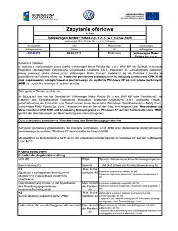 Zapytanie ofertowe Anfrage Volkswagen Motor Polska Sp. z o.o. w Polkowicach Volkswagen Motor Polska Sp. z o.o. in Polkowice Nr zapytania Data Miejscowość Zamawiający Anfragenummer Datum Ort Auftraggeber 62043379 08.03.2013 Polkowice Volkswagen Motor Polska Sp. z o.o. Szanowni Państwo, w związku z realizowanym przez spółkę Volkswagen Motor Polska Sp. z o.o. (VW MP lub Spółka), w ramach Programu Operacyjnego Innowacyjna Gospodarka, Działanie 4.5.1., Projektem pt. „Uruchomienie produkcji nowej generacji silnika diesla przez Volkswagen Motor Polska” zwracamy się do Państwa z prośbą o przedstawienie Państwa oferty na komputer pomiarowy przeznaczony do maszyny pomiarowej CFM 3010 oraz dopasowanie oprogramowania pomiarowego do wystemu Windows XP na linii wałów korbowych MDB na zgodnie z wymogami i opisem poniŜej. Sehr geehrte Damen und Herren, im Bezug auf das von der Gesellschaft Volkswagen Motor Polska Sp. z o.o. (VW MP oder Gesellschaft) im Rahmen des Operationellen Programms Innovative Wirtschaft Maβnahme 4.5.1 realisierte Projekt. „Inbetriebnahme der Produktion von Dieselmotoren neuer Generation (Modularer Dieselbaukasten – MDB) durch Volkswagen Motor Polska Sp. z o.o .” wenden wir uns an Sie mit der Bitte, Ihre Angebot über Messrechner zu Messmaschine CFM 3010 und Anpassung Messprograme zu Windows XP auf der Kurbelwelle Linie MDB gemäß der Anforderungen und Beschreibung wie unten abzugeben. Opis przedmiotu zamówienia / Beschreibung des Bestellungsgegenstandes Komputer pomiarowy przeznaczony do maszyny pomiarowej CFM 3010 oraz dopasowanie oprogramowania pomiarowego do wystemu Windows XP na linii wałów korbowych MDB Messrechner zu Messmaschine CFM 3010 und Anpassung Messprograme zu Windows XP auf der Kurbelwelle Linie MDB Kryteria oceny oferty Kriterien der Angebotsbeurteilung Opis (K) Beschreibung (K) K1 Zgodność z wymaganiami technicznymi określonymi w specyfikacji przedmiotu zamówienia Ȕbereinstimmung mit der, in der Spezifikation des Bestellungsgegenstandes bestimmteTechnikqualität K2 Termin dostawy wskazany przez VWMP Waga Sposób obliczenia punktów dla danego kryterium Gewicht Art Und Weise der Punktzahlberechnung für Max. liczba punktów: 40 Kryterium spełnione w całości: 40 pkt. Kryterium częściowo spełnione / kryterium niespełnione: 0 pkt. Max. Anzahl der Punkten: 40 Max. liczba punktów: 30 Kryterium vollständig ausgefüllt: 40 Pkt. Kryterium teilweise ausgefüllt: / Kryterium nicht ausgefüllt: 0 Pkt. Zgodność z terminem dostawy wymaganym przez Zamawiającego: 30 pkt. Częściowa lub całlkowita niezgodność z terminem dostawy wymaganym przez Zamawiającego: 0 pkt. Liefertermin, der vom Auftraggeber erfordert wird Max. Anzahl Übereinstimmung mit dem vom Auftraggeber erfordern der Punkten: Liefertermin: 30 Pkt. Teilweise Übereinstimmung und Unstimmigkeit mit dem vom 30 Auftraggeber erfordern Liefertermin: 0 Pkt. cena najniŜsza ---------------------------------------- x 30 = liczba punktów cena zadeklarowana przez Oferenta K3 Cena Max. liczba punktów: 30 Preis Max. Anzahl niedrigste Preis der Punkten: --------------------------------------------- x 30= Punktzahl 30 von dem Anbieter vorgeschalagener Preis Miejsce realizacji zamówienia / Ort der Bestellungsrealisierung Siedziba Volkswagen Motor Polska Sp z o. o.: ul. Strefowa 1, 59-101 Polkowice Termin oddania przez firmę maszyny do uŜytku klienta / Bertiebliche Übergabe TK/ KW 24/2013 , TK/ KW 24/2013 NajwaŜniejsze informacje dotyczące sposobu, terminu oraz miejsca składania ofert Die wichtigste Anmerkungen bezüglich der Art und Weise, Frist, sowie des Orts der Angebotsabgabe − Oferta powinna zostać złoŜona w formie pisemnej i zaadresowana na Volkswagen Motor Polska Sp. z o.o. z siedzibą w Polkowicach, ul. Strefowa 1, 59-101 Polkowice; _ Oferta powinna zostać złoŜona w terminie do dnia . 04.04.2013 r.; − KaŜda oferta powinna wskazywać termin waŜności. − Das Angebot soll im Schriftform eingerichtet werden und an Volkswagen Motor Polska Sp. z o.o. mit Sitz in Polkowice, ul. Strefowa 1, 59-101 Polkowice adressiert werden; _ Das Angebot soll bis zum 04.04.2013 r. abgegeben werden; − Jedes Angebot sollte auf ihre Geltungsdauer hinweisen. Inne istotne postanowienia / uwagi Andere relevante Bestimmungen / Anmerkungen Zamawiający zastrzega sobie moŜliwość negocjowania Ofert. O terminie ew. negocjacji Oferenci zostaną poinformowani w − odpowiednim czasie; − Der Auftraggeber behält sich das Recht vor, die Angeboten verhandeln zu können. Vom Termin der ev. Verhandlung werden die Anbieter in der ensprechenden Frist benachrichtigt; Osoba do kontaktu ze strony Zamawiającego Anprechpartner seitens des Auftraggebers Małgorzata Kruk, Specjalista ds. Handlu Zagranicznego i Zakupów Dawid Odrobina, Planowanie E-mail Telefon Adres [email protected] + 48 76 848 3264 Volkswagen Motor Polska Sp zoo ul. Strefowa 1, 59-101 Polkowice [email protected] + 48 76 8483945 Volkswagen Motor Polska Sp zoo ul. Strefowa 1, 59-101 Polkowice 1. Obowiązuje „Instrukcja organizacyjna nr 17 „Procedura zamówień w ramach projektu Uruchomienie produkcji nowej generacji silnika diesla (MDB – Modularer Dieselbaukasten) przez Volkswagen Motor Polska” („Instrukcja organizacyjna nr 17”), która stanowi integralną część niniejszego zapytania ofertowego. 2. Obowiązują Ogólne Warunki Zakupów VWMP. 3. Obowiązuje szczegółowa specyfikacja przedmiotu zamówienia (Lastenheft). Zusätzliche Bestimmungen: 1. Es gilt die Organisationsanweisung Nr 17 „Das Bestellungsverfahren im Rahmen des Projekts Inbetriebnahme der Produktion von Dieselmotoren neuer Generation (Modularer Dieselbaukasten – MDB) durch Volkswagen Motor Polska Sp. z o.o .“ („Organisationsanweisung Nr 17 ), die der integrale Teil dieser Angebotsanfrage ist. 2. Es gelten die allgemeine Verkaufsbedingungen von VWMP. 3. Es gilt die detaillierte Spezifikation des Gegenstandes der Bestellung (Lastenheft
