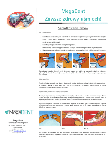 MegaDent Zawsze zdrowy uśmiech! Szczotkowanie zębów Jak szczotkować? 1. Szczoteczkę ustawiamy pod kątem 45 do powierzchni zębów i wykonujemy niewielkie okrężne o ruchy. Dzięki temu zewnętrzne rzędy włókien usuwają płytkę bakteryjną z przestrzeni międzyzębowych i dziąseł. 2. Szczotkujemy powierzchnie żującą każdego zęba. 3. Oczyszczamy wewnętrzną powierzchnię każdego zęba bocznego ruchami wymiatającymi. 4. Używając zakończenia szczoteczki, szczotkujemy tylną powierzchnię zębów górnych i dolnych. Szczotkować należy również język. Ostatnio uważa się także, że grzbiet języka jest jednym z głównych siedlisk drobnoustrojów w jamie ustnej i źródłem ich rozsiewania, szczególnie gdy pokryty jest nalotem. Jaka szczotka? Z małą główką co daje lepszy dostęp do tylnych zębów. Włókna powinny być miękkie, zaokrąglone i w kępkach. Nacisk szczotki 50g, lub z siłą trzech palców. Szczoteczkę wymieniamy po trzech miesiącach, czas szczotkowania 3-4 minuty Czyszczenie przestrzeni międzyzębowych! Znacząco częściej mamy ubytki próchnicowe między zębami, niż na środku powierzchni zęba. Dzieje się tak dlatego, że szczotką oczyszczamy płytkę nazębną głównie z powierzchni gładkich zęba. W wąskich przestrzeniach międzyzębowych mimo szczotkowania może zalegać płytka bakteryjna. Najskuteczniejszym środkiem do czyszczenia wąskich przestrzeni jest nić dentystyczna. Sposób posługiwania się nicią przedstawiają rysunki. Nitkę długości ok. 15 cm należy przesuwać od brzegu dziąsła ku brzegowi zęba. MegaDent Gabinet Stomatologiczny os. 2 Pułku Lotniczego 11A/1 31-869 Kraków tel. (12) 346 17 25 e-mail: [email protected] www.megadent.pl Rys.1 Rys.2 Rys.3 Na rysunku 3 pokazano nić do czyszczenia przestrzeni pod mostami protetycznymi. Sztywną końcówkę wprowadź pod przęsło mostu. Do czyszczenia używamy części puszystej poruszając w tył i do przodu.