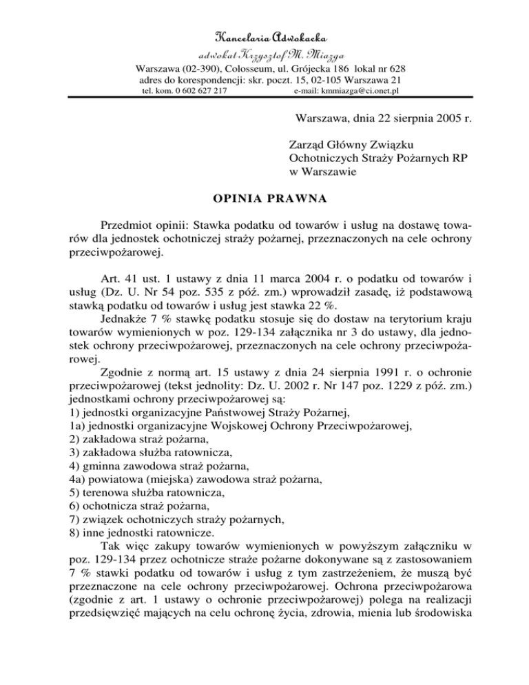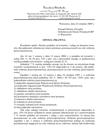 Kancelaria Adwokacka adwokat Krzysztof M. Miazga Warszawa (02-390), Colosseum, ul. Grójecka 186 lokal nr 628 adres do korespondencji: skr. poczt. 15, 02-105 Warszawa 21 tel. kom. 0 602 627 217 e-mail: [email protected] Warszawa, dnia 22 sierpnia 2005 r. Zarząd Główny Związku Ochotniczych Straży Pożarnych RP w Warszawie OPINIA PRAWNA Przedmiot opinii: Stawka podatku od towarów i usług na dostawę towarów dla jednostek ochotniczej straży pożarnej, przeznaczonych na cele ochrony przeciwpożarowej. Art. 41 ust. 1 ustawy z dnia 11 marca 2004 r. o podatku od towarów i usług (Dz. U. Nr 54 poz. 535 z póź. zm.) wprowadził zasadę, iż podstawową stawką podatku od towarów i usług jest stawka 22 %. Jednakże 7 % stawkę podatku stosuje się do dostaw na terytorium kraju towarów wymienionych w poz. 129-134 załącznika nr 3 do ustawy, dla jednostek ochrony przeciwpożarowej, przeznaczonych na cele ochrony przeciwpożarowej. Zgodnie z normą art. 15 ustawy z dnia 24 sierpnia 1991 r. o ochronie przeciwpożarowej (tekst jednolity: Dz. U. 2002 r. Nr 147 poz. 1229 z póź. zm.) jednostkami ochrony przeciwpożarowej są: 1) jednostki organizacyjne Państwowej Straży Pożarnej, 1a) jednostki organizacyjne Wojskowej Ochrony Przeciwpożarowej, 2) zakładowa straż pożarna, 3) zakładowa służba ratownicza, 4) gminna zawodowa straż pożarna, 4a) powiatowa (miejska) zawodowa straż pożarna, 5) terenowa służba ratownicza, 6) ochotnicza straż pożarna, 7) związek ochotniczych straży pożarnych, 8) inne jednostki ratownicze. Tak więc zakupy towarów wymienionych w powyższym załączniku w poz. 129-134 przez ochotnicze straże pożarne dokonywane są z zastosowaniem 7 % stawki podatku od towarów i usług z tym zastrzeżeniem, że muszą być przeznaczone na cele ochrony przeciwpożarowej. Ochrona przeciwpożarowa (zgodnie z art. 1 ustawy o ochronie przeciwpożarowej) polega na realizacji przedsięwzięć mających na celu ochronę życia, zdrowia, mienia lub środowiska 2 przed pożarem, klęską żywiołową lub innym miejscowym zagrożeniem poprzez: 1) zapobieganie powstawaniu i rozprzestrzenianiu się pożaru, klęski żywiołowej lub innego miejscowego zagrożenia, 2) zapewnienie sił i środków do zwalczania pożaru, klęski żywiołowej lub innego miejscowego zagrożenia, 3) prowadzenie działań ratowniczych. Rozwinięcie definicji ochrony przeciwpożarowej znajduje się w art. 2 ustawy o ochronie przeciwpożarowej, która definiuje szereg pojęć z punktu widzenia ustawy zakreślając w ten sposób bardzo szeroko ramy pojęcia ochrony przeciwpożarowej. Wyrażony ostatnio w prasie odosobniony pogląd, iż poz. 134 pkt 2 załącznika nr 3 do ustawy o podatku od towarów i usług nie ma zastosowania do strażaków OSP nie znajduje prawnego uzasadnienia. W myśl tego zapisu stawkę 7 % podatku od towarów i usług stosuje się do towarów przeznaczonych na cele ochrony przeciwpożarowej w postaci: umundurowania, odzieży specjalnej i ochronnej, wyekwipowania osobistego strażaka państwowej straży pożarnej według obowiązujących norm i wyposażenia specjalistycznego strażaka oraz odznak, odznaczeń i dystynkcji. Zapis ma charakter listy. W podobny sposób (w postaci list) ukształtowane są zapisy innych pozycji załącznika. Pozycje i punkty wyodrębniane są z punktu widzenia pokrewieństwa towarów (usług) tam umieszczanych. Używane spójniki łączne (i, oraz) w poszczególnych pozycjach listy nie mogą być traktowane w kategoriach logicznej koniunkcji lecz jako forma oddzielenia poszczególnych pozycji listy. Podobnie jest np. w poz. 134 pkt 1. Załącznik nr 3 w poz. 134 pkt 2 odnosi się do strażaka Państwowej Straży Pożarnej tylko w jednym wypadku, tj. w odniesieniu do wyekwipowania osobistego strażaka państwowej straży pożarnej według obowiązujących norm. Pozostałe towary wymienione w tym punkcie odnoszą się zarówno do strażaków PSP jak i OSP. Nie jest przy tym uprawniony pogląd, iż członków OSP nie można uważać za strażaków. Ustawa o podatku od towarów i usług nie zawiera w art. 2 (na swój użytek) ustawowej definicji słowa strażak. Tym samym słowo te powinno być interpretowane w rozumieniu stosowanym w języku polskim. Za słownikiem języka polskiego „strażak” to członek straży pożarnej. Tak więc obejmuje on swoim zakresem zarówno strażaków PSP, OSP jak też i innych jednostek ochrony przeciwpożarowej. Krzysztof M. Miazga adwokat