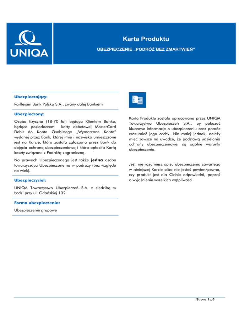 Karta Produktu UBEZPIECZENIE „PODRÓŻ BEZ ZMARTWIEŃ” Ubezpieczający: Raiffeisen Bank Polska S.A., zwany dalej Bankiem Ubezpieczony: Osoba fizyczna (18-70 lat) będąca Klientem Banku, będąca posiadaczem karty debetowej MasterCard Debit do Konta Osobistego „Wymarzone Konto” wydanej przez Bank, której imię i nazwisko umieszczone jest na Karcie, która została zgłoszona przez Bank do objęcia ochroną ubezpieczeniową i która opłaciła Kartą koszty związane z Podróżą zagraniczną. Na prawach Ubezpieczonego jest także jedna osoba towarzysząca Ubezpieczonemu w podróży (bez względu na wiek). Ubezpieczyciel: Karta Produktu została opracowana przez UNIQA Towarzystwo Ubezpieczeń S.A., by pokazać kluczowe informacje o ubezpieczeniu oraz pomóc zrozumieć jego cechy. Nie mniej jednak, należy mieć zawsze na uwadze, że podstawą udzielania ochrony ubezpieczeniowej są ogólne warunki ubezpieczenia. Jeśli nie rozumiesz opisu ubezpieczenia zawartego w niniejszej Karcie albo nie jesteś pewien/pewna, czy produkt jest dla Ciebie odpowiedni, poproś o wyjaśnienie wszelkich wątpliwości. UNIQA Towarzystwo Ubezpieczeń S.A. z siedzibą w Łodzi przy ul. Gdańskiej 132 Forma ubezpieczenia: Ubezpieczenie grupowe Strona 1 z 6 1. Przystąpienie do grupowej umowy ubezpieczenia Umowa ubezpieczenia grupowego została zawarta pomiędzy UNIQA TU S.A. i Bankiem. Umowa została zawarta na rachunek Klientów Banku - posiadaczy karty debetowej MasterCard Debit do Konta Osobistego „Wymarzone Konto”. Klienci banku nie składają żadnych oświadczeń woli dotyczących przystąpienia do ubezpieczenia. Bank „obligatoryjnie” zgłasza do objęcia ochroną wszystkich posiadaczy ww. Karty i opłaca należną składkę ubezpieczeniową. 2. Przedmiot i zakres ochrony ubezpieczeniowej Ochrona ubezpieczeniowa jest udzielana w trakcie Podróży zagranicznej. Podróż zagraniczna to pobyt Ubezpieczonego poza granicami RP lub Kraju zamieszkania Ubezpieczonego. Za początek Podróży zagranicznej uznaje się moment przekroczenia granicy RP przy wyjeździe, a za koniec – moment przekroczenia granicy RP lub Kraju zamieszkania przy powrocie. Przedmiotem ochrony ubezpieczeniowej są: 1. Następstwa nieszczęśliwych wypadków, tj. Śmierć Trwałe uszczerbek na zdrowiu 2. Koszty leczenia i usług assistance 3. Odpowiedzialność cywilna w życiu prywatnym 3. Podstawowe informacje dotyczące udzielania ochrony ubezpieczeniowej 1. Warunkiem objęcia ochroną jest: a) opłacenie kartą kosztów podróży: koszt wycieczki, koszt biletu na podróż, koszt zakwaterowania za granicą w hotelu, hostelu, pensjonacie lub b) dokonanie płatności za towary / przedmioty związane z podróżą: na 24h przed rozpoczęciem lub 24h po rozpoczęciu podróży, tj. po przekroczeniu granicy RP (po opuszczeniu pokładu samolotu) na kwotę 50 EUR lub jej równowartość. 2. Ochrona następuje od momentu przekroczenia granicy RP lub kraju zamieszkania do powrotu. 3. Ochrona trwa aż do 30 dni podróży zagranicznej – w ramach jednej podróży. 4. Ochrona ubezpieczeniowa działa na całym świecie. 5. Ubezpieczenie dotyczy nieograniczonej liczby wyjazdów prywatnych i służbowych. Strona 2 z 6 4. Następstwa nieszczęśliwych wypadków – informacje szczegółowe Suma ubezpieczenia (wysokość świadczeń) Zakres ubezpieczenia Ubezpieczony Osoba towarzysząca Śmierć w następstwie Nieszczęśliwego wypadku 50.000zł 50.000zł Trwały uszczerbek na zdrowiu w następstwie Nieszczęśliwego wypadku z uwzględnieniem limitów określonych w Tabeli nr 3 w OWU 50.000zł 50.000zł Świadczenie z tytułu zgonu w następstwie nieszczęśliwego wypadku wypłacane jest, jeżeli Ubezpieczony zmarł wskutek Nieszczęśliwego wypadku przed upływem 1 roku od chwili Nieszczęśliwego wypadku oraz o ile wcześniej nie zostało wypłacone świadczenie z tytułu Trwałego uszczerbku na zdrowiu. Jeżeli świadczenie z tytułu Trwałego uszczerbku na zdrowiu zostało już wypłacone, to świadczenie na wypadek zgonu zostaje pomniejszone o kwotę wypłaconego świadczenia z tego tytułu. Wysokość świadczeń za Trwały uszczerbek na zdrowiu w następstwie nieszczęśliwego wypadku: L.p. Rodzaj uszkodzenia organu lub funkcji organizmu w przypadku Trwałego inwalidztwa % sumy ubezpieczenia 1. Utrata wzroku w obojgu oczach 100 2. Utrata kończyny górnej i kończyny dolnej 100 3. Utrata obu przedramion lub obu kończyn górnych 100 4. Utrata kończyny górnej i całkowita utrata wzroku w jednym oku 100 5. Utrata kończyny dolnej i całkowita utrata wzroku w jednym oku 100 6. Utrata obu kończyn dolnych 100 7. Utrata kończyny górnej 50 8. Całkowita utrata wzroku w jednym oku 50 9. Utrata kończyny dolnej 50 Łączna wysokość świadczeń z tytułu Trwałego uszczerbku na zdrowiu (a także zgonu) nie może przekroczyć 100% Sumy ubezpieczenia. 5. Koszty leczenia i usługi assistance - informacje szczegółowe Ochrona obejmuje niezbędne, celowe i prawidłowo udokumentowane Koszty leczenia poniesione przez Ubezpieczonego w zakresie niezbędnym do przywrócenia jego stanu zdrowia umożliwiającego jego powrót lub transport do Kraju zamieszkania lub Miejsca zamieszkania albo placówki medycznej na terytorium RP. Strona 3 z 6 Zdarzenia podlegające ochronie ubezpieczeniowej: wystąpienie Nieszczęśliwego wypadku nagłe zachorowania usługi assistance Wykaz zakresu kosztów leczenia i limitów odpowiedzialności: Sumy ubezpieczenia L.p. Zakres ubezpieczenia 1. Koszty stacjonarnego leczenia szpitalnego 2. Koszty leczenia ambulatoryjnego 3. Koszty akcji ratowniczej w tym koszty poszukiwania i ratownictwa w górach i na morzu 4. Badania i zabiegi zalecane przez lekarza 5. Konsultacje lekarskie 6. Honoraria lekarskie 7. Dojazd lekarza z najbliższej placówki medycznej 8. 9. 10. 11. Zakup płynów infuzyjnych, lekarstw, środków opatrunkowych, pomocniczych środków ortopedycznych Transport Ubezpieczonego z miejsca zachorowania lub wyp
